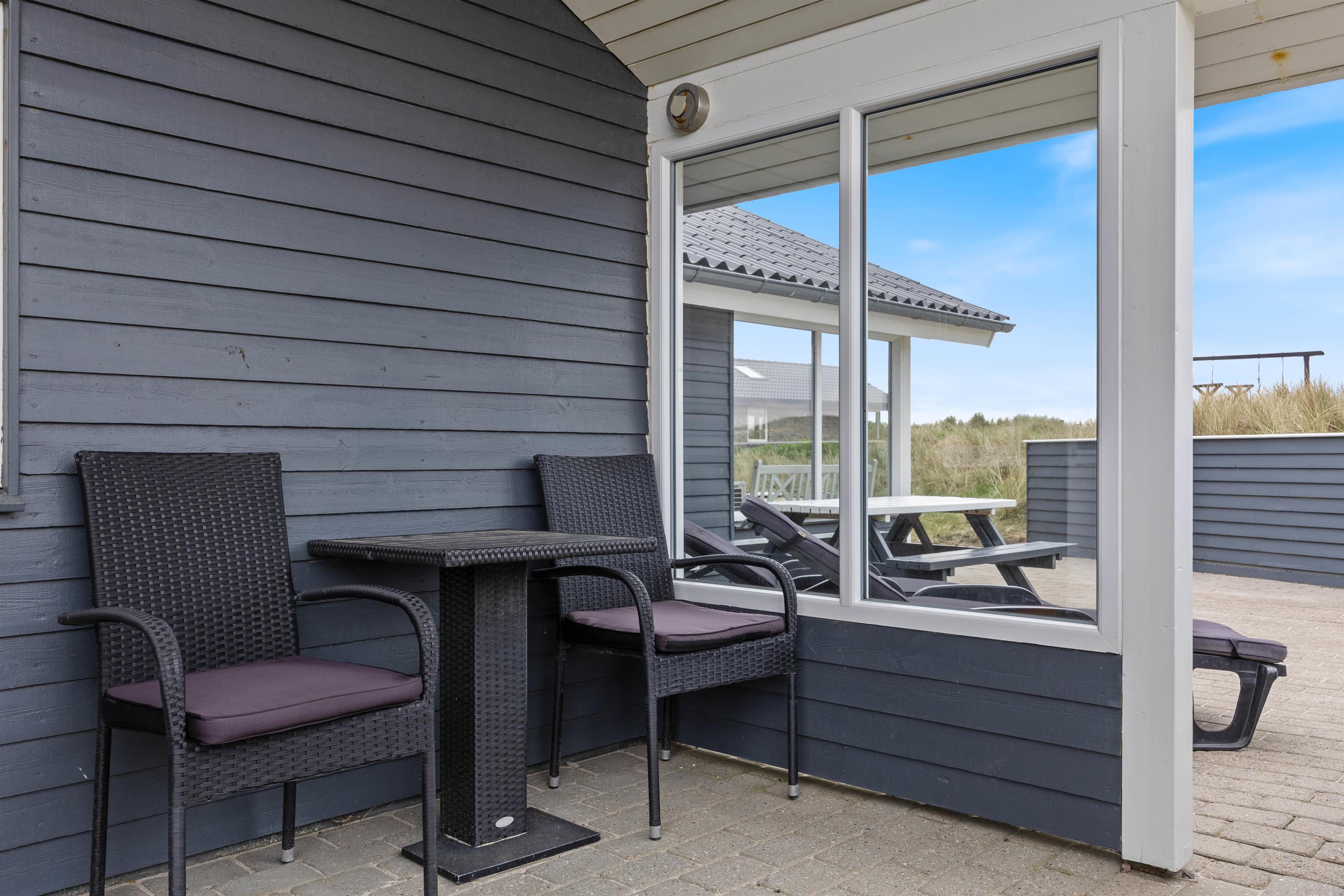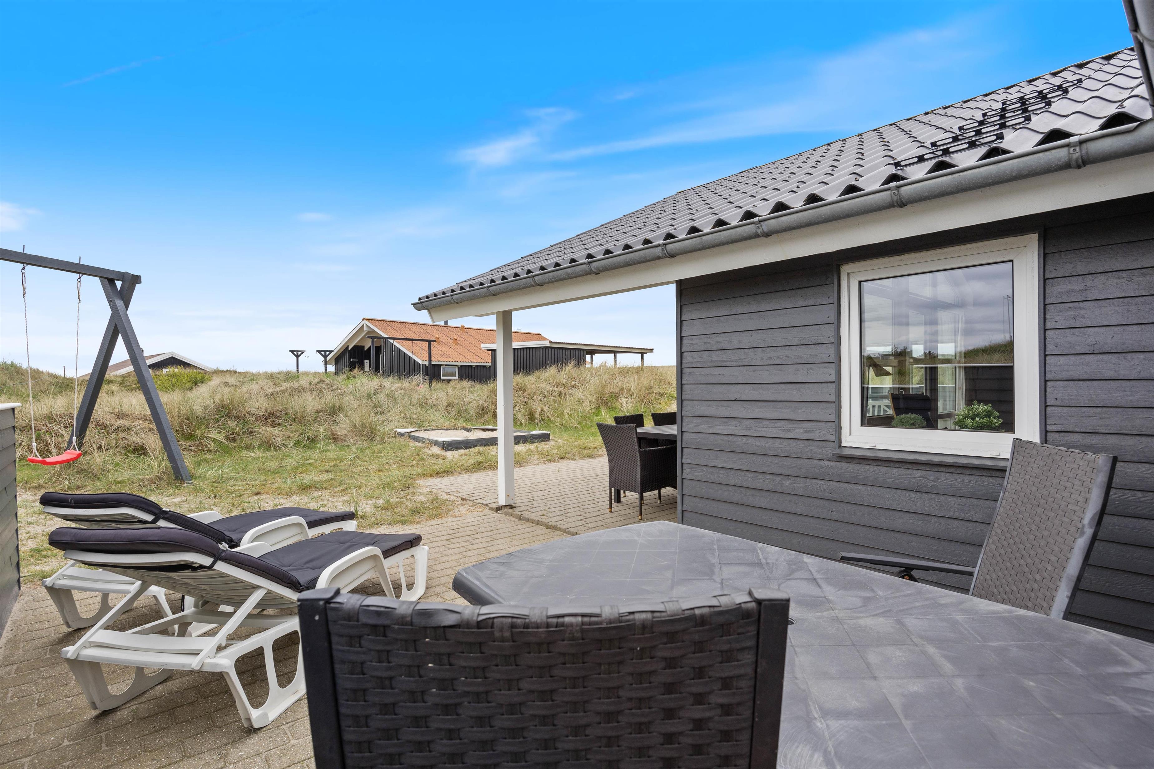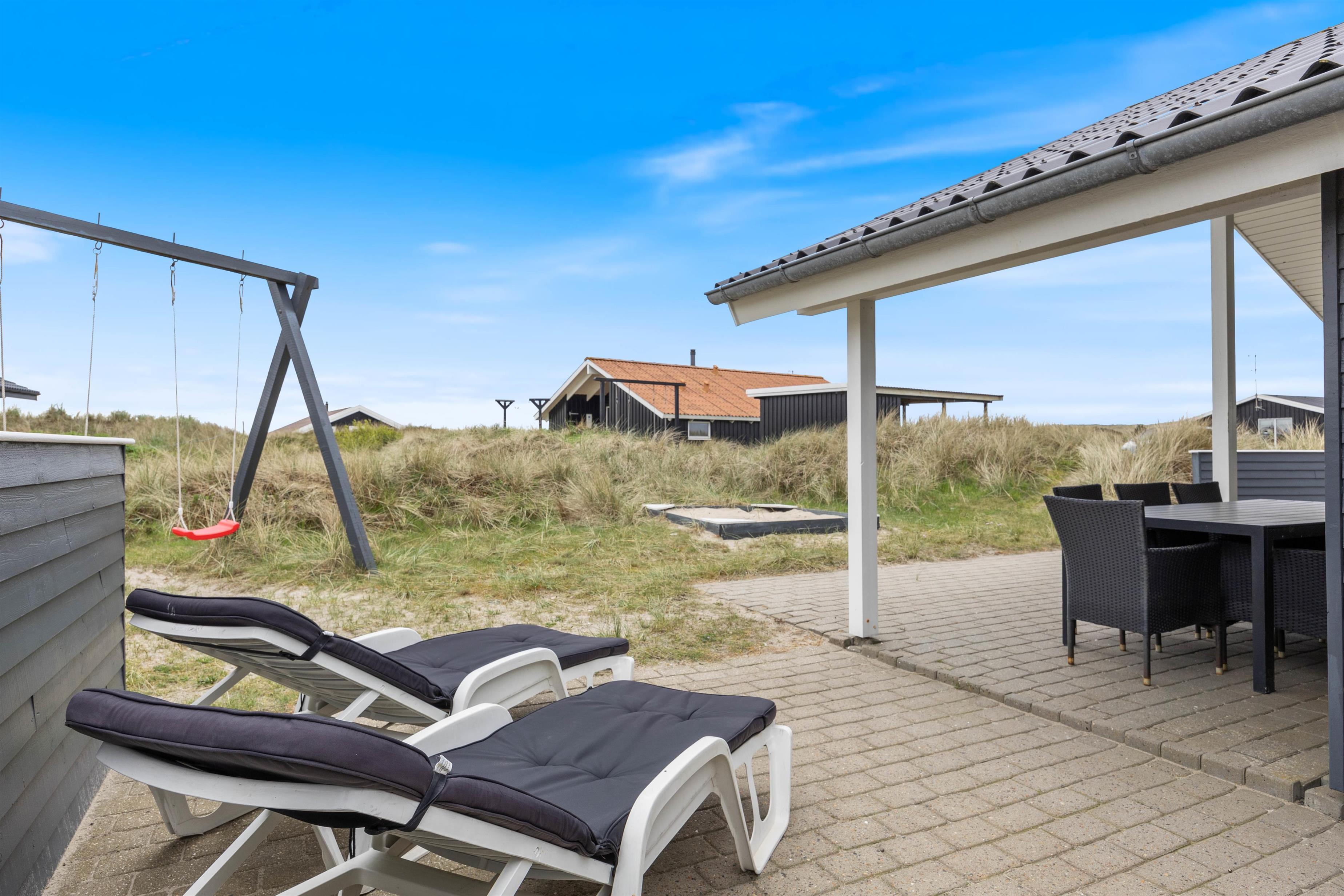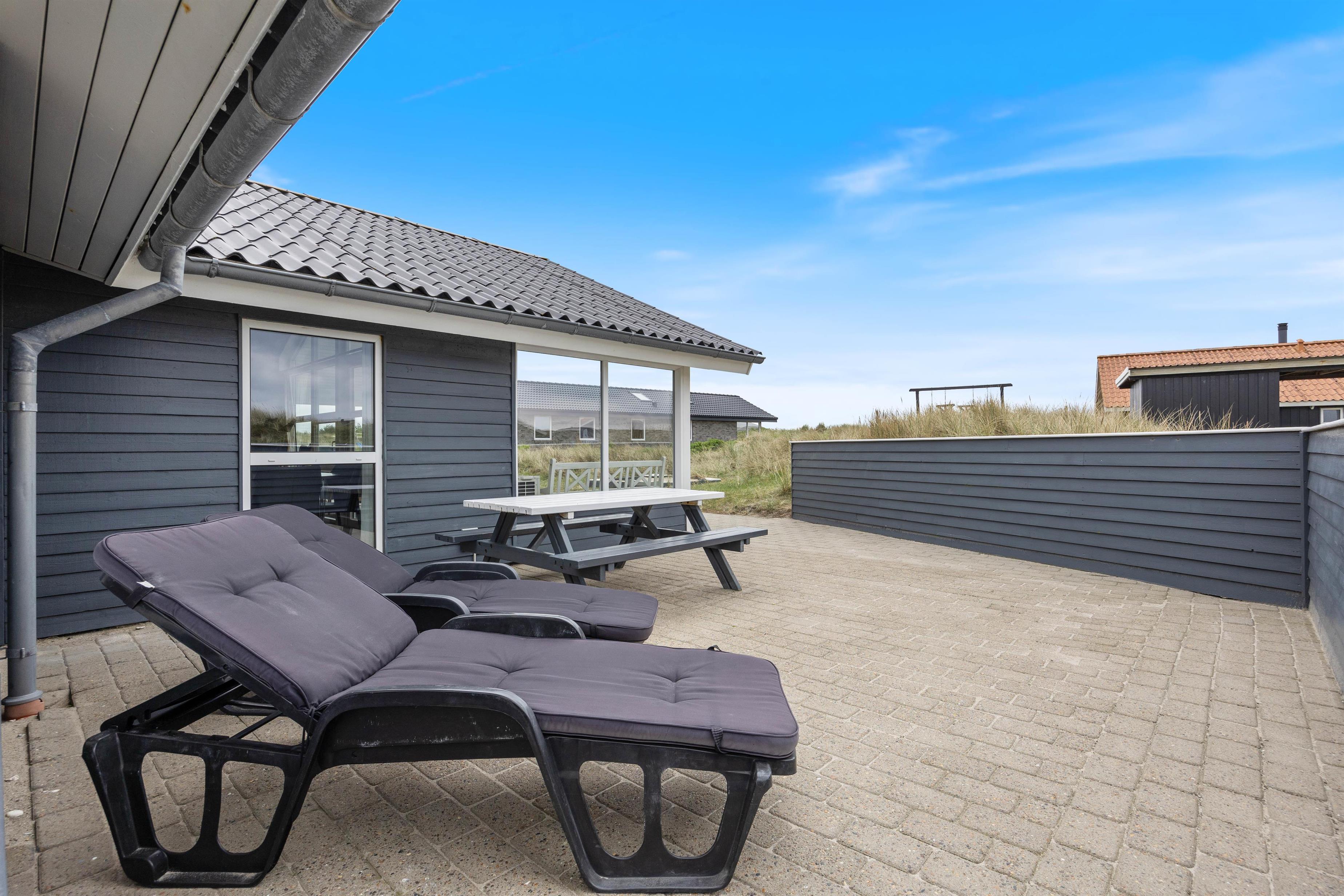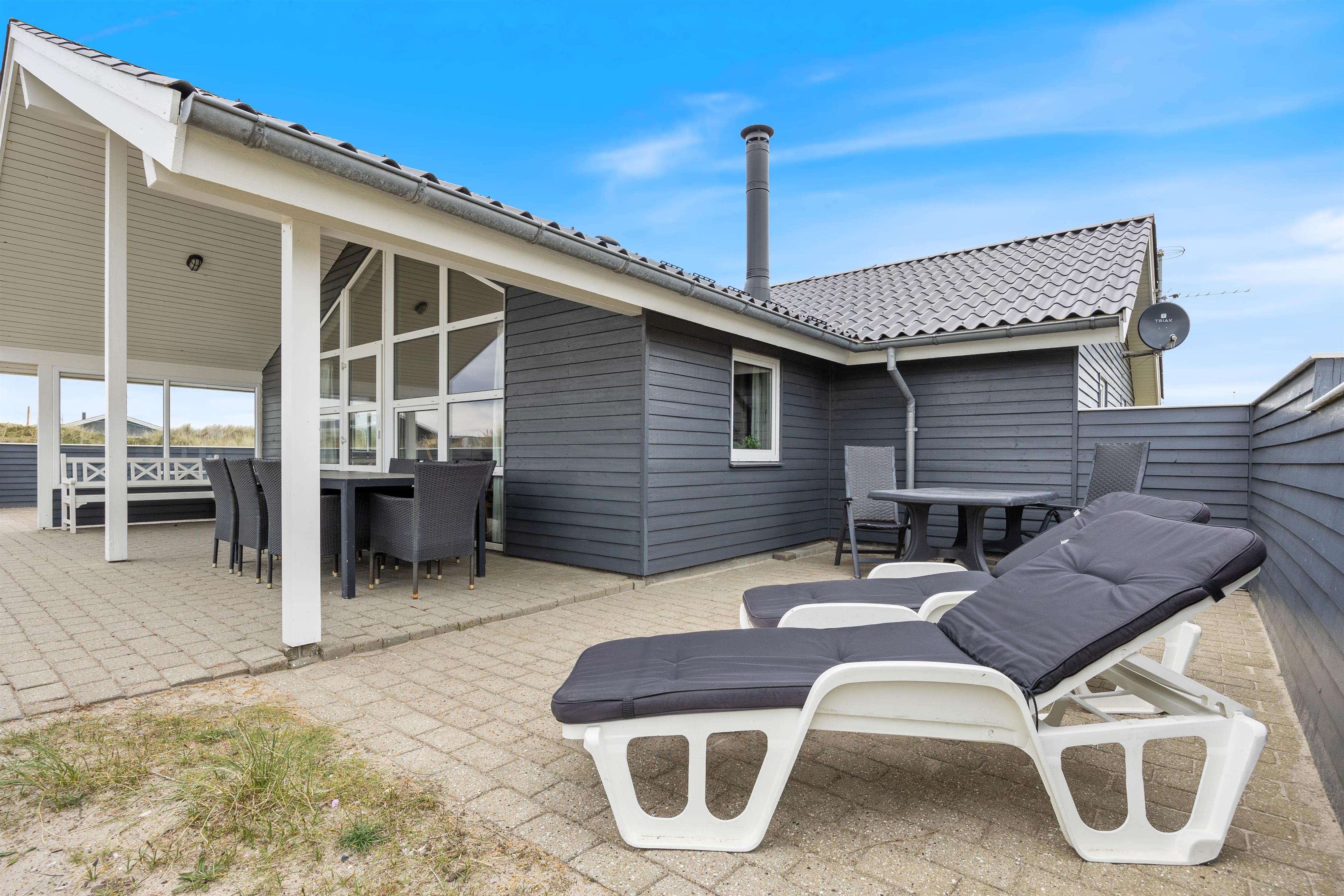 Ved feriehuset er der afskærmede og delvist overdækkede terrasser, som er udstyret med gode havemøbler og liggestole, så du også her kan slappe af i solen. Og naturligvis er der også en grill til de kulinariske tryllerier på hyggelige grillaftener.