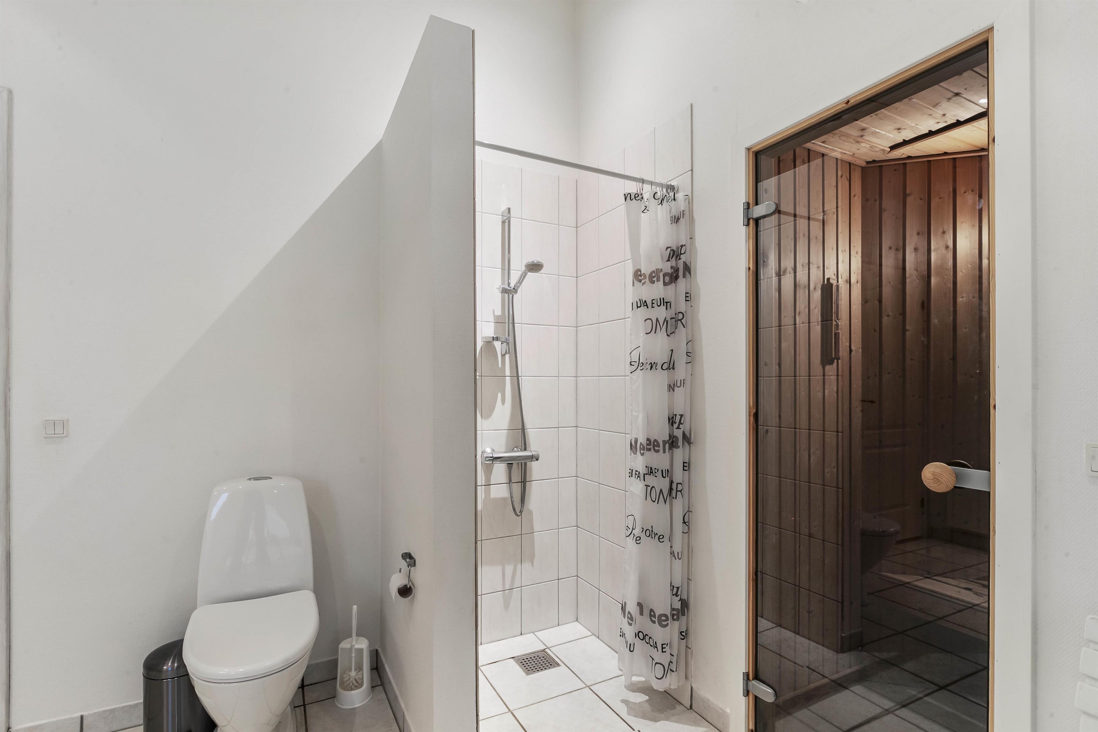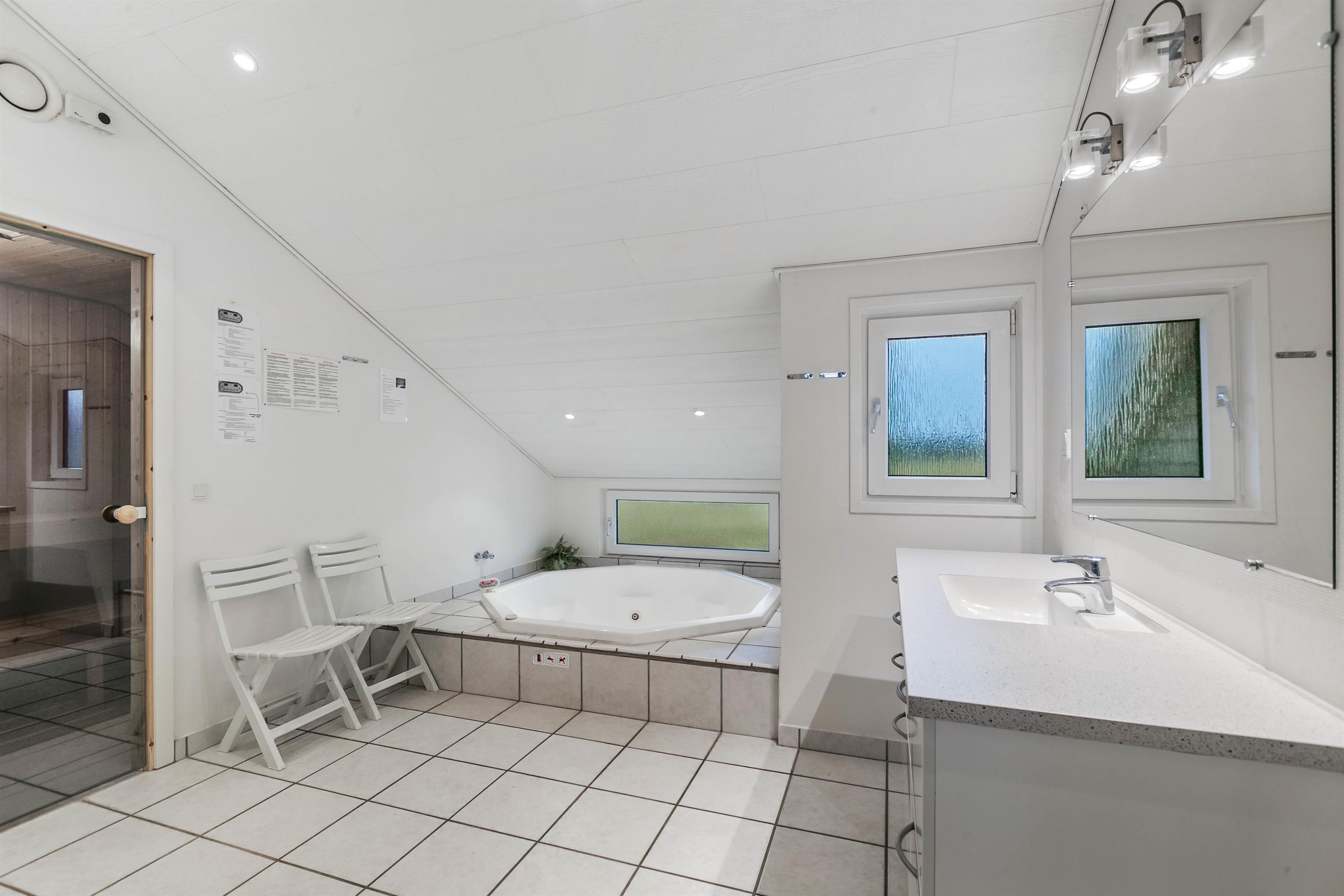 For optimal afslapning står det store 6 personers standvandsspa og den rummelige sauna til rådighed i wellness-afdelingen, som I finder på det ene badeværelse. Som et ekstra plus er der nemlig 2 badeværelser i sommerhuset, så der ikke opstår kø om morgenen. Der er gulvvarme på begge badeværelser, og I sommerhuset finder i desuden både vaskemaskine og tørretumbler.