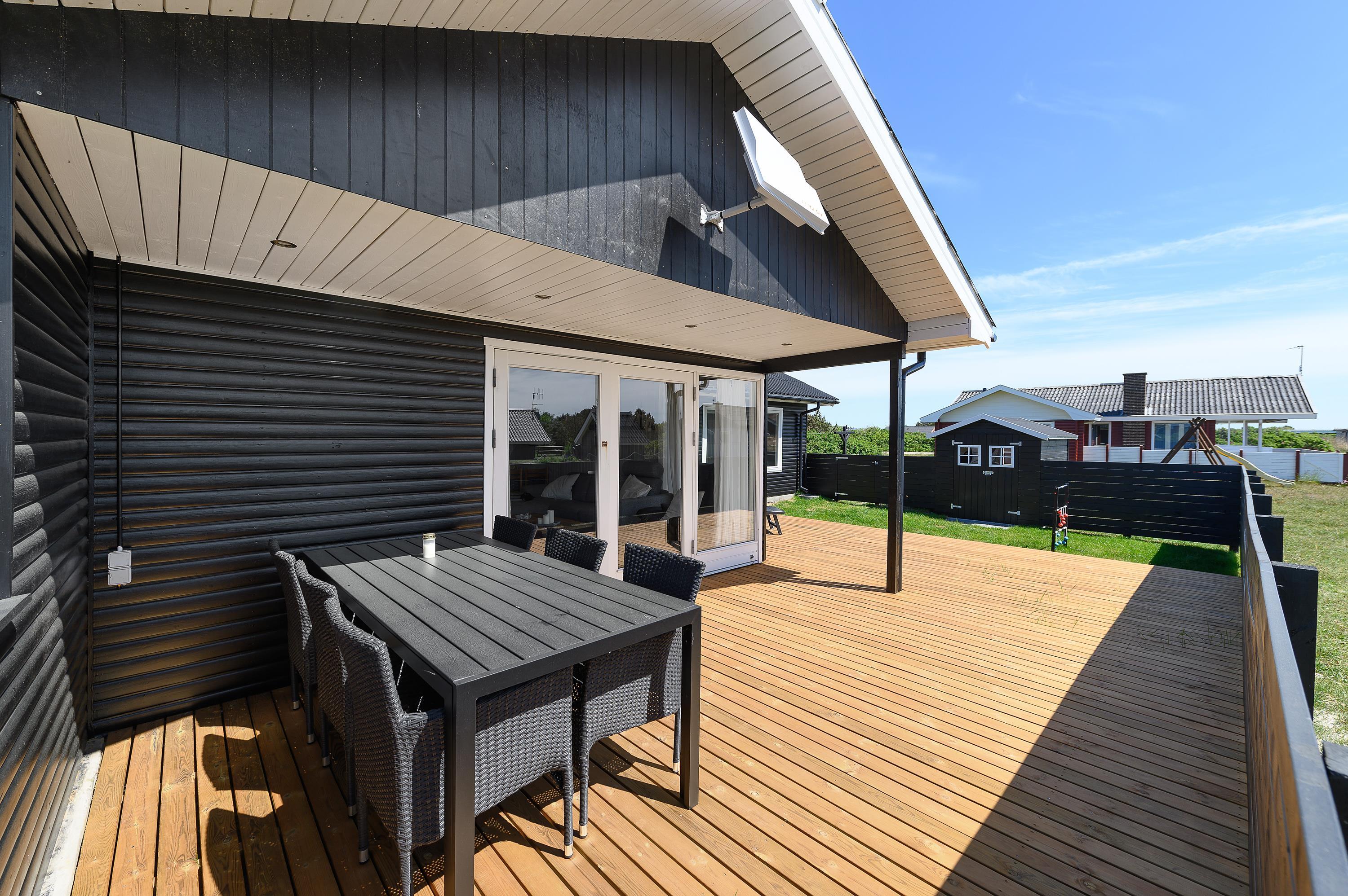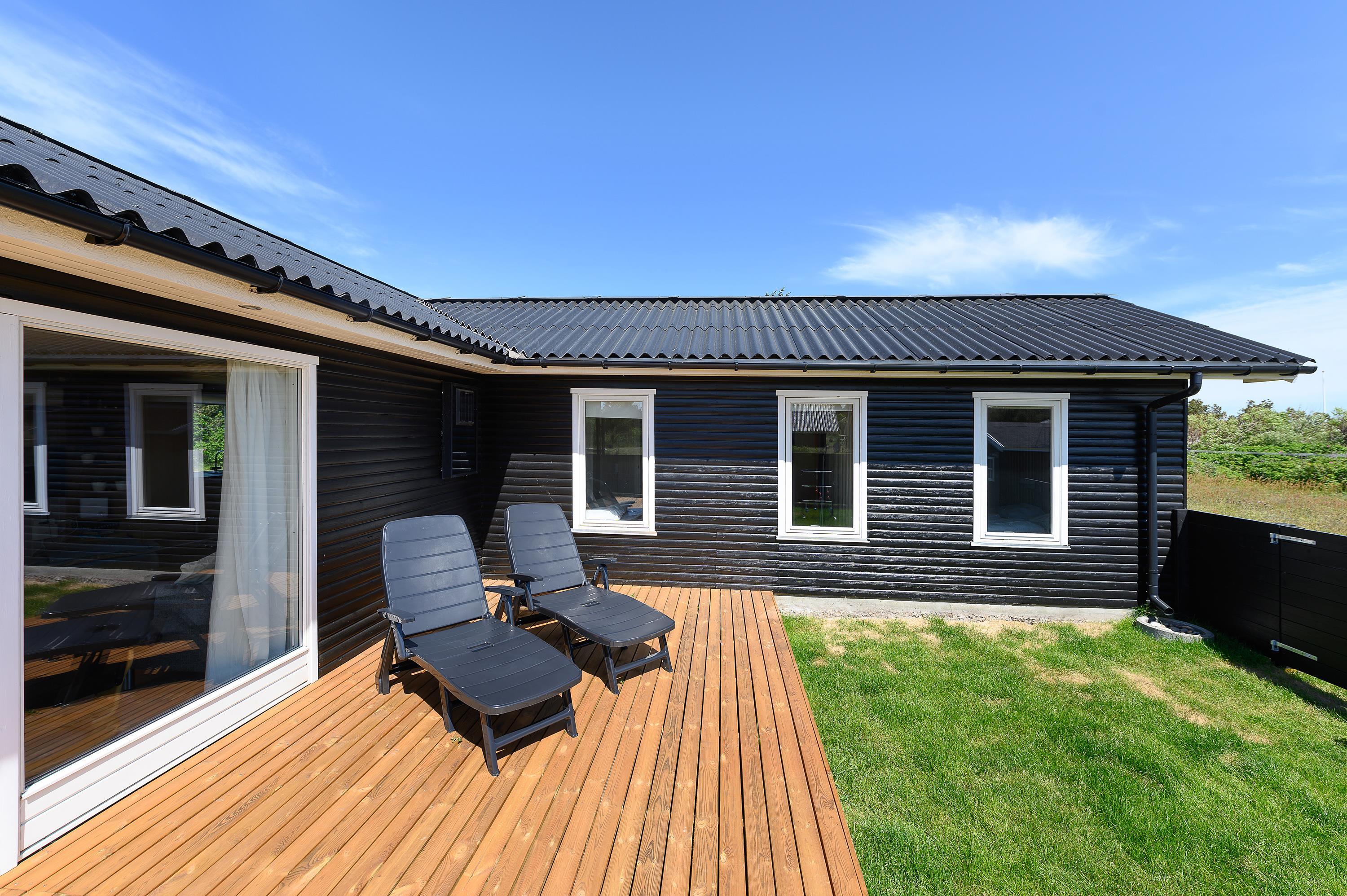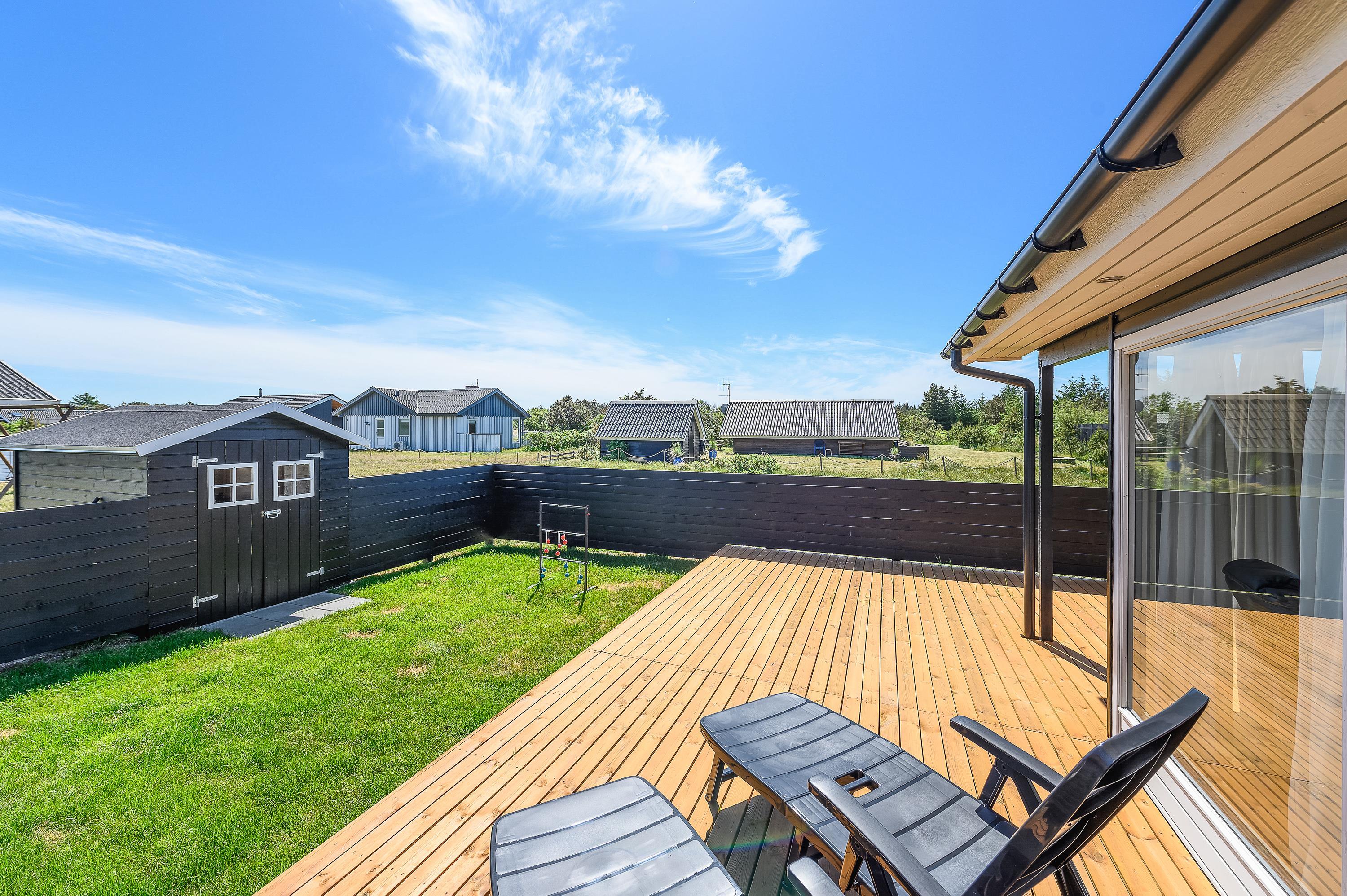 Udenfor på den 1203m² store naturgrund får I rig mulighed for at nyde den friske luft og den smukke natur omkring jer. Sommerhuset har en afskærmet, lukket og overdækket terrasse, hvor I kan slappe af i al slags vejr. Dette feriehus i Bjerregård giver perfekte muligheder for både afslapning og eventyr i de naturskønne omgivelser.