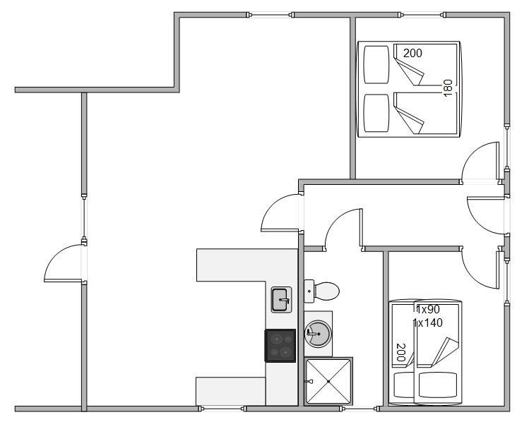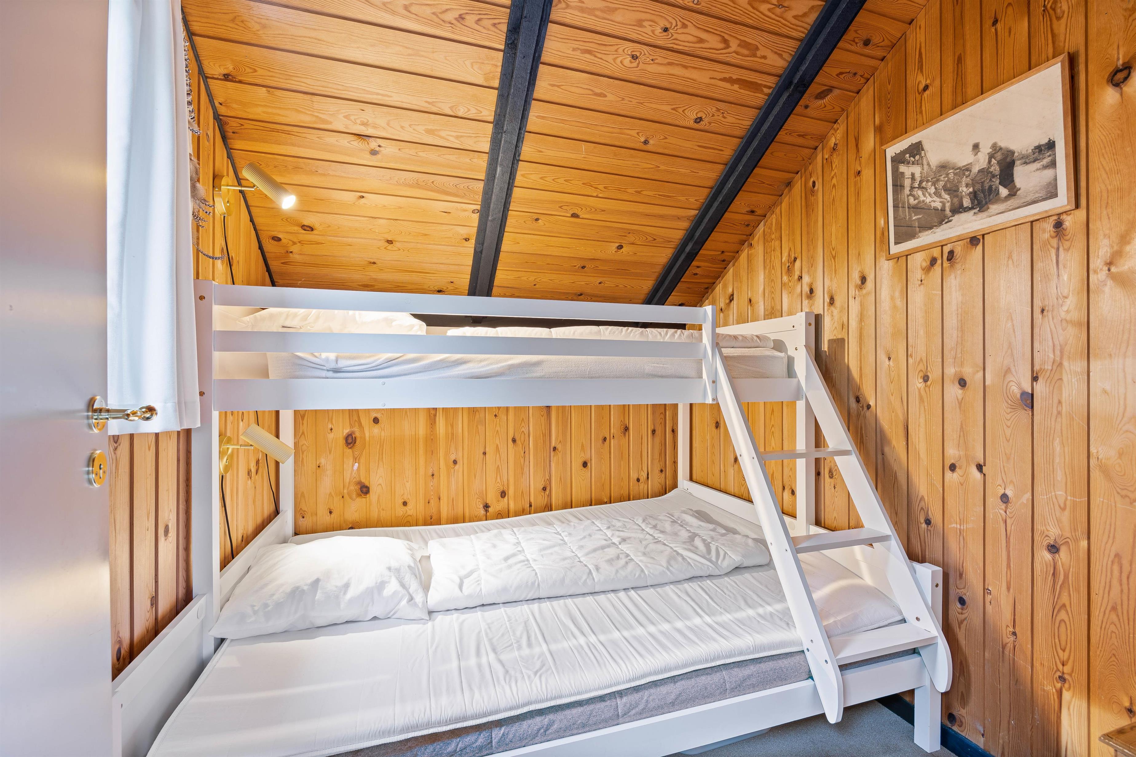 De 2 soveværelser er indrettet med henholdsvis en dobbeltseng og en køjeseng.