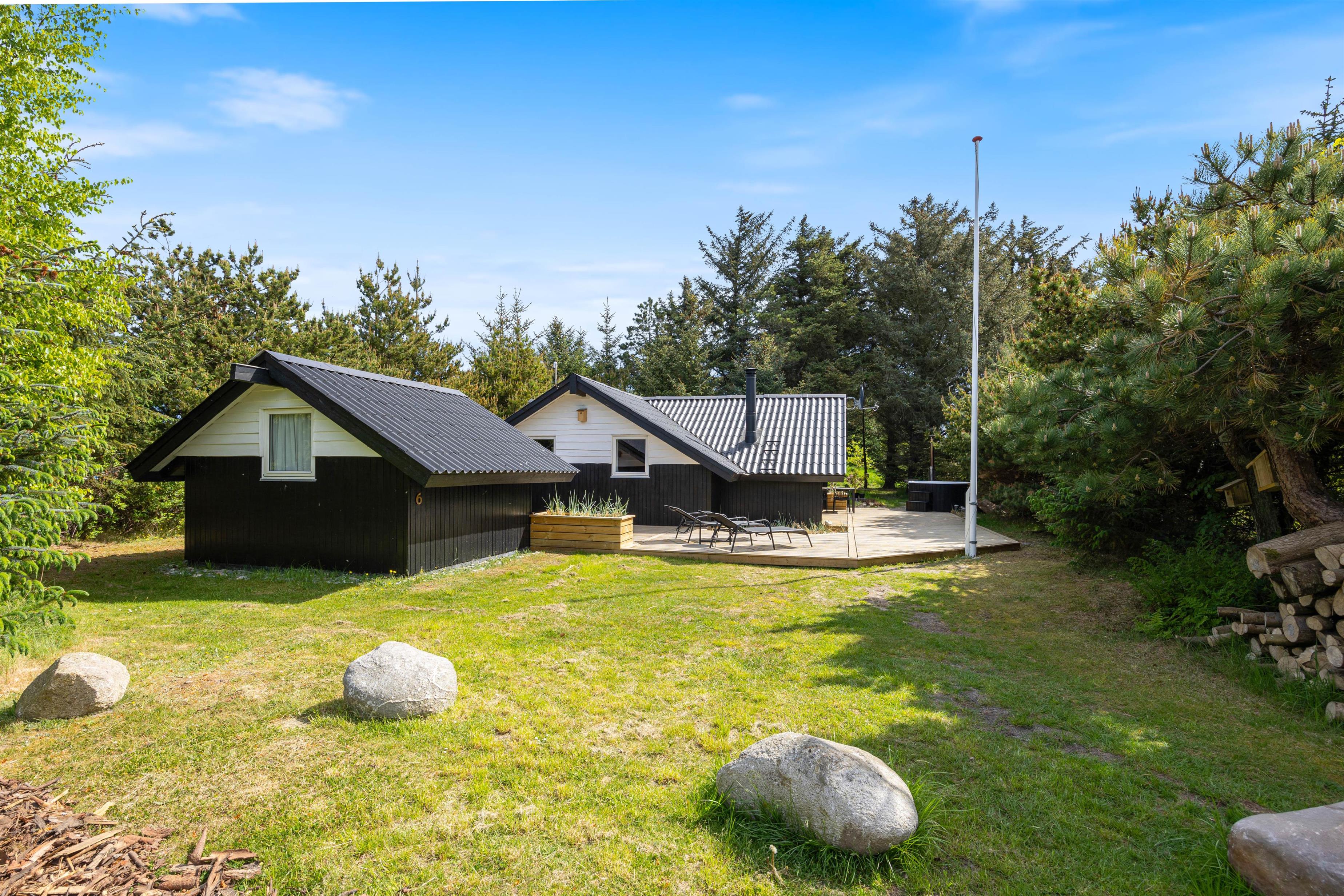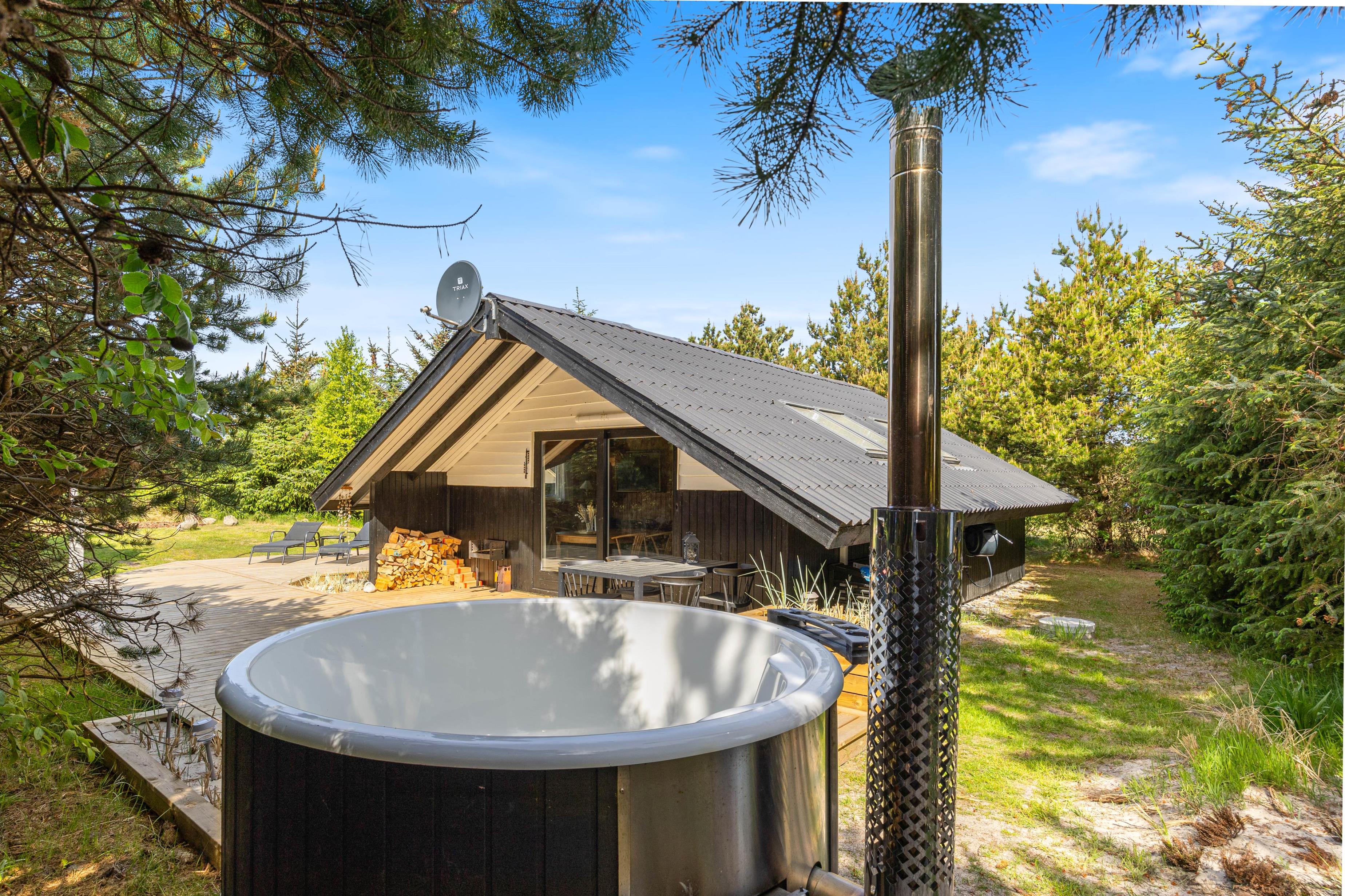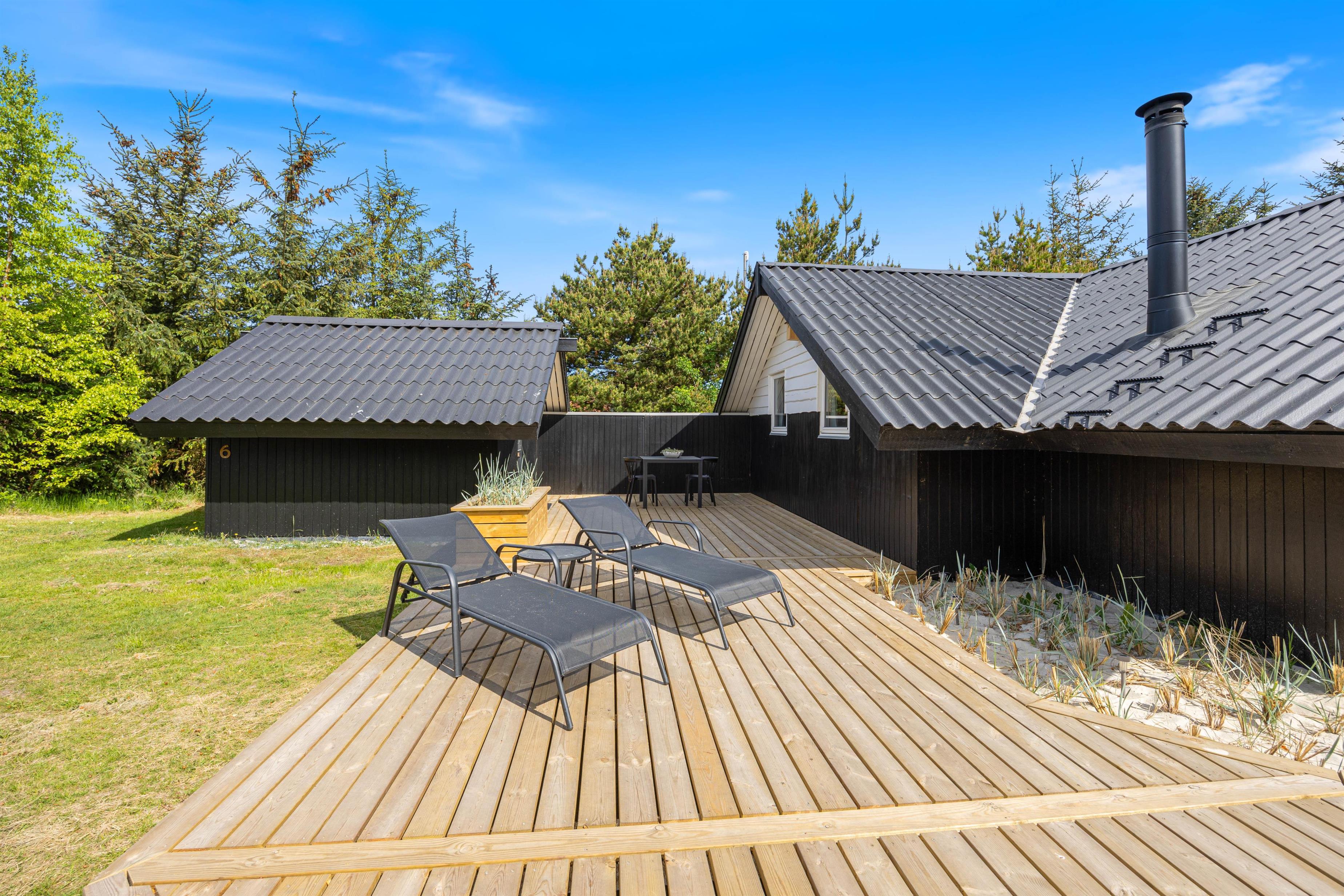Terrassen har både en åben og en afskærmet del, og noget af den er også overdækket, så I kan altid finde en rolig plet ved sommerhuset. Slap af på liggestolene eller nyd udelivet i de komfortable havemøbler. Tænd op i grillen og slut dagen af med et lækkert grillmåltid sammen, imens skyggerne bliver lange. I har stadig en frisk gåtur ned til stranden – eventuelt sammen med hunden – til gode. Her kan I opleve en af Danmarks skønneste solnedgange.