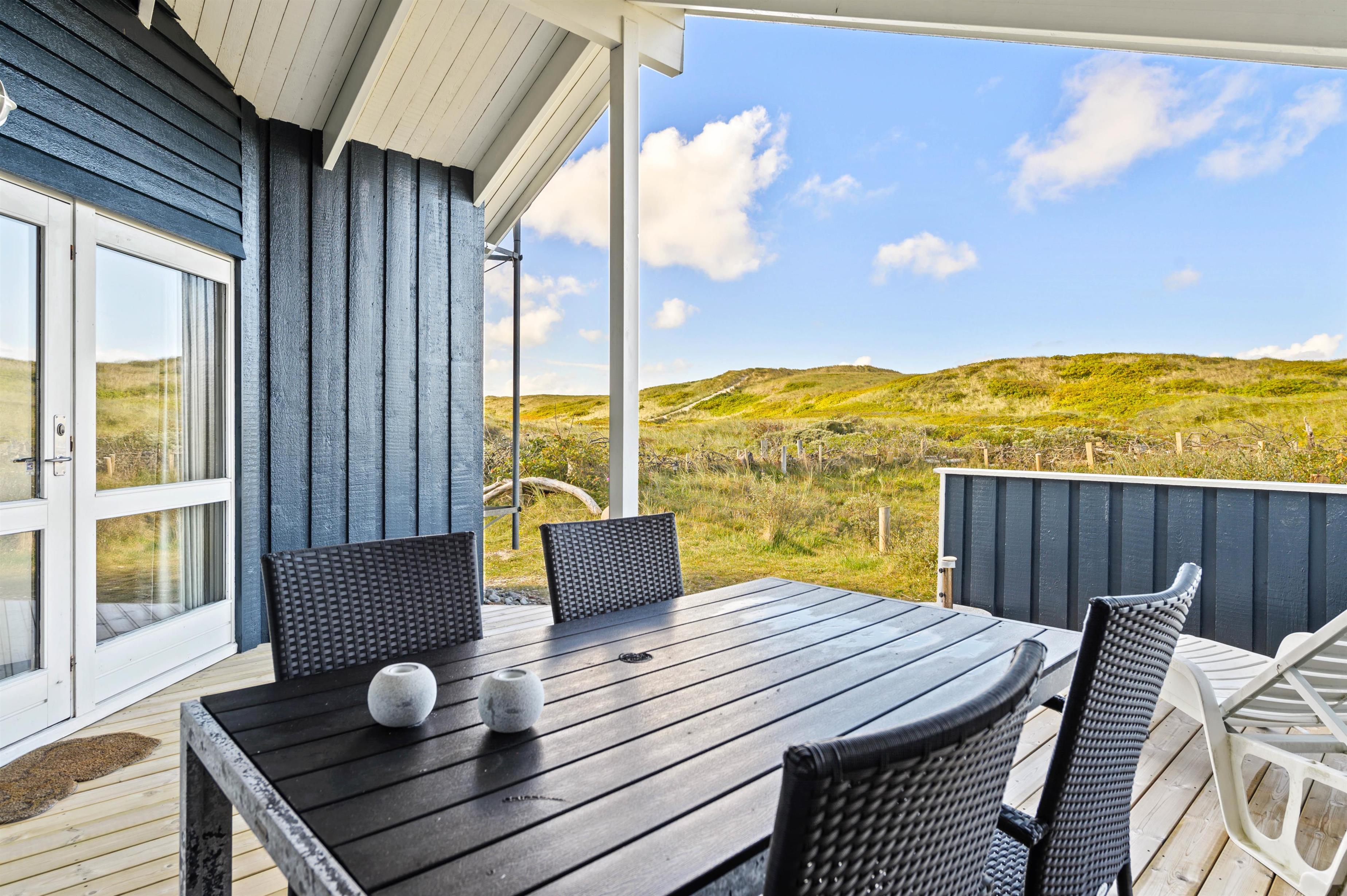 Det smukke udeareal på Arvidvej 88 byder på en rummelig terrasse, som er delvist afskærmet og overdækket, så du kan altid finde et hyggeligt sted i den friske luft. Lyt til lyden af ??havet og nyd den vidunderlige udsigt fra dit klitsommerhus.