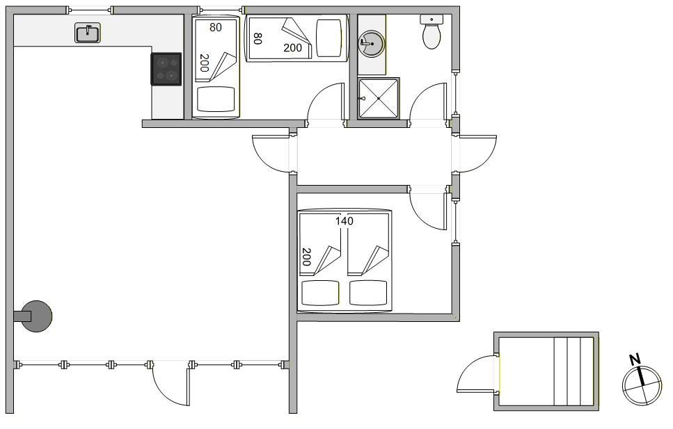 Feriehuset er traditionelt indrettet og her kan bo op mod 4 gæster samt deres firbenede ven. Her er hvad man har brug for at holde ferie. De varme træsorter på lofter og gulve skaber næsten fornemmelsen af en hule. Planløsningen byder på et fint lille badeværelse, 2 soveværelser samt en stue med åben forbindelse til køkken.