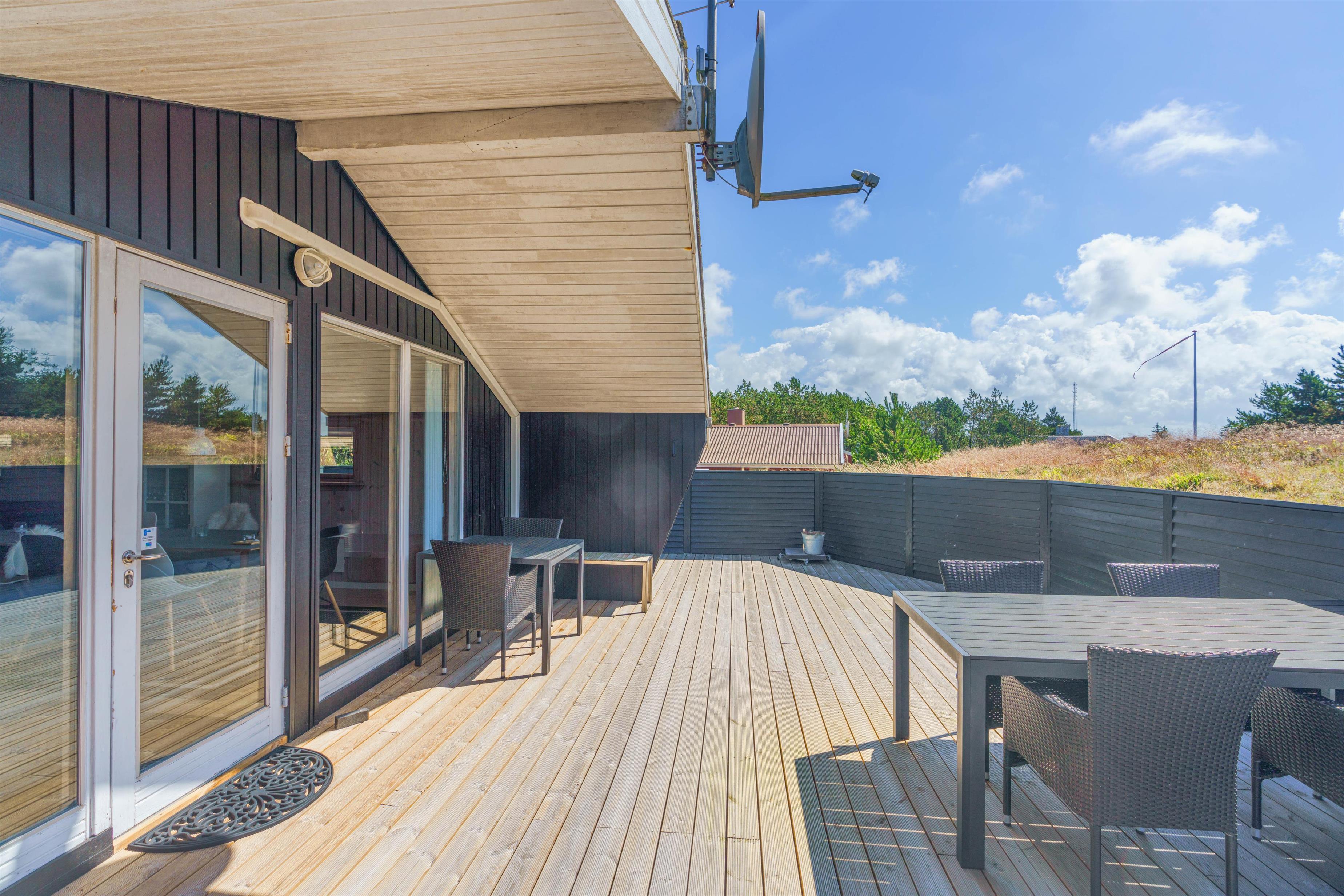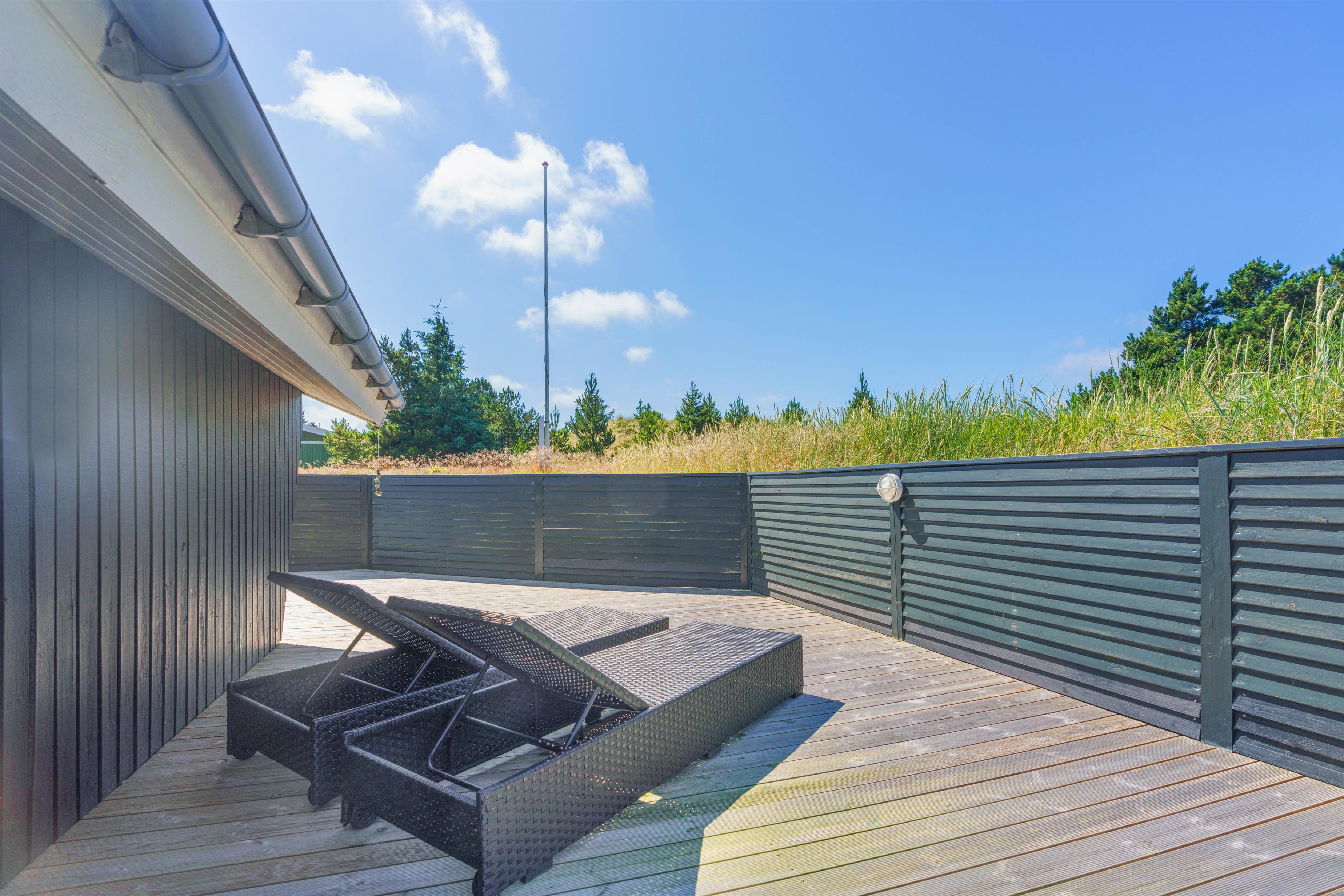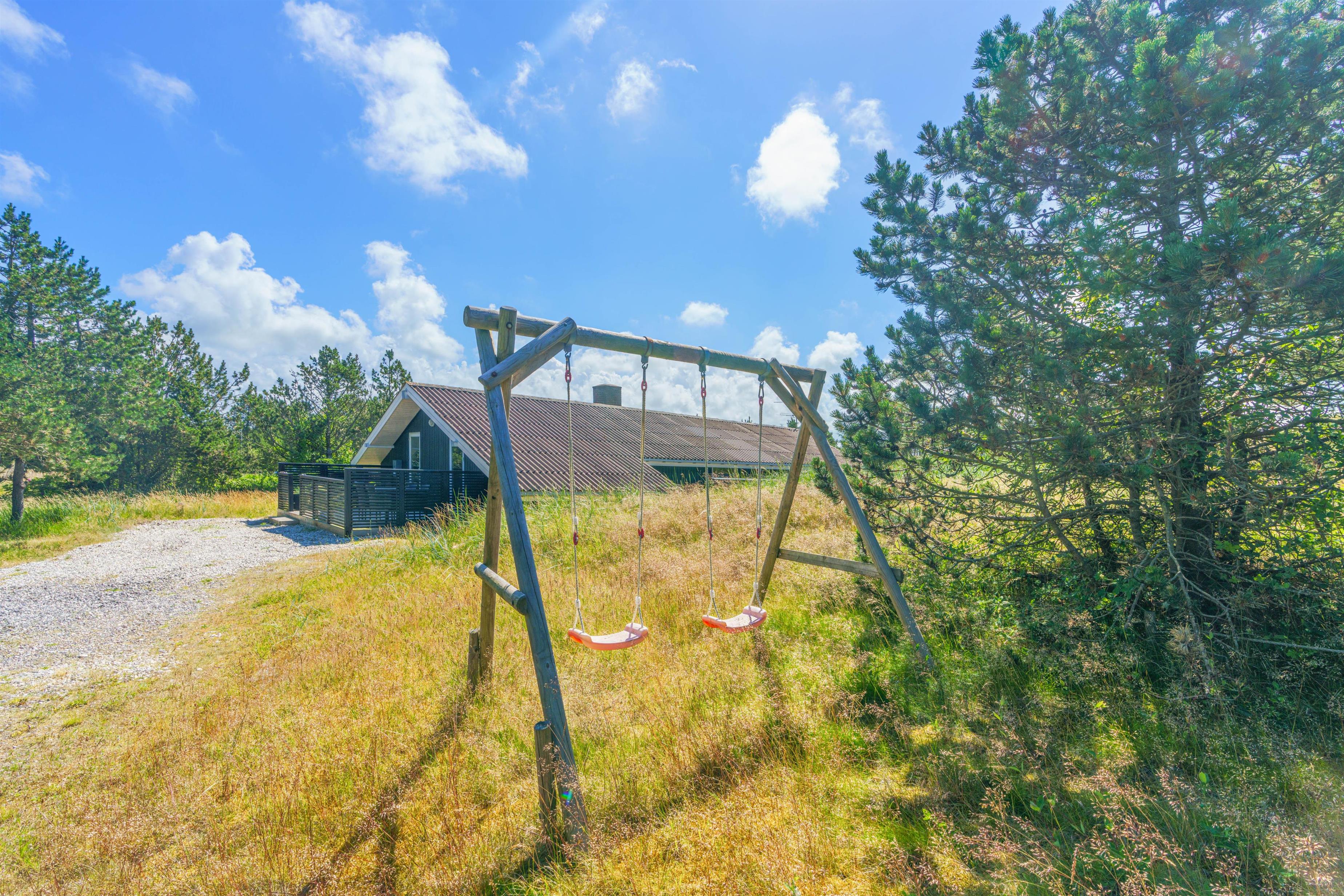 Omkring feriehuset finder I den skønne terrasse. Her kan familien og hunden tilbringe masser af hyggelige ferietimer, læg jer i liggestolen med en god krimi og en kop kaffe eller tilbered aftensmaden i grillen, sæt jer samlet i de behagelige havemøbler og nyd hinandens selskab, mens fisken ligger og syder på grillen. Lad børnene lege på gyngerne, mens I voksne nyder blot at sidde og kigge på deres glade ansigter.