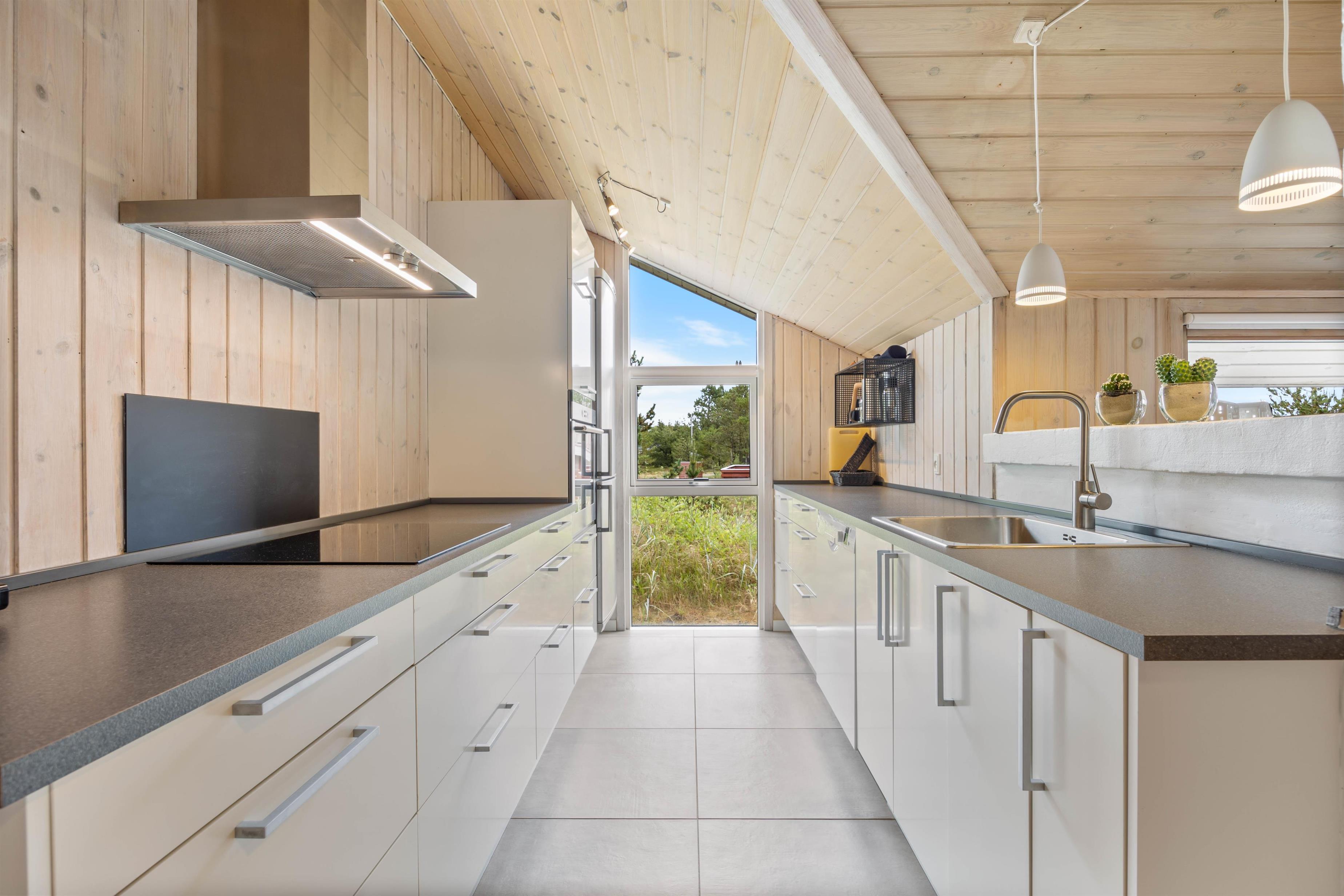 Køkkenet er i åben forbindelse med stuen og madlavningen er en sand fornøjelse i disse omgivelser. Her er det hurtige induktionskomfur, opvaskemaskine samt mikroovn.