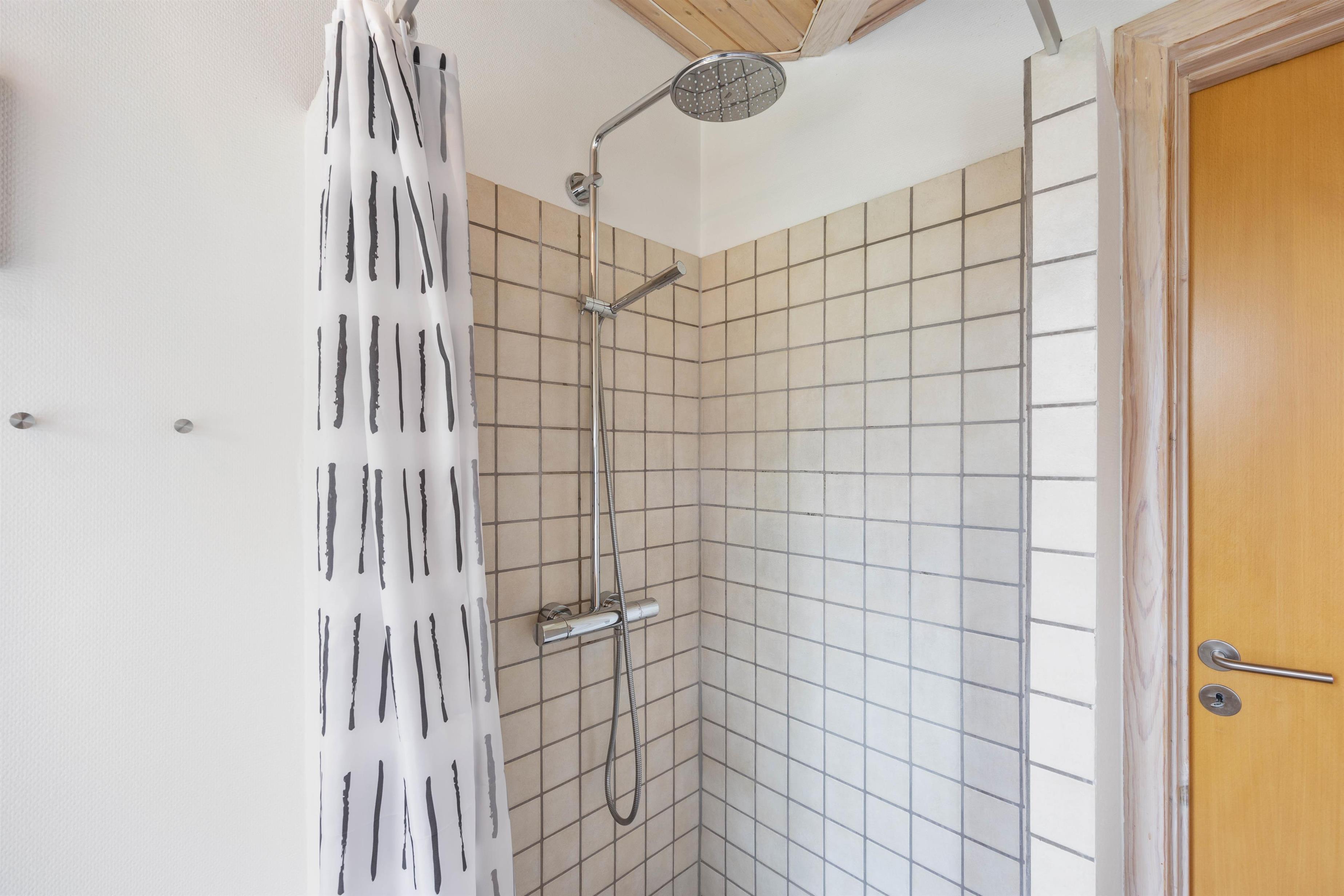Sommerhusets eneste badeværelse har fliser i brusenichen og behagelig gulvvarme. Badeværelset er lyst og moderne, og man nyder virkelig at opholde sig derinde.