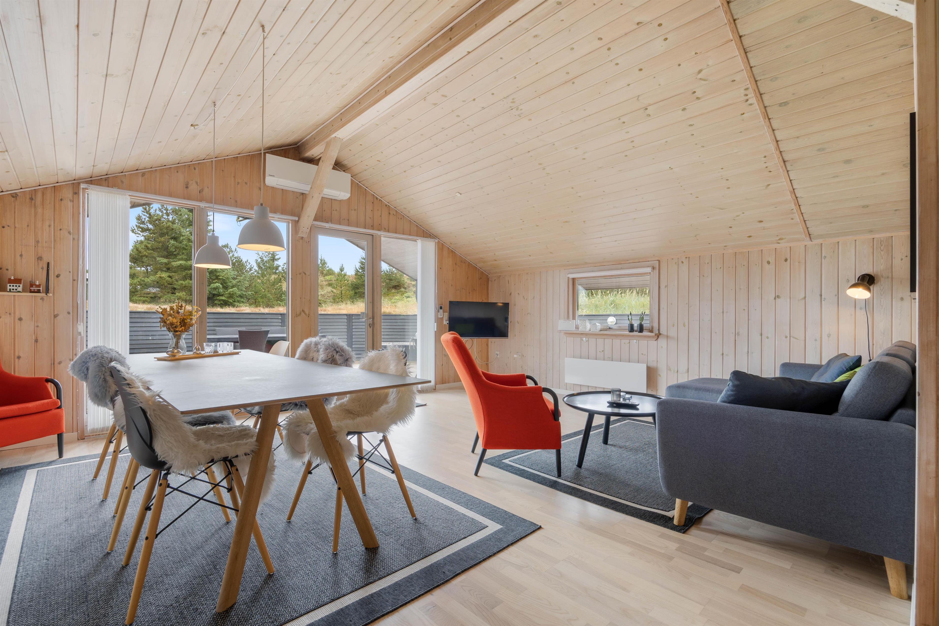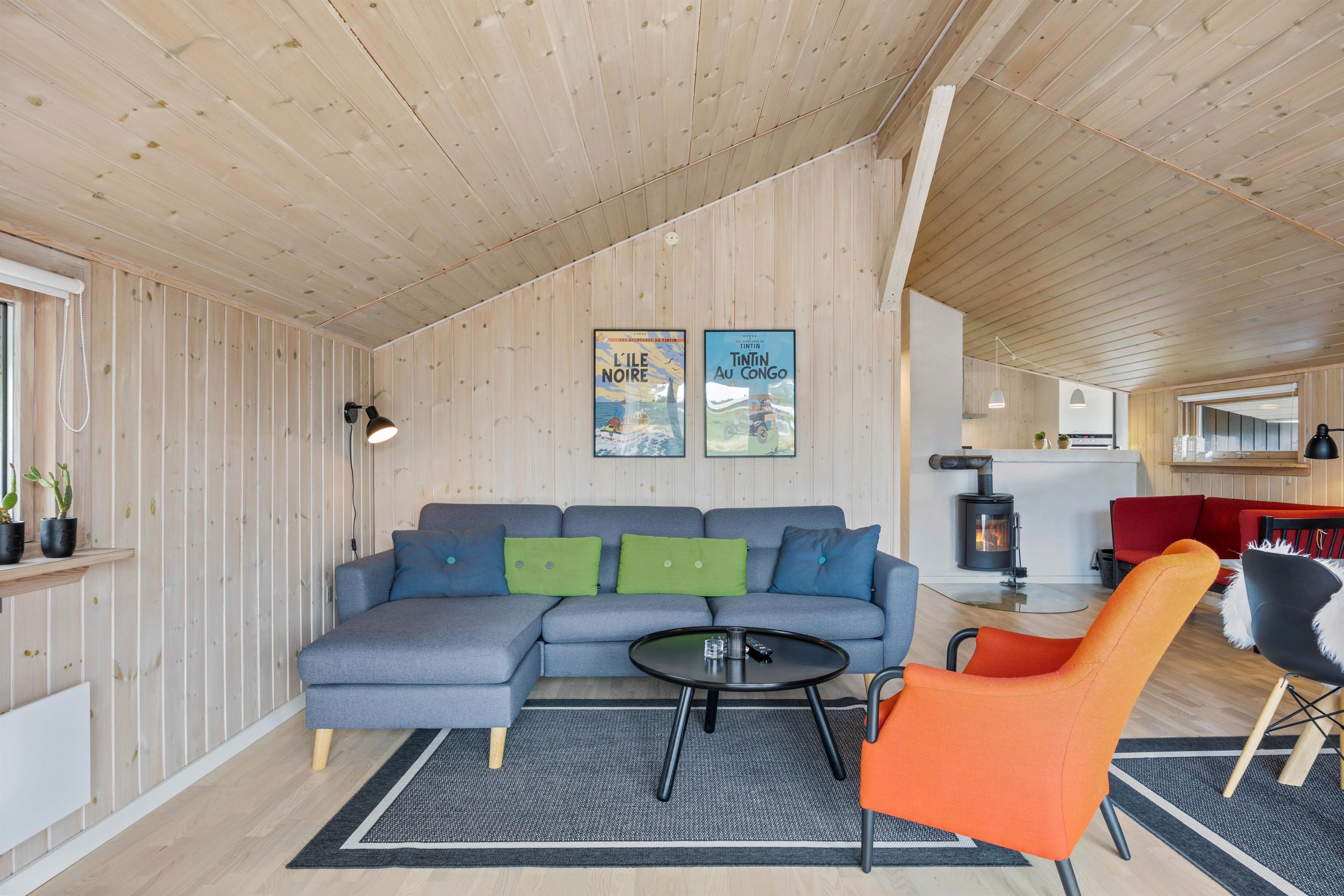 Den hyggelige stue danner de perfekte rammer for en familieferie. Her er der fladskærms-TV og brændeovn. Så sæt jer i sofaen og se en god familiefilm i tv, mens varmen breder sig fra brændeovnen. Til de lidt koldere dage kan I med fordel tænde for den energibesparende varmepumpe.