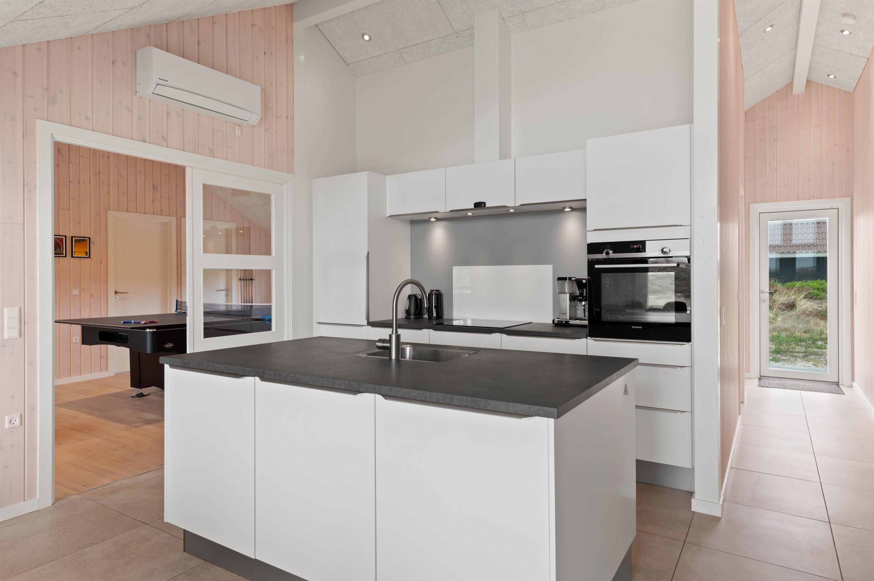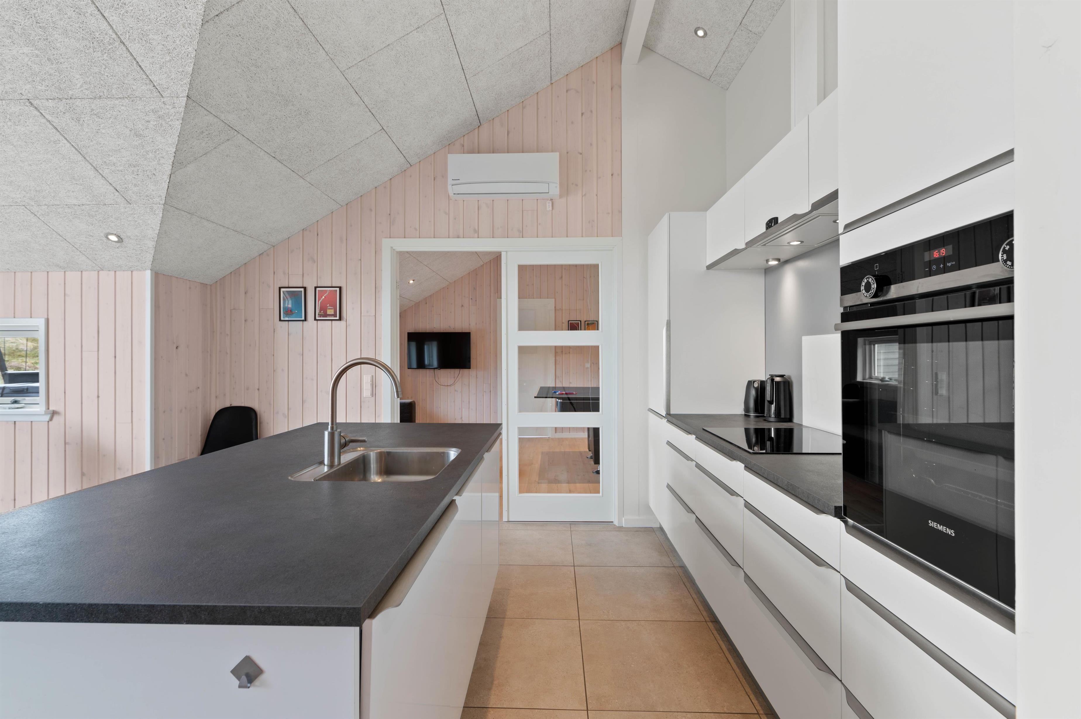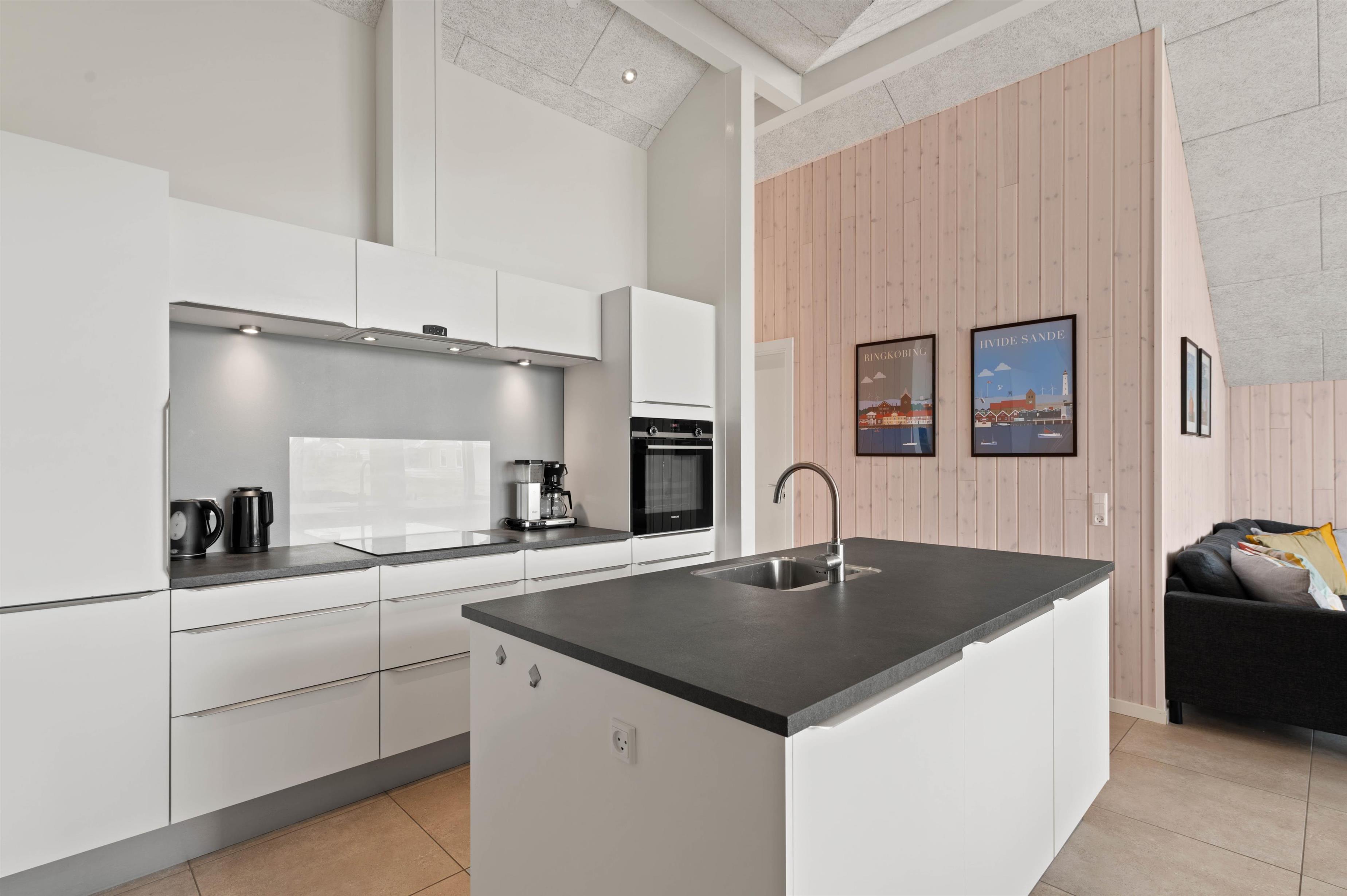 Køkkenet er udstyret med induktionskomfur, mikrobølgeovn, køleskab samt opvaskemaskine og inviterer jer til fælles madlavning.