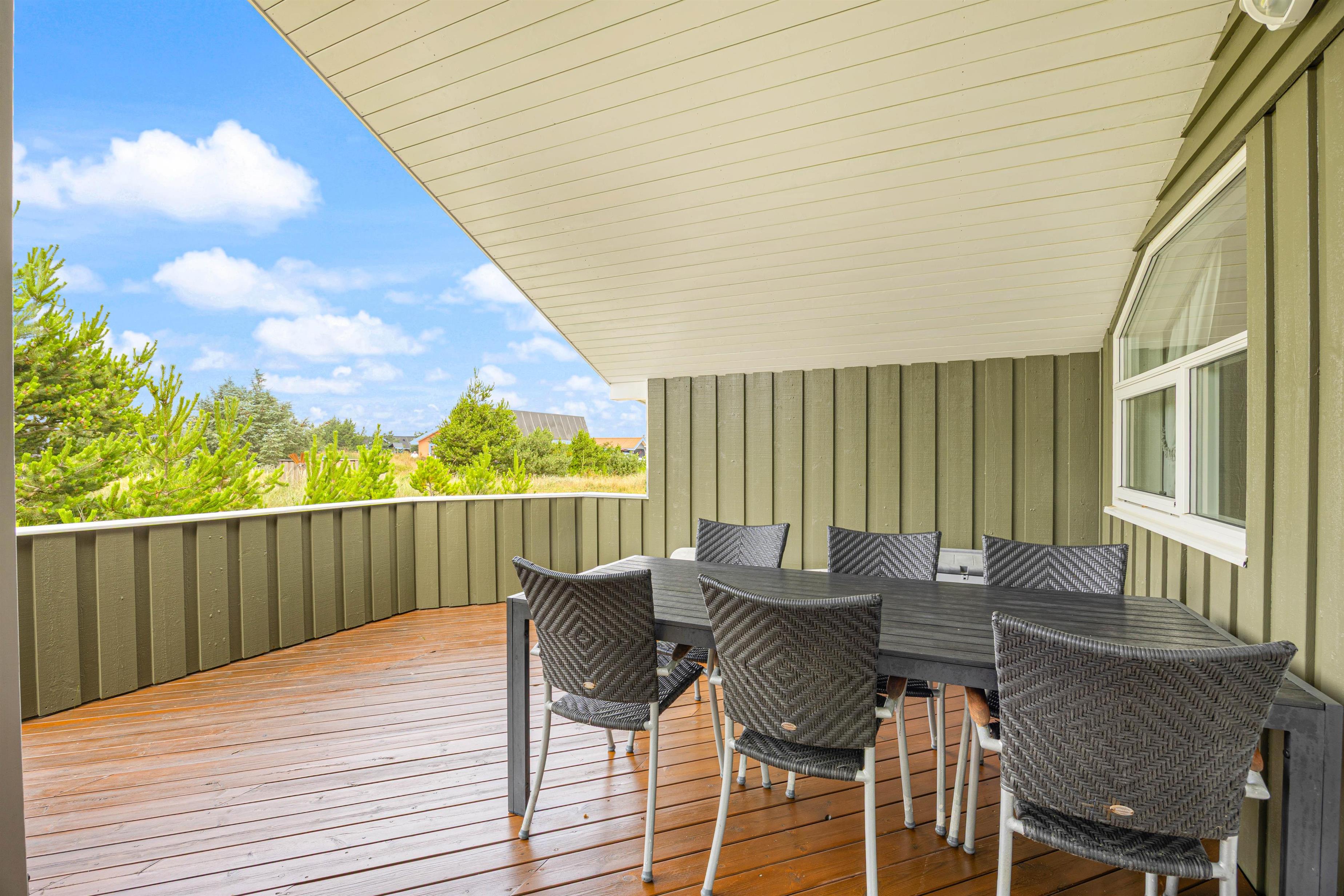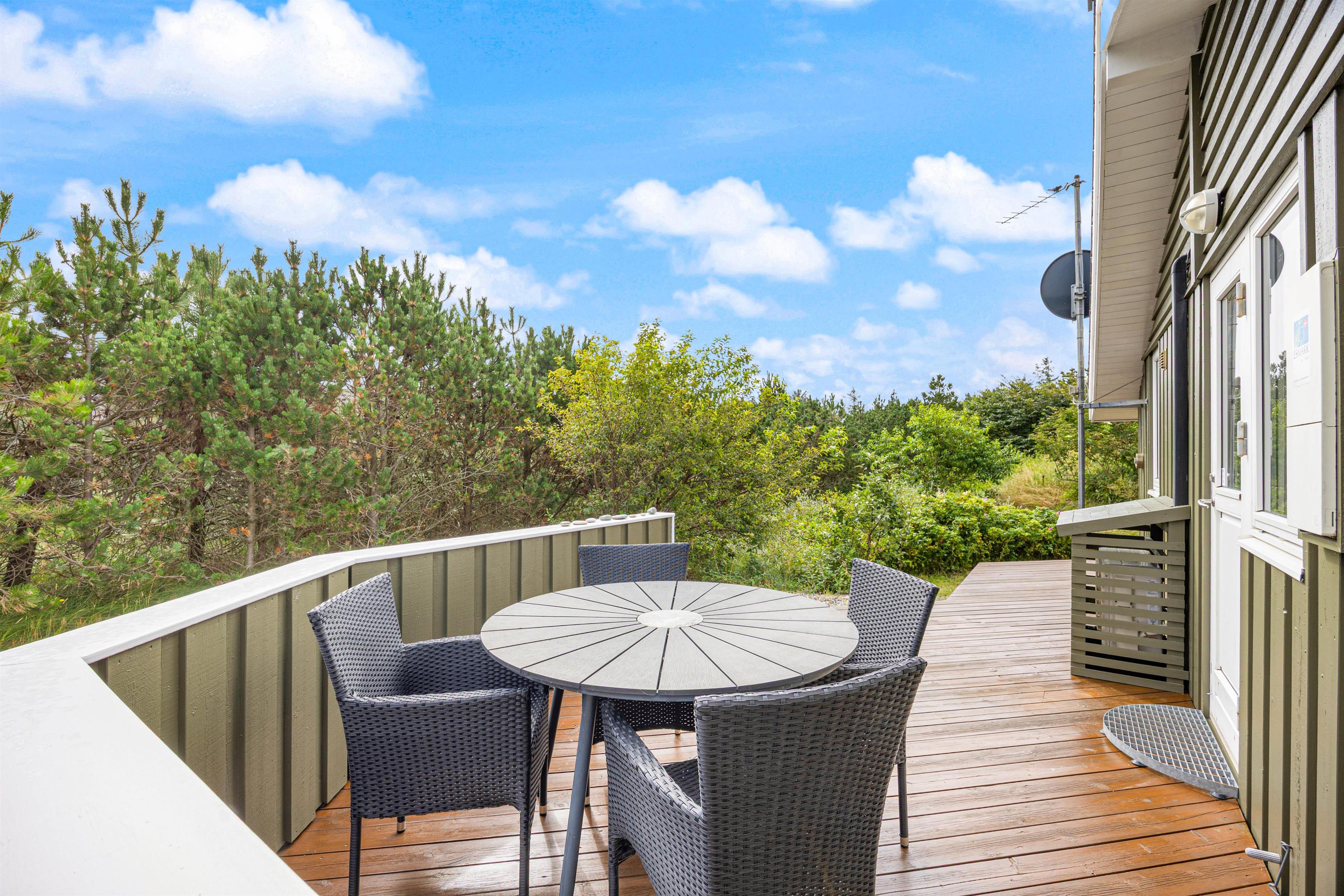 Allerede fra morgenstunden kan I gøre brug af sommerhusets gode terrasser. Ved indgangsdøren er der en lille østvendt terrasse, hvor I kan nyde de tidlige morgentimer, inden hundene skal med på en 700 meters gåtur til købmanden efter nybagte rundstykker til morgenmaden.