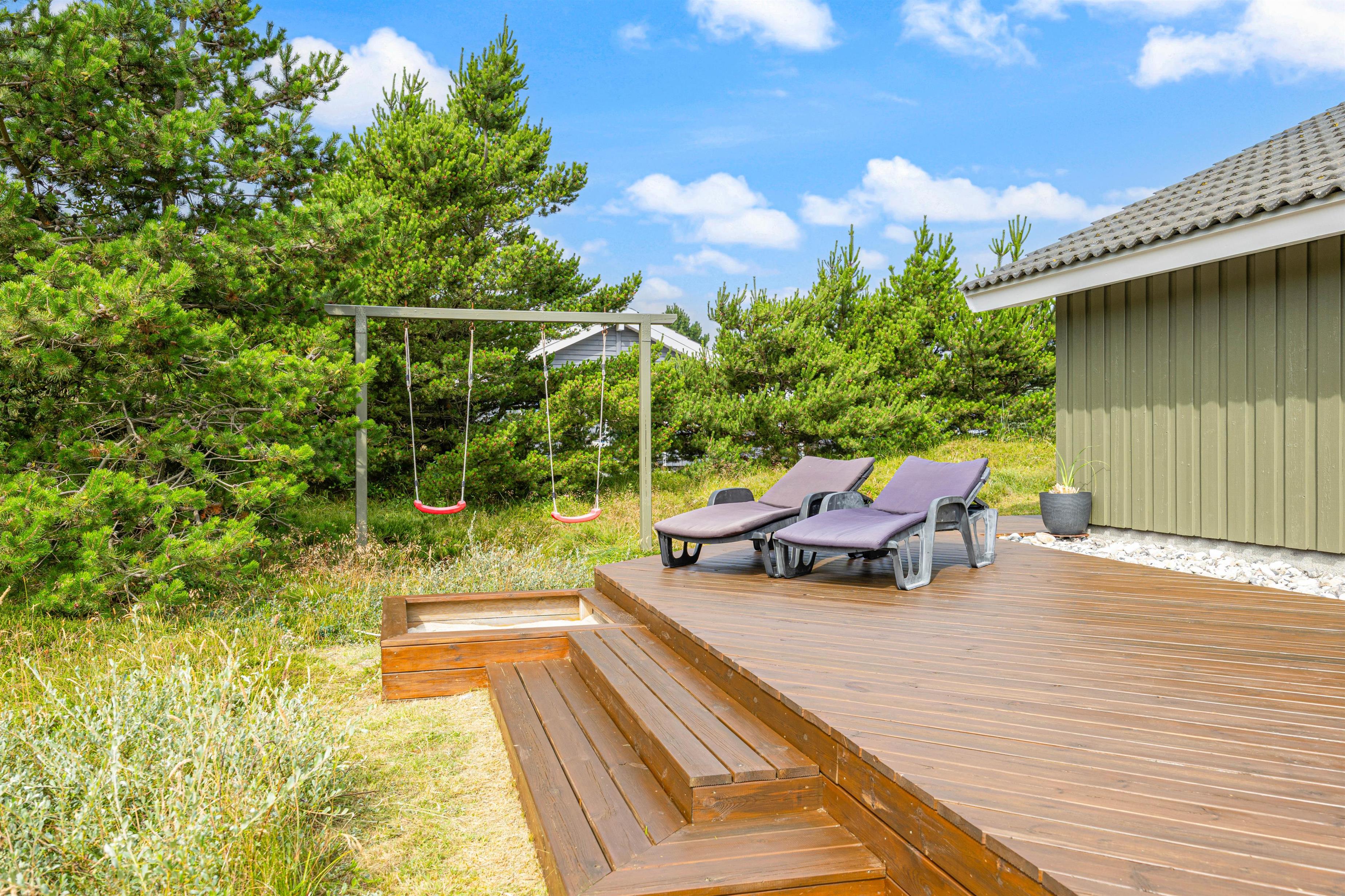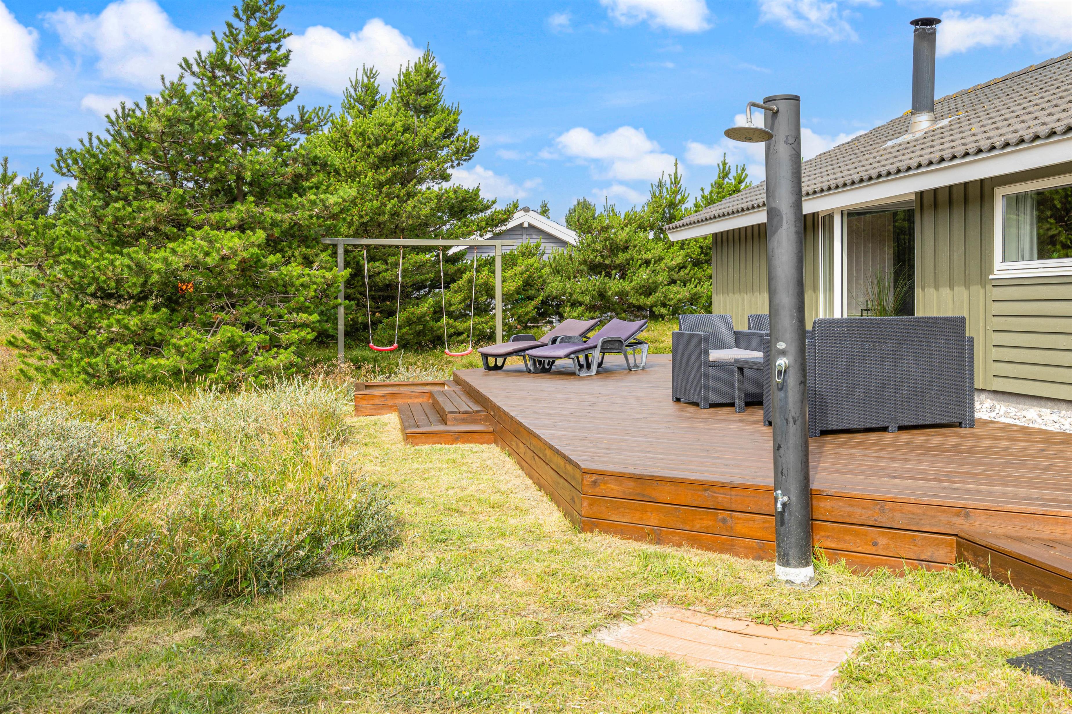 På den skønne naturgrund er der både sandkase og gynge, som er favoritter blandt familiens yngste. Til feriehuset hører også en udebruser, denne er tilgængelig fra primo april til medio oktober.