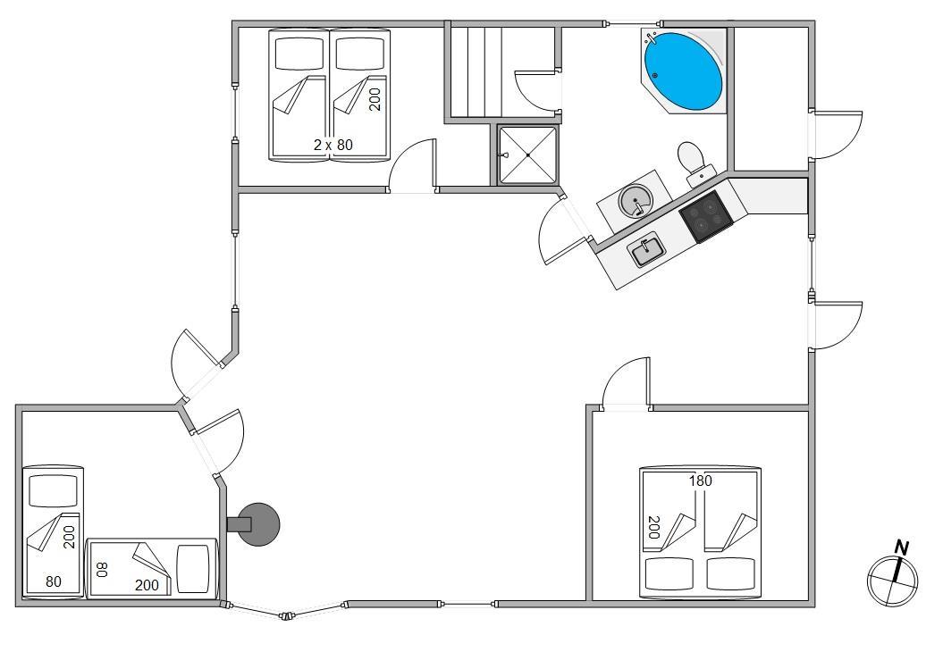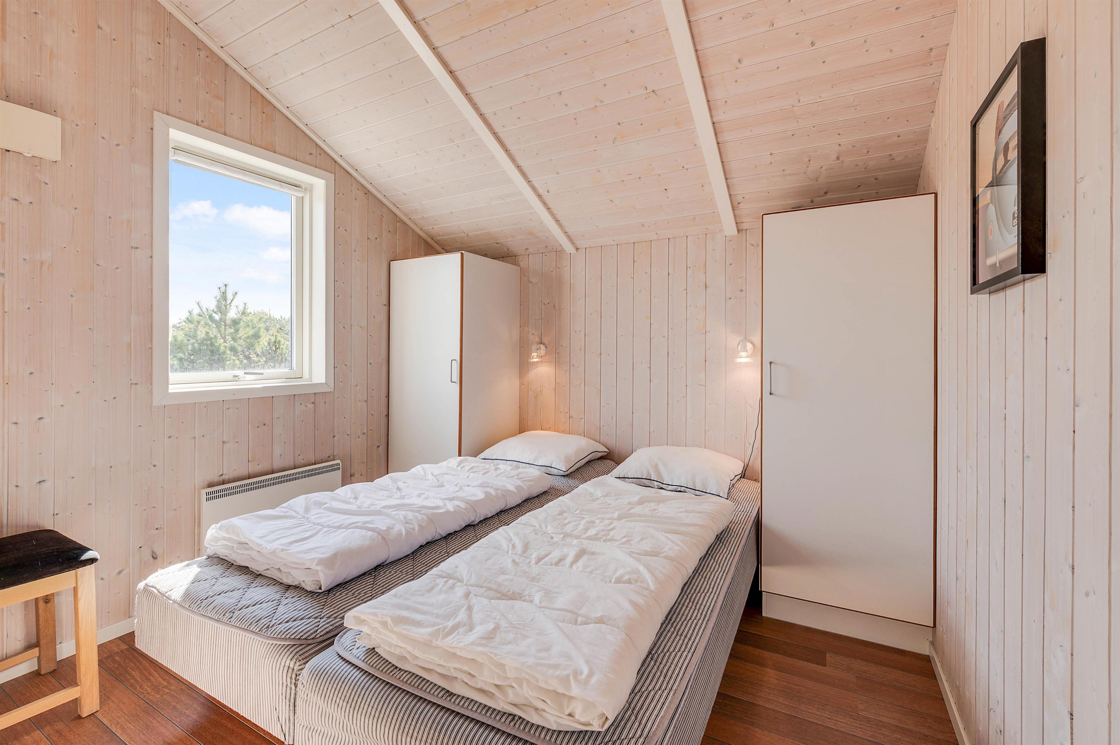 Sommerhuset har 3 soveværelser, hvoraf der er dobbeltsenge på 2 af dem. På det sidste værelse finder I 2 enkeltsenge, hvor der kan samles ny energi til morgendagens aktiviteter.