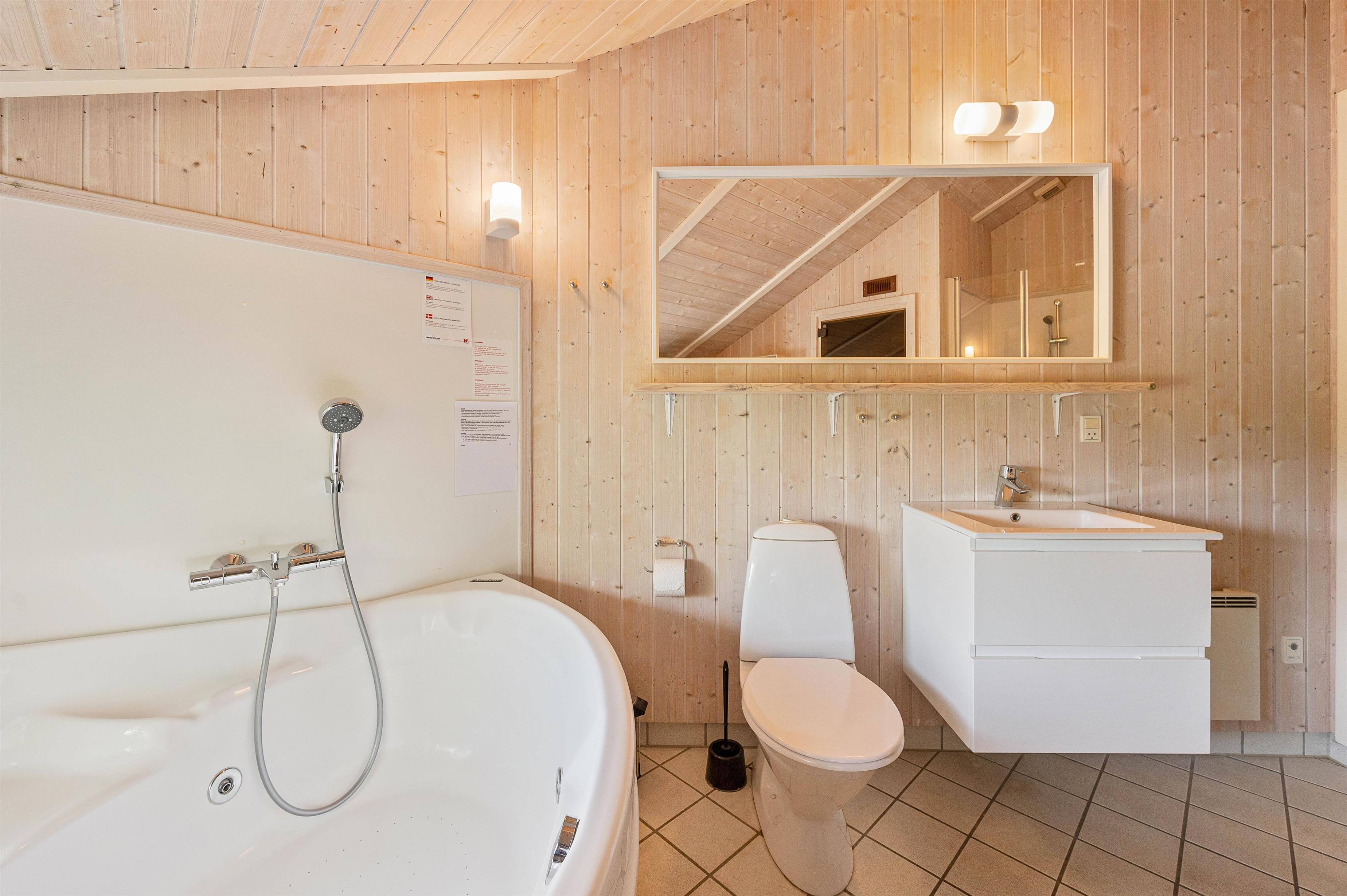 Efter en lang gåtur ved stranden på en blæsende efterårsdag kan I slappe af og få varmen i sommerhusets spabad og sauna, som I har adgang til på badeværelset. Her er også gulvvarme, så fødderne ikke bliver kolde.