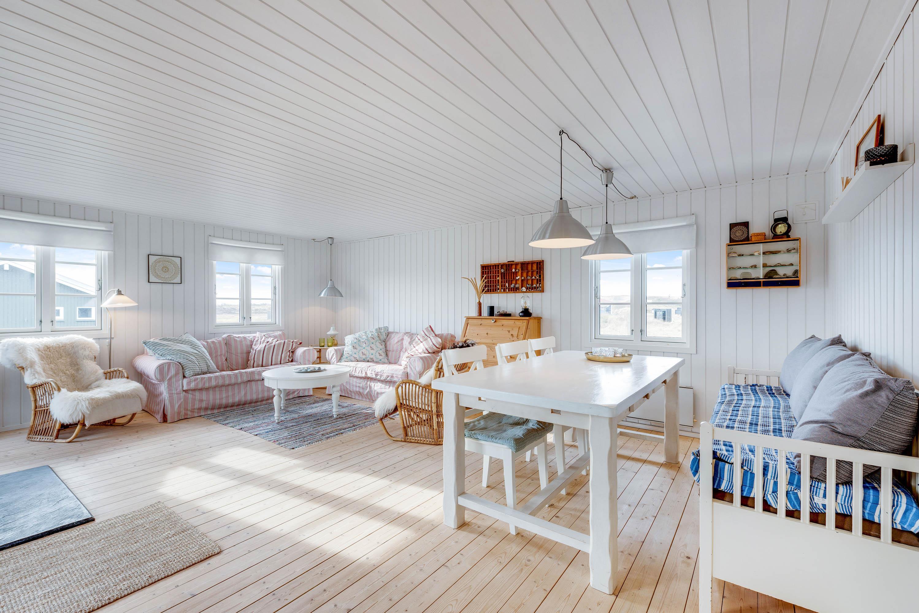 Stuen er indrettet i nordisk stil med kludetæpper, flotte trægulve og bløde sofaer. Rigtig hyggeligt – og oplagt til indendørs hygge – måske med familiespil eller en god bog foran brændeovnen. Her kan man kun føle sig hjemme.