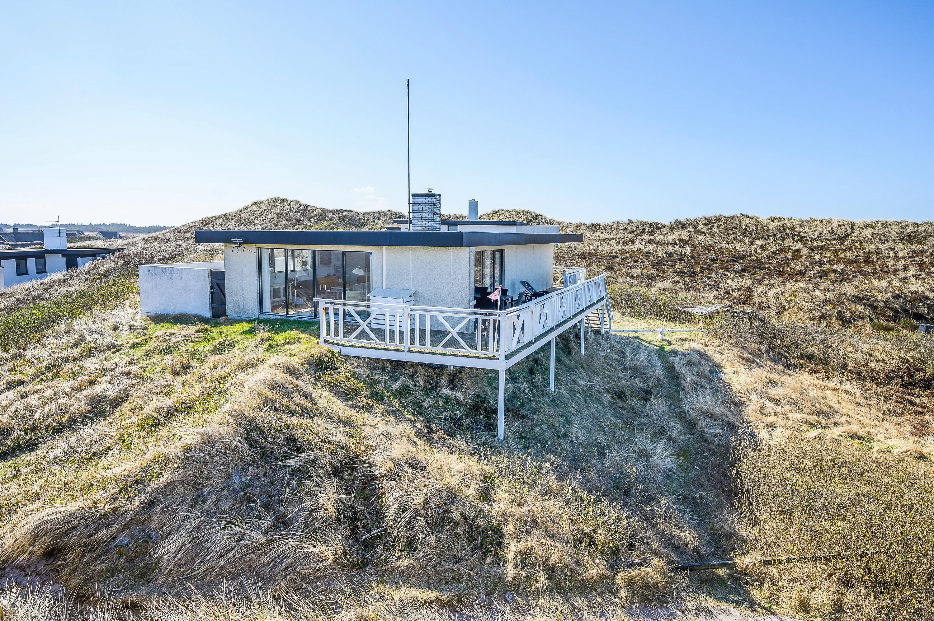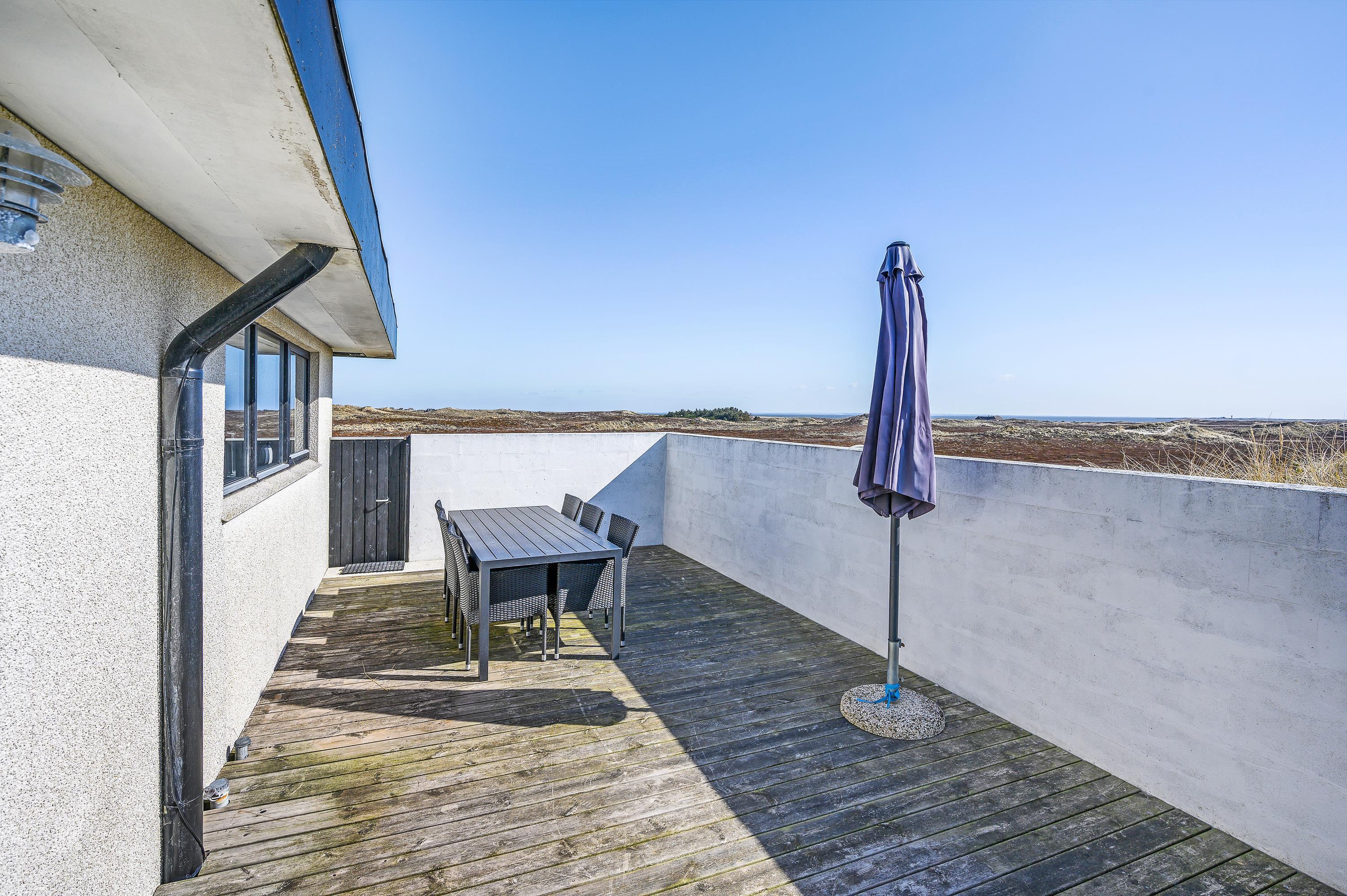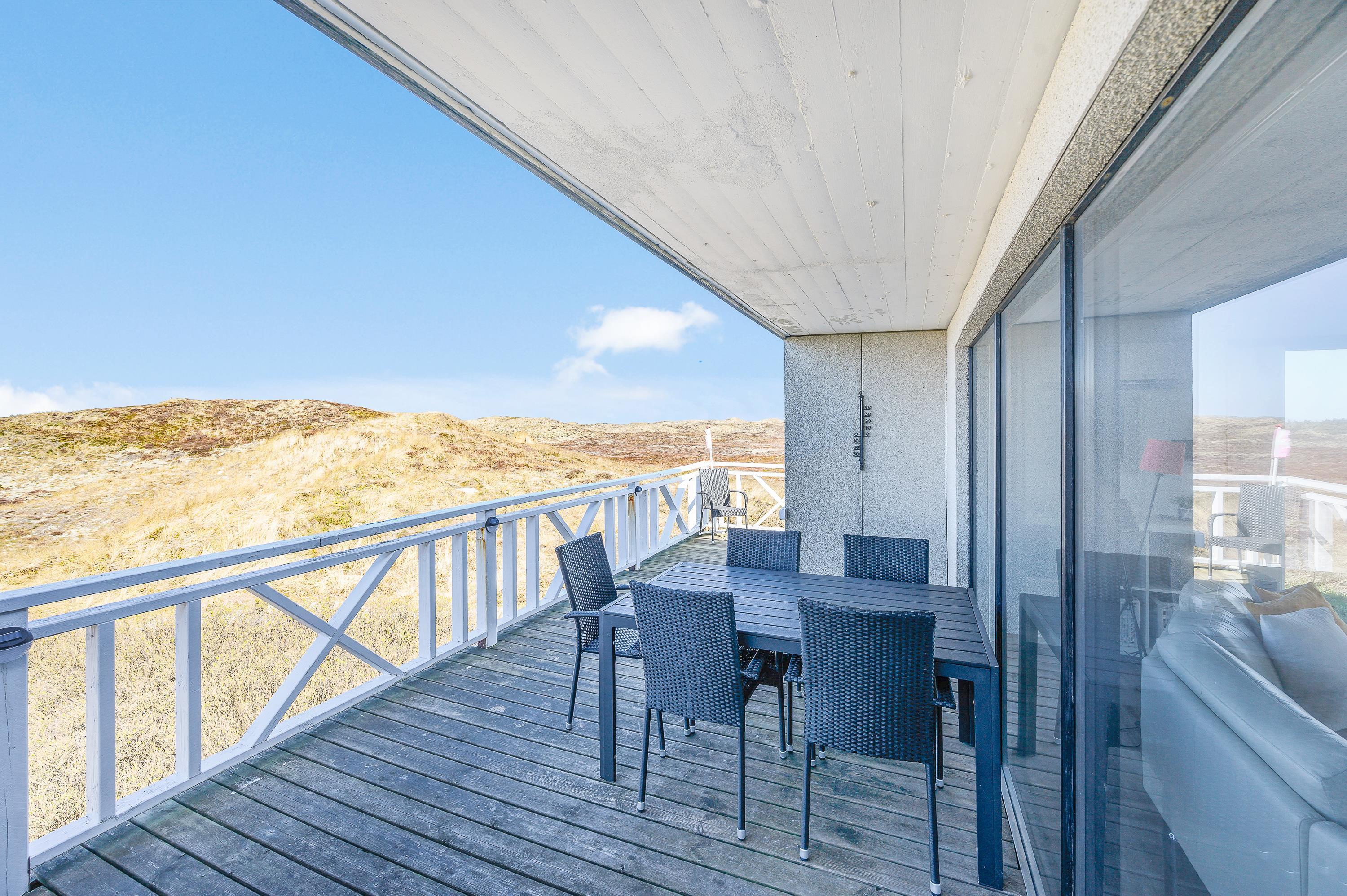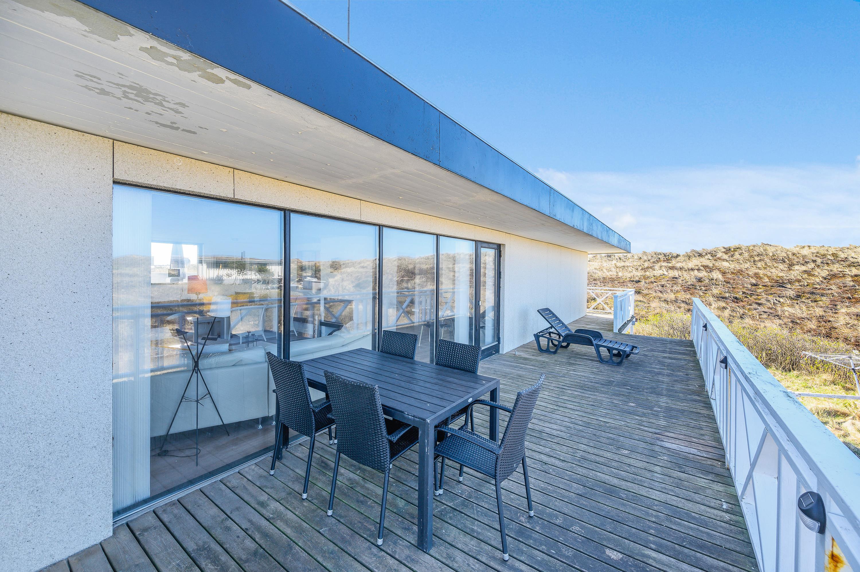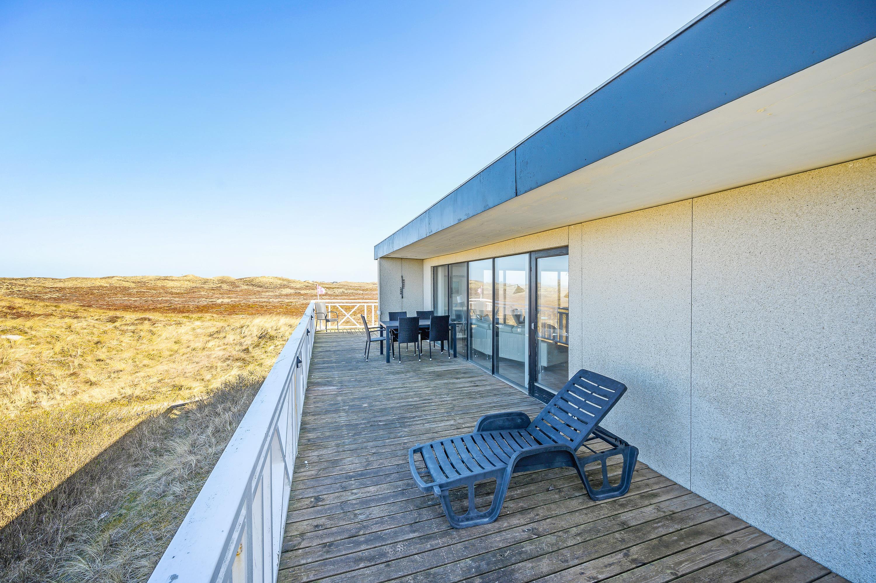Det dejlige hus med panoramaudsigten er omgivet af terrasser og alle måltider kan således nydes ude, lige meget hvor på himlen solen står. Følg solen hele dagen, fra opgang i øst til nedgang i vest over klitterne. Ultimativ nydelse er en veltilberedt grillmiddag, mens I ser solen farve himlen orangerød over klitterne.