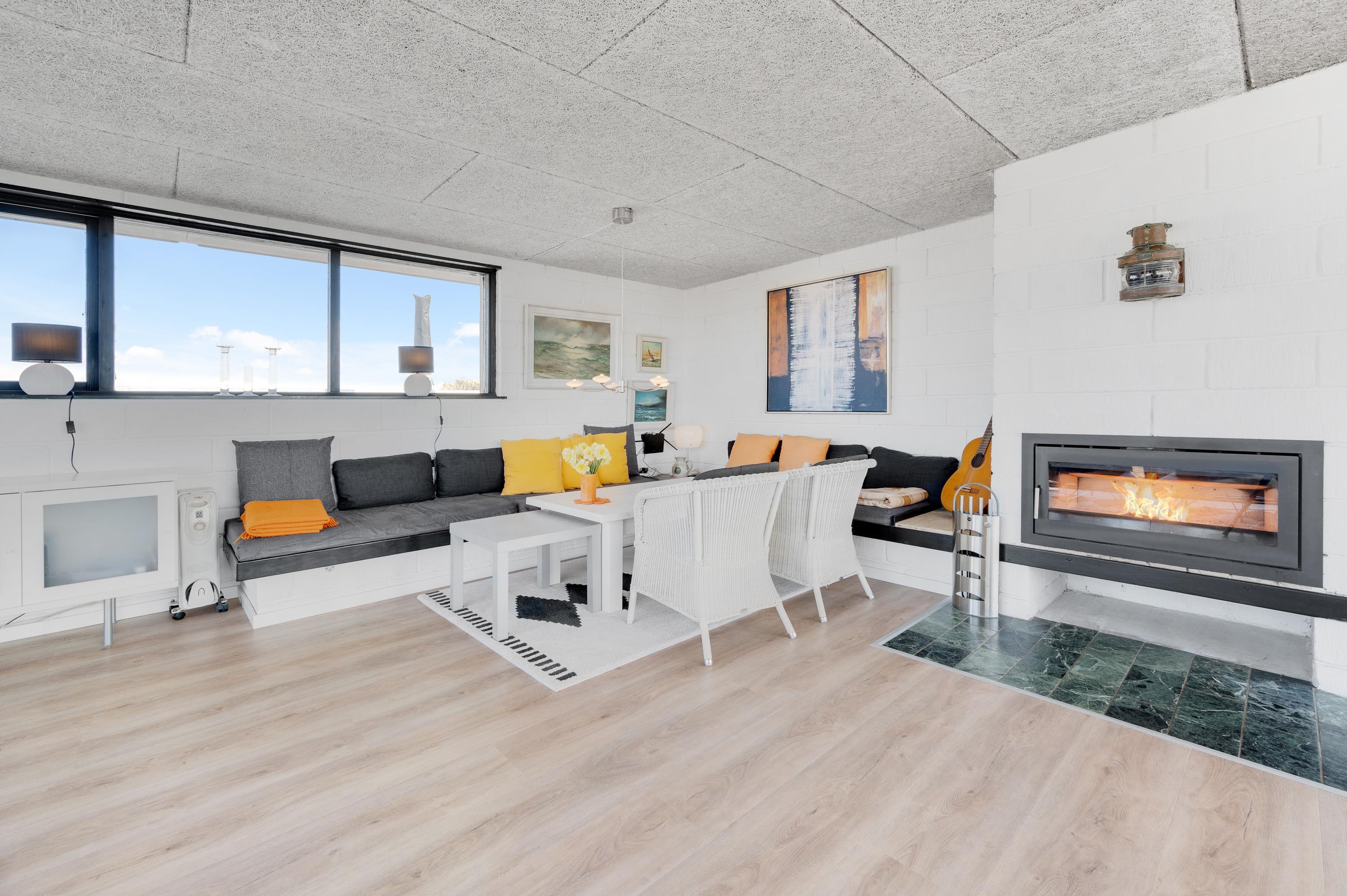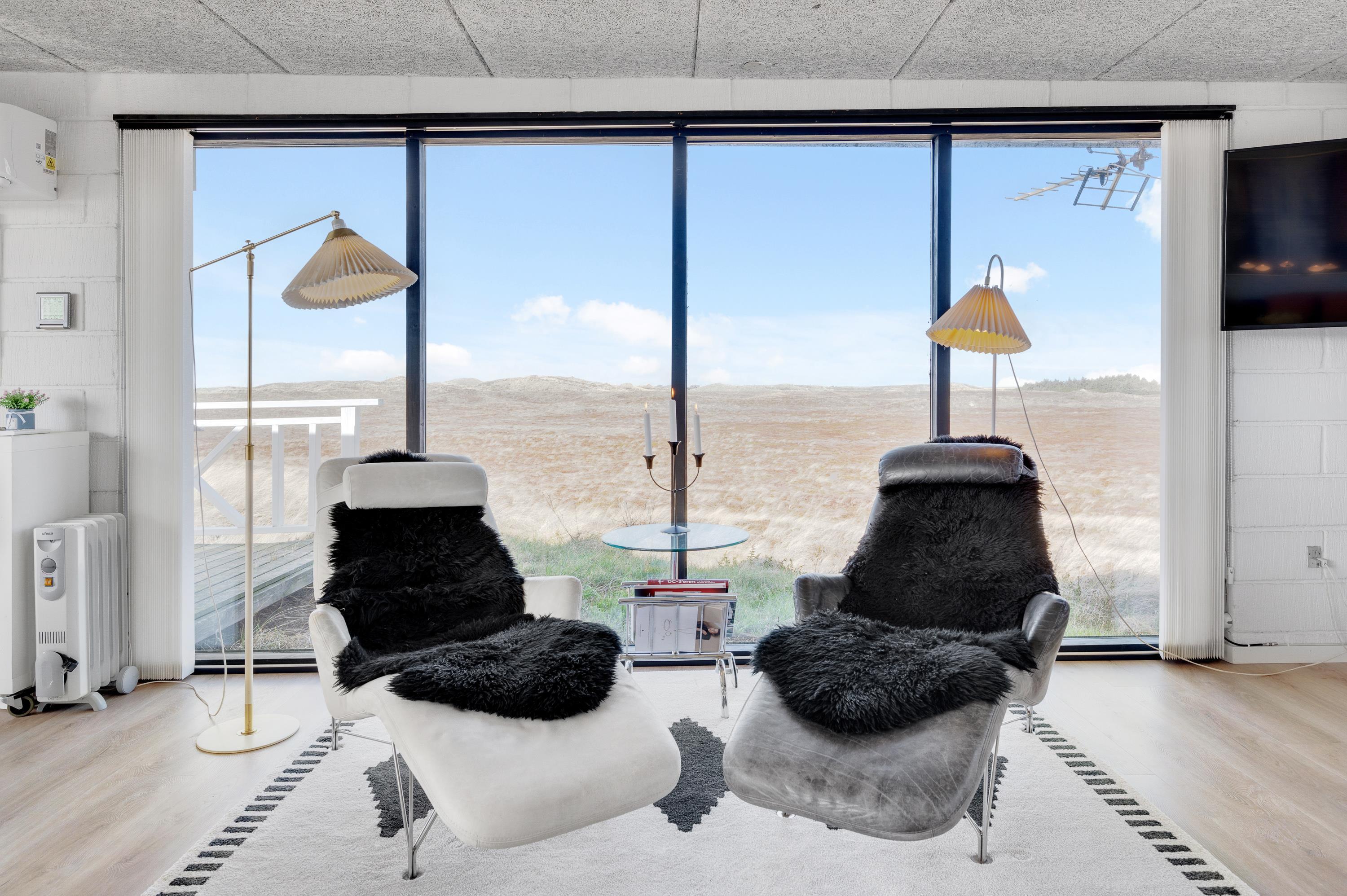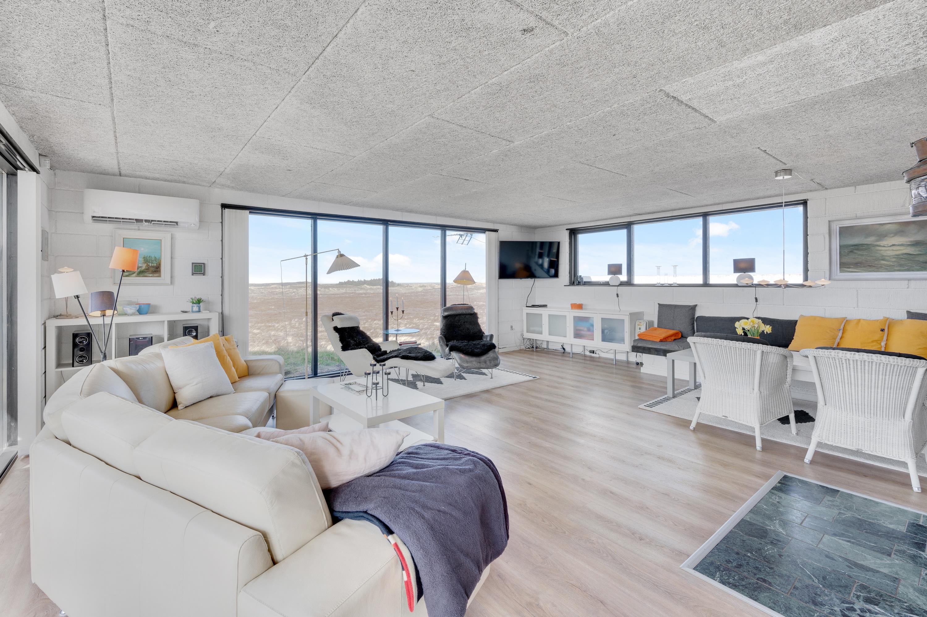 Efter en dag i den friske natur indbyder den store kombinerede stue-spisestue til afslapning og familiehygge – med ilden knitrende i brændeovnen. Gennem de store panoramavinduer hentes den fascinerende og flotte natur med hedelandskabet og klitterne helt ind i stuen til jer.