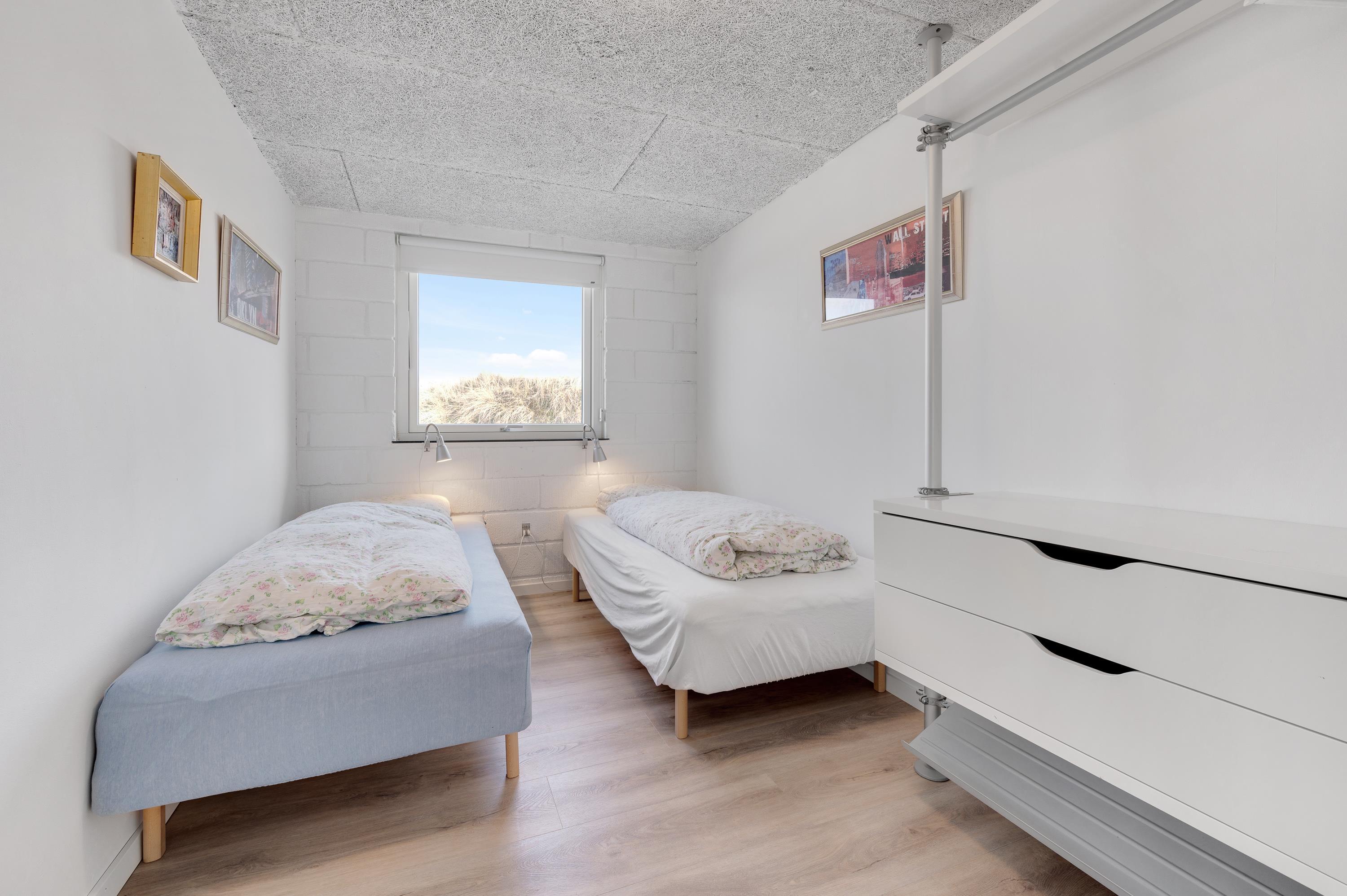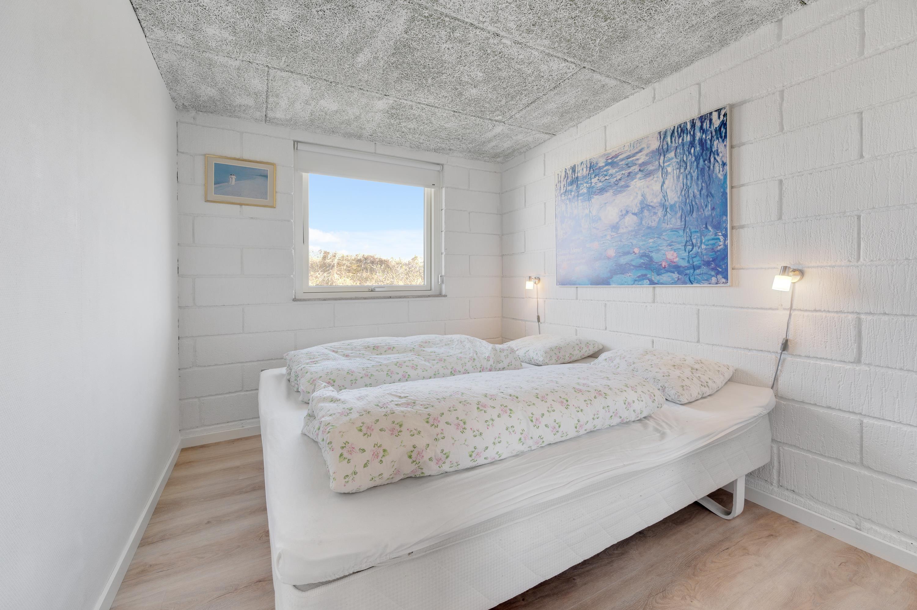 Sommerhuset på Riskrogen 18 har plads til 7 personer, fordelt i 4 soveværelser hvoraf 2 befinder sig i kælderen. I det store badeværelse kan I slappe af og hygge i spaen. Det fine hvide hus i klitterne har ligeledes et gæstetoilet, ligesom vaskemaskine og tørretumbler er til jeres rådighed.