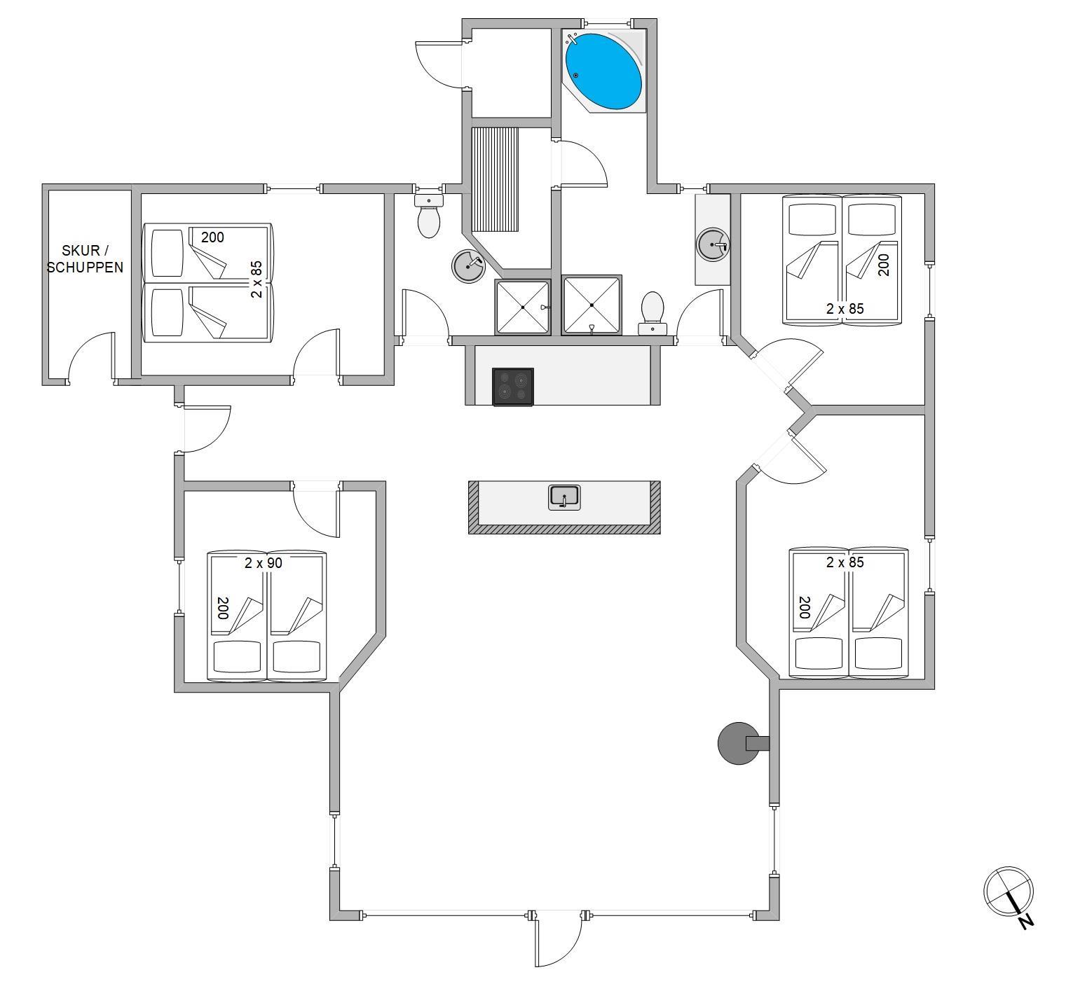 Derudover har feriehuset 2 dejlige badeværelser med gulvvarme og bruseniche. Et badeværelse er endvidere udstyret med en stor 6 personers standvandsspa, og herfra er der indgang til sommerhusets sauna.Som et ekstra plus er der både vaskemaskine og tørretumbler i sommerhuset.