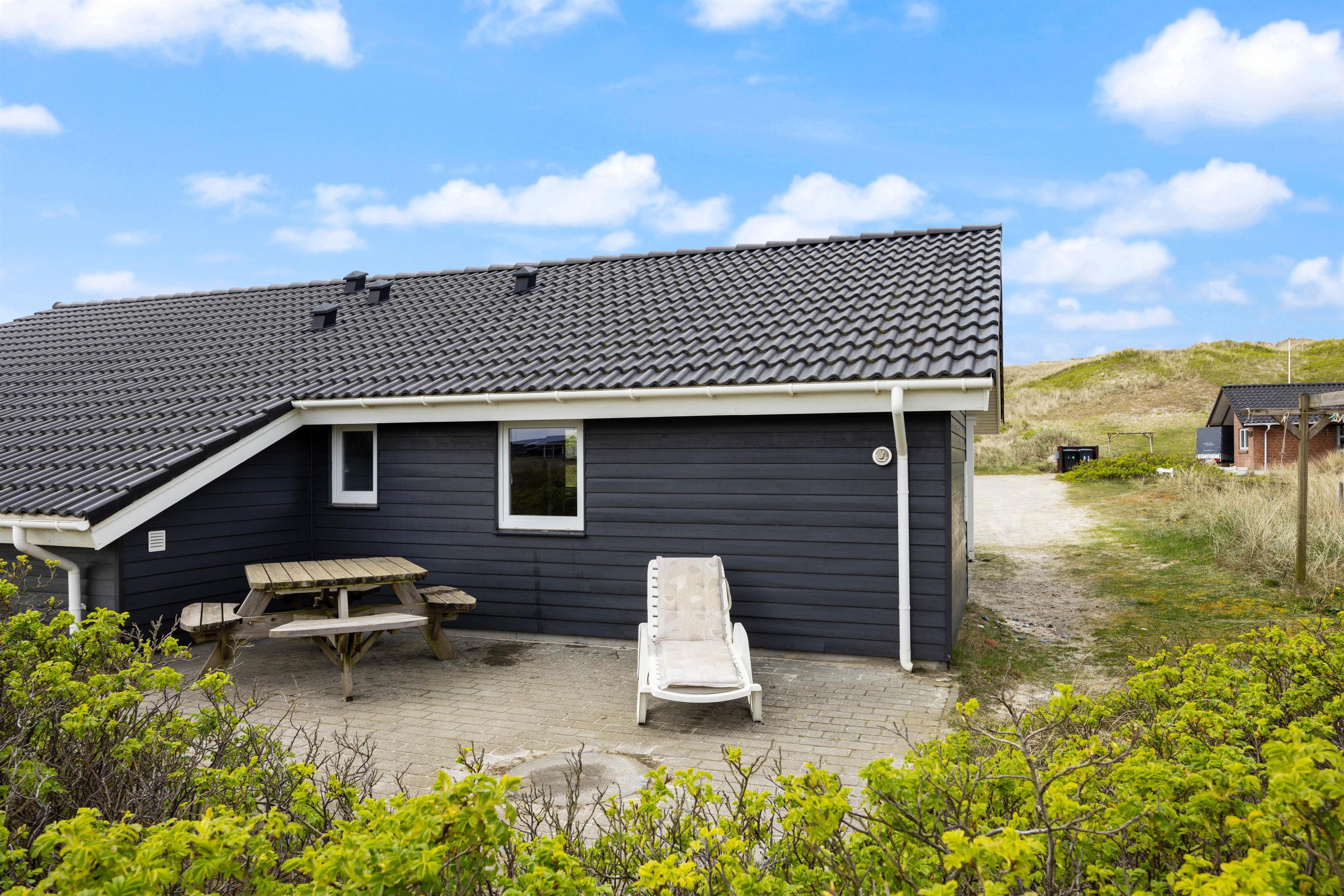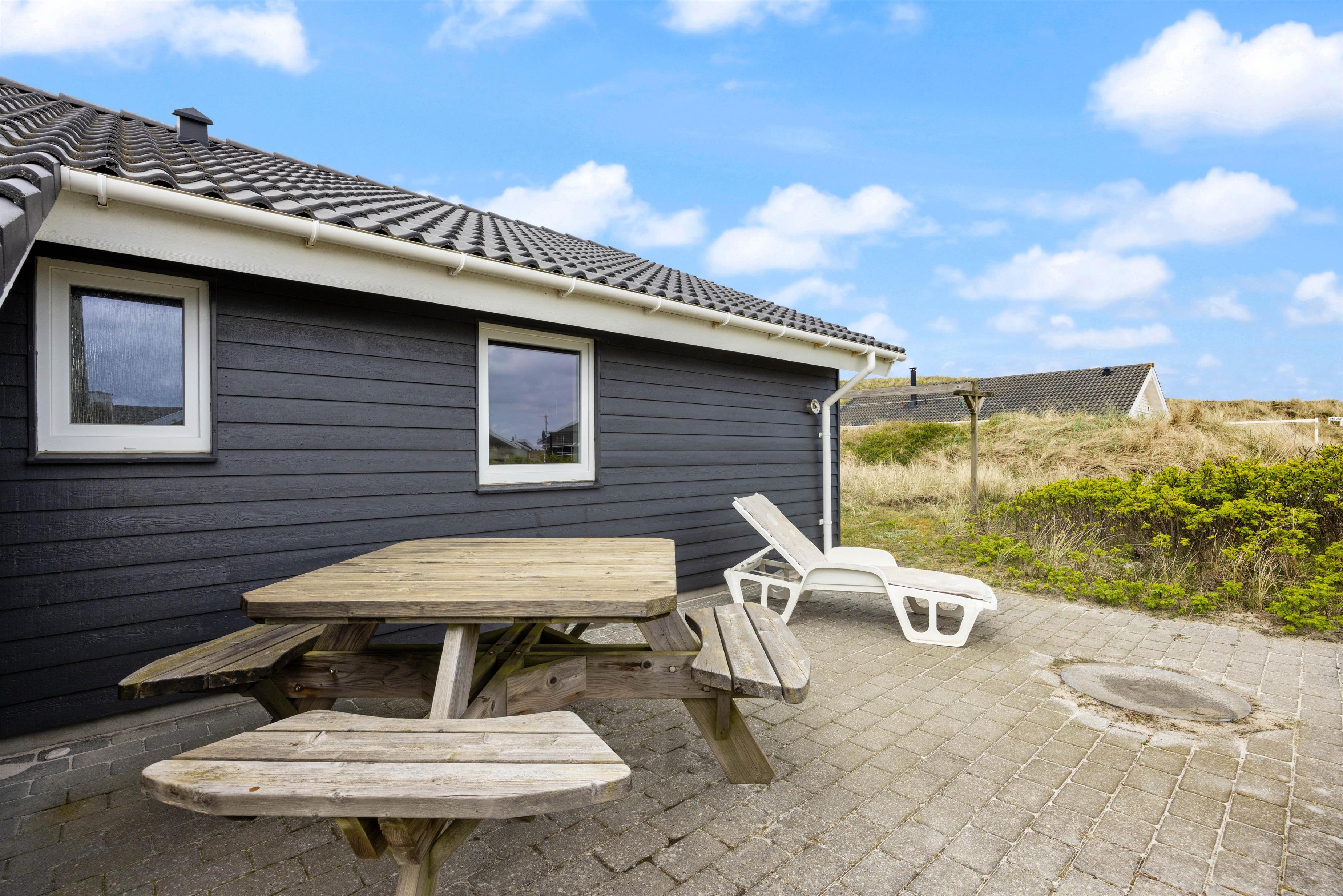 På den store, åbne og delvist overdækkede terrasse kan du nyde udsigten til klitterne. Sommerhuset er naturligt afskærmet, så du ikke bliver forstyrret af nysgerrige blikke. Terrassen er udstyret med liggestole, havemøbler og grill. Her er desuden opstillet gynge og sandkasse til de mindste.
