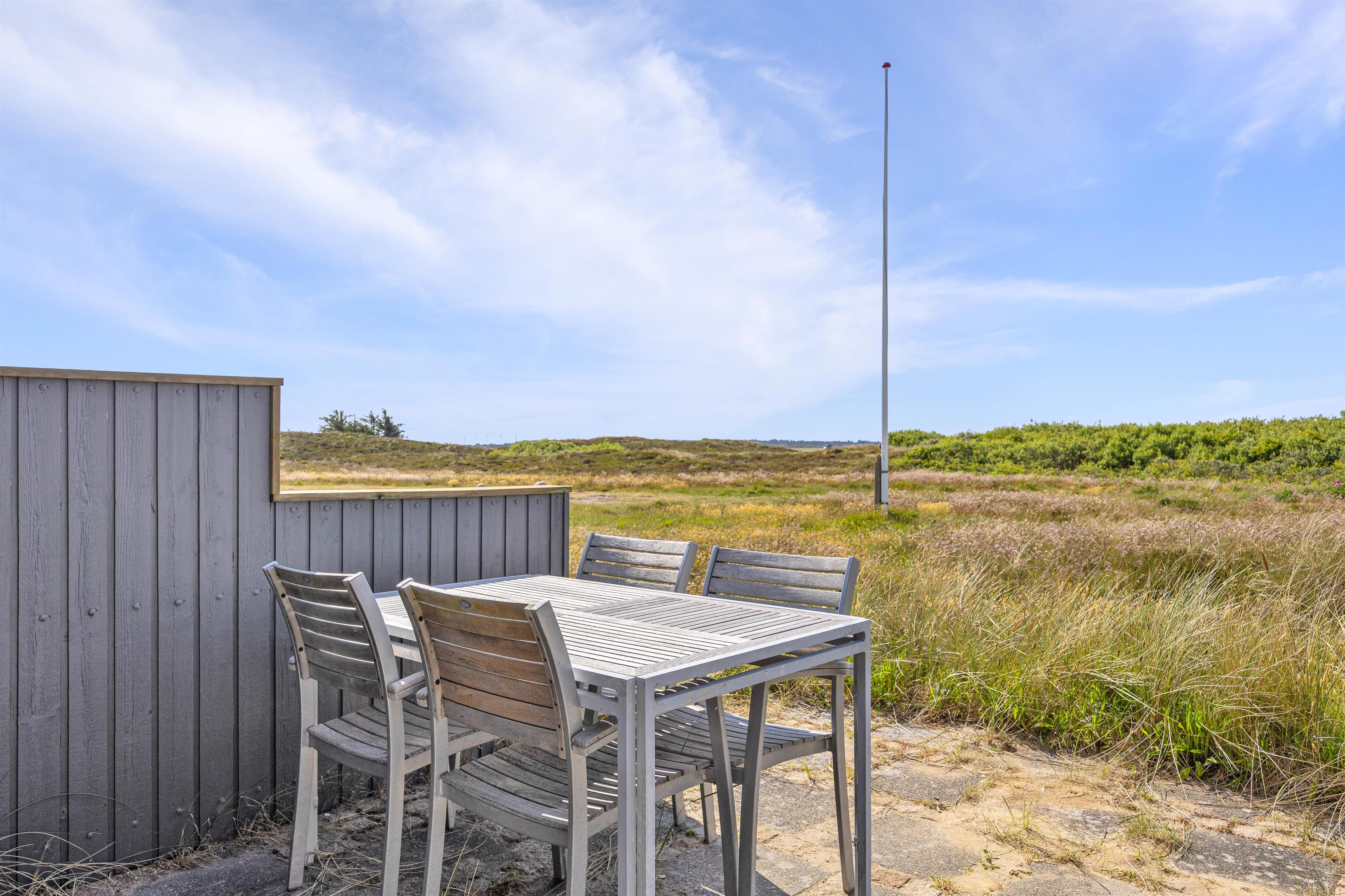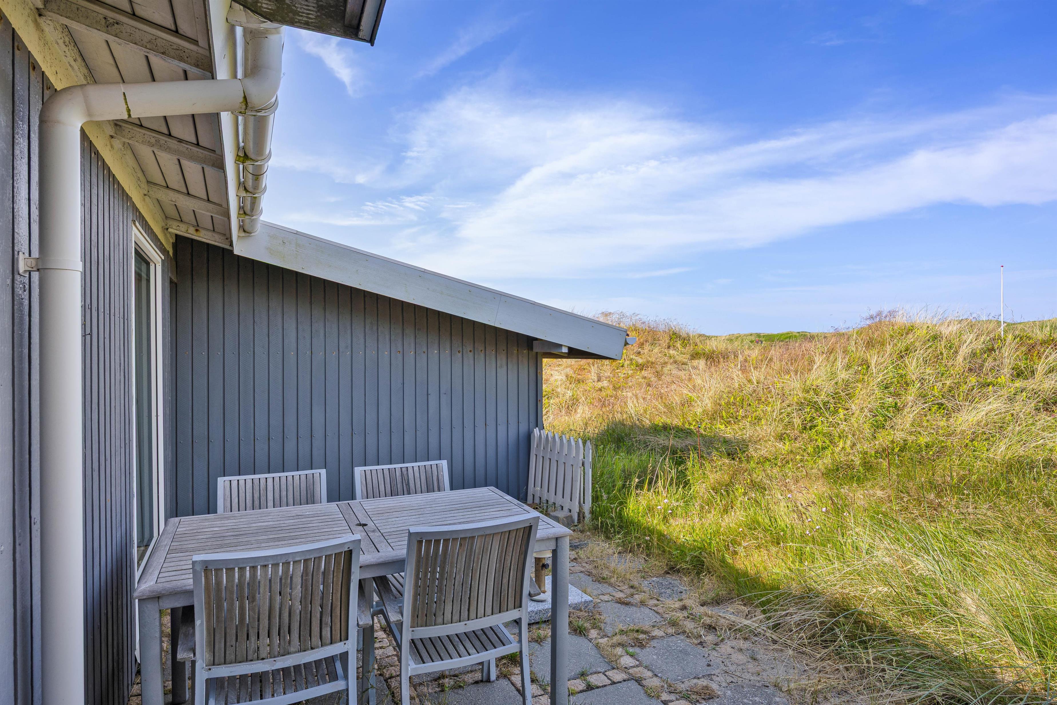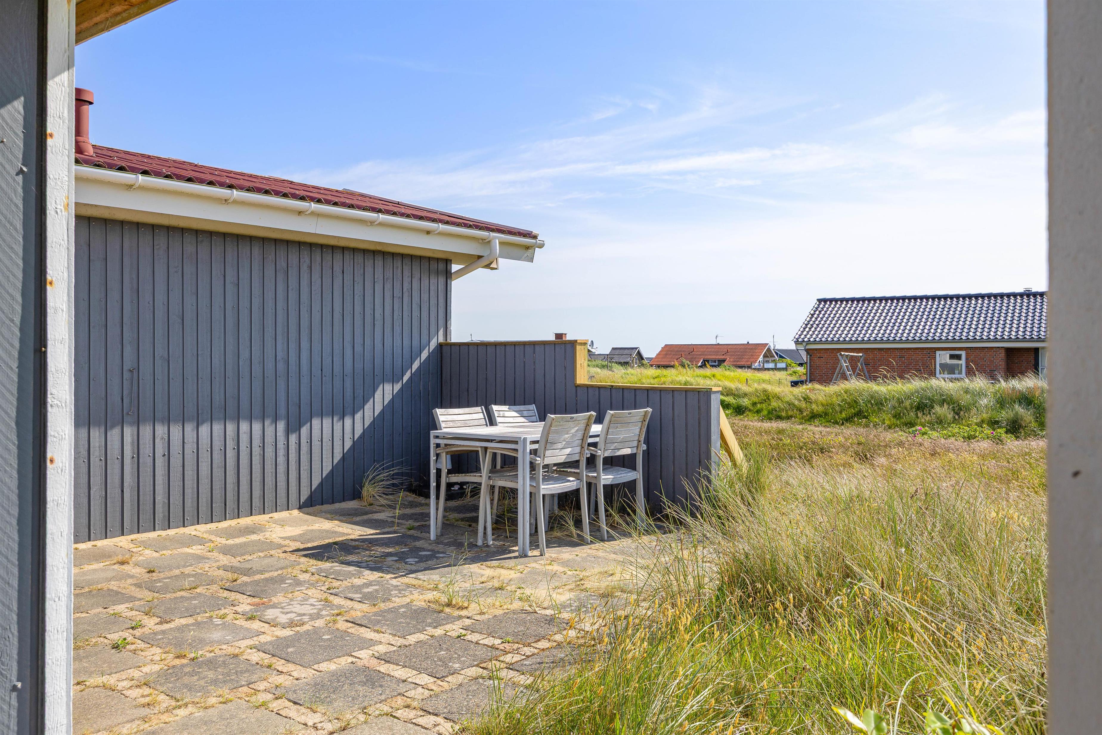 Der er både en overdækket og en afskærmet del af terrassen, hvor I kan finde læ og nyde en kop kaffe eller et måltid. Den omkringliggende grund er på ca. 1.270 m², og der er mulighed for at grille på sommeraftener, hvis vejret tillader det. Udsigten er præget af den omkringliggende naturgrund og klitlandskab.