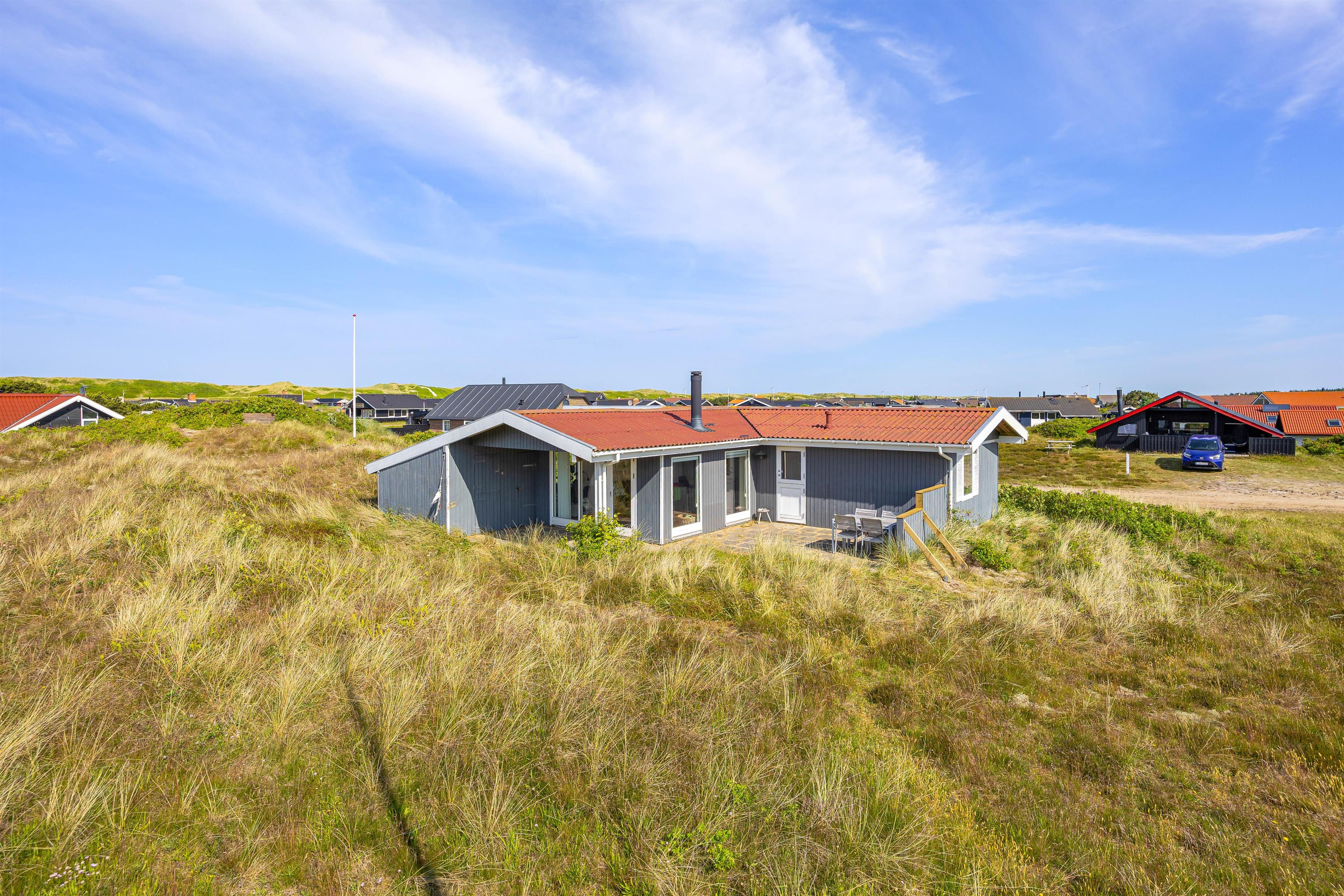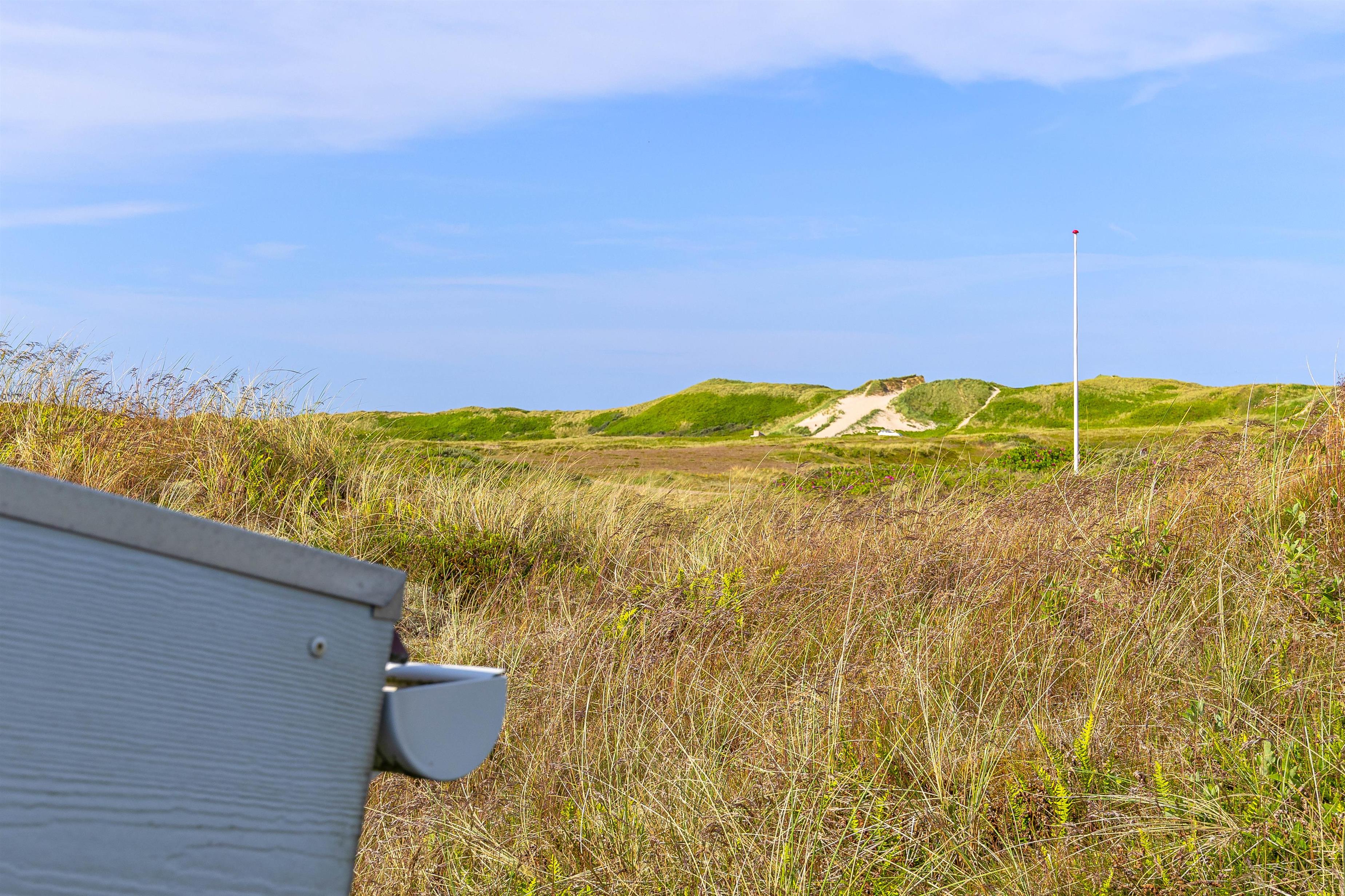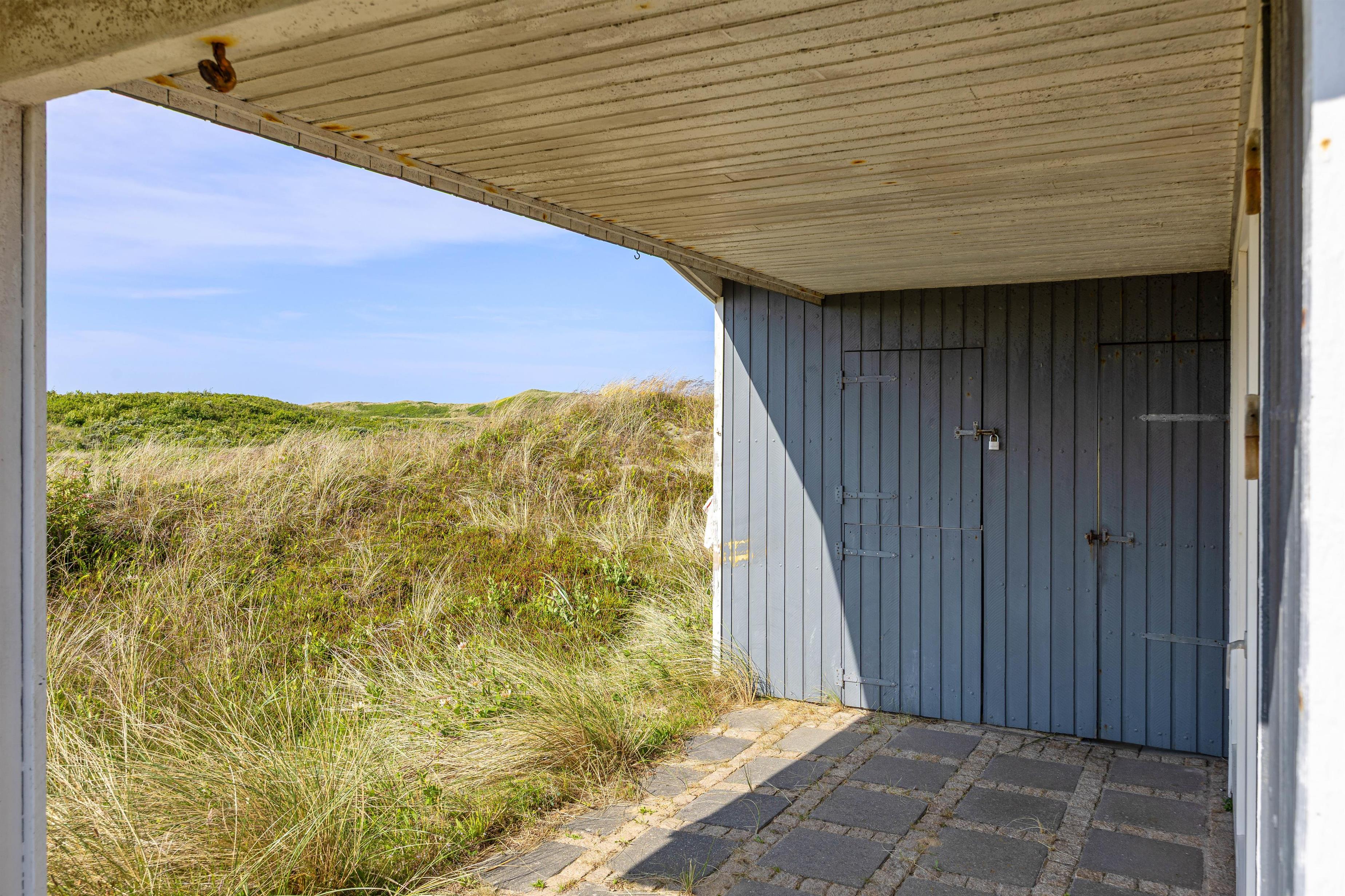 Der er både en overdækket og en afskærmet del af terrassen, hvor I kan finde læ og nyde en kop kaffe eller et måltid. Den omkringliggende grund er på ca. 1.270 m², og der er mulighed for at grille på sommeraftener, hvis vejret tillader det. Udsigten er præget af den omkringliggende naturgrund og klitlandskab.