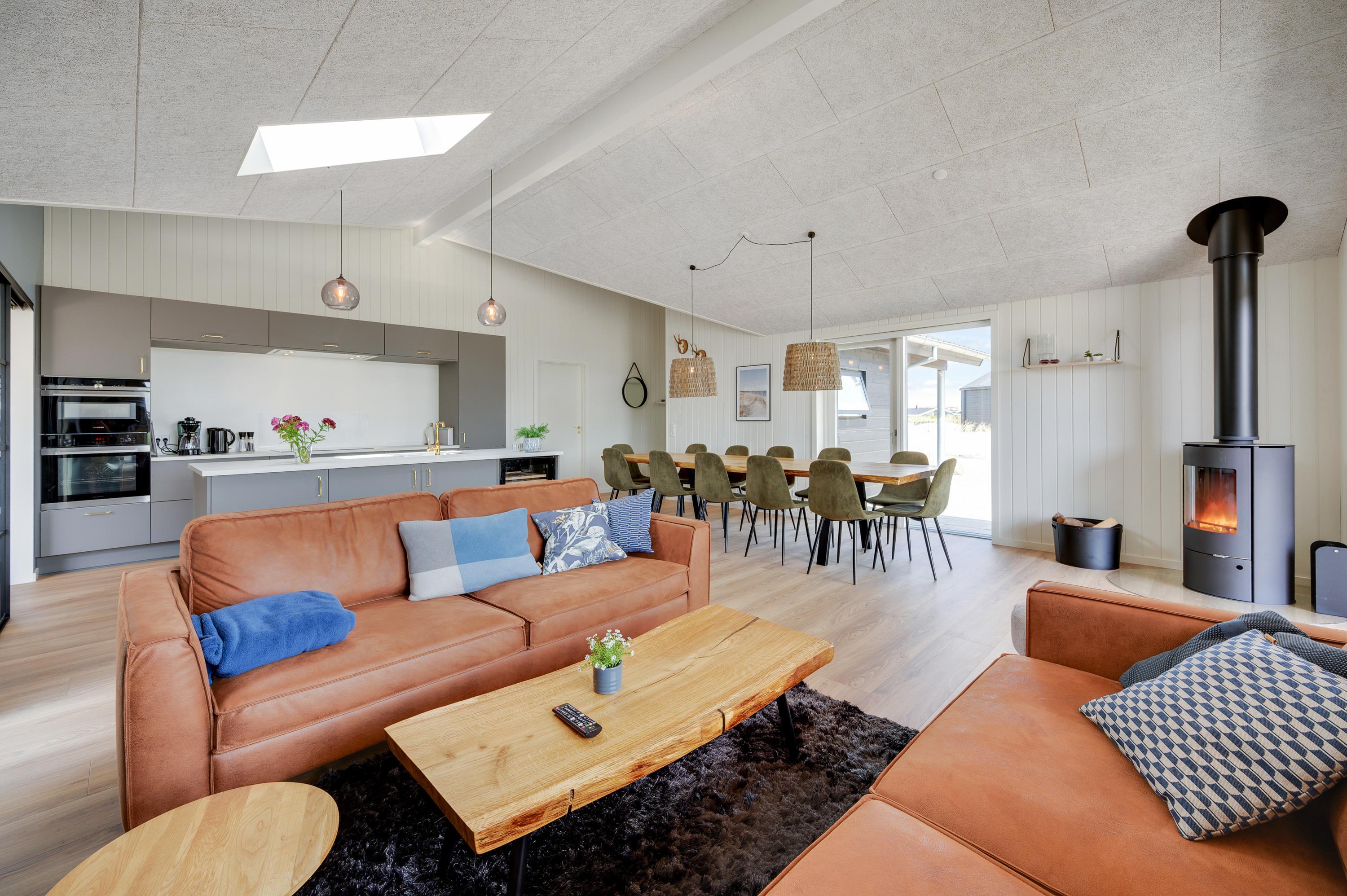 Sommerhuset byder dig velkommen med moderne møbler i indbydende og varme farver. I midten af sommerhuset finder I den store opholdsstue, som ligger i åben forbindelse med køkkenet. Stuens sofahjørne indbyder til hyggelige stunder med familien, hvad enten det er til en filmaften eller et spil kort. Der er en Chromecast i feriehuset, som I kan benytte jer af.