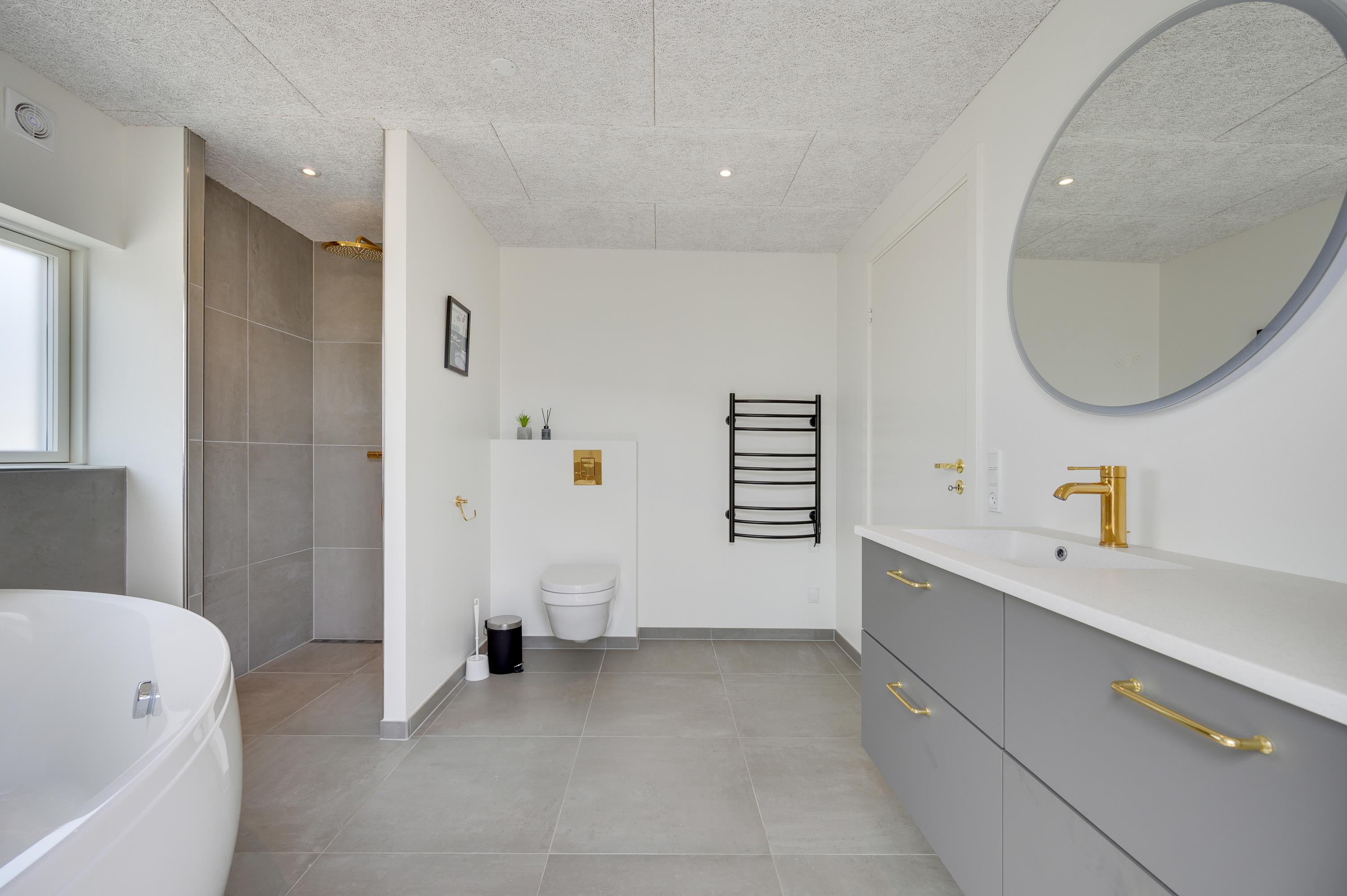 De 2 badeværelser er udstyret med gulvvarme, og på det ene står et badekar klar efter en frisk gåtur ved Vesterhavet. Desuden er der også både vaskemaskine og tørretumbler.