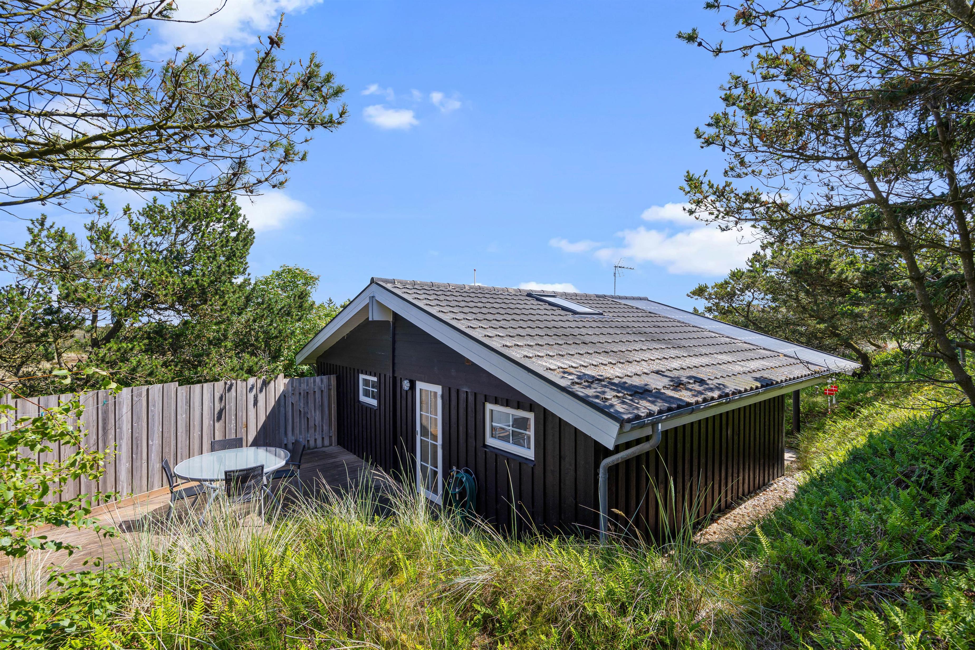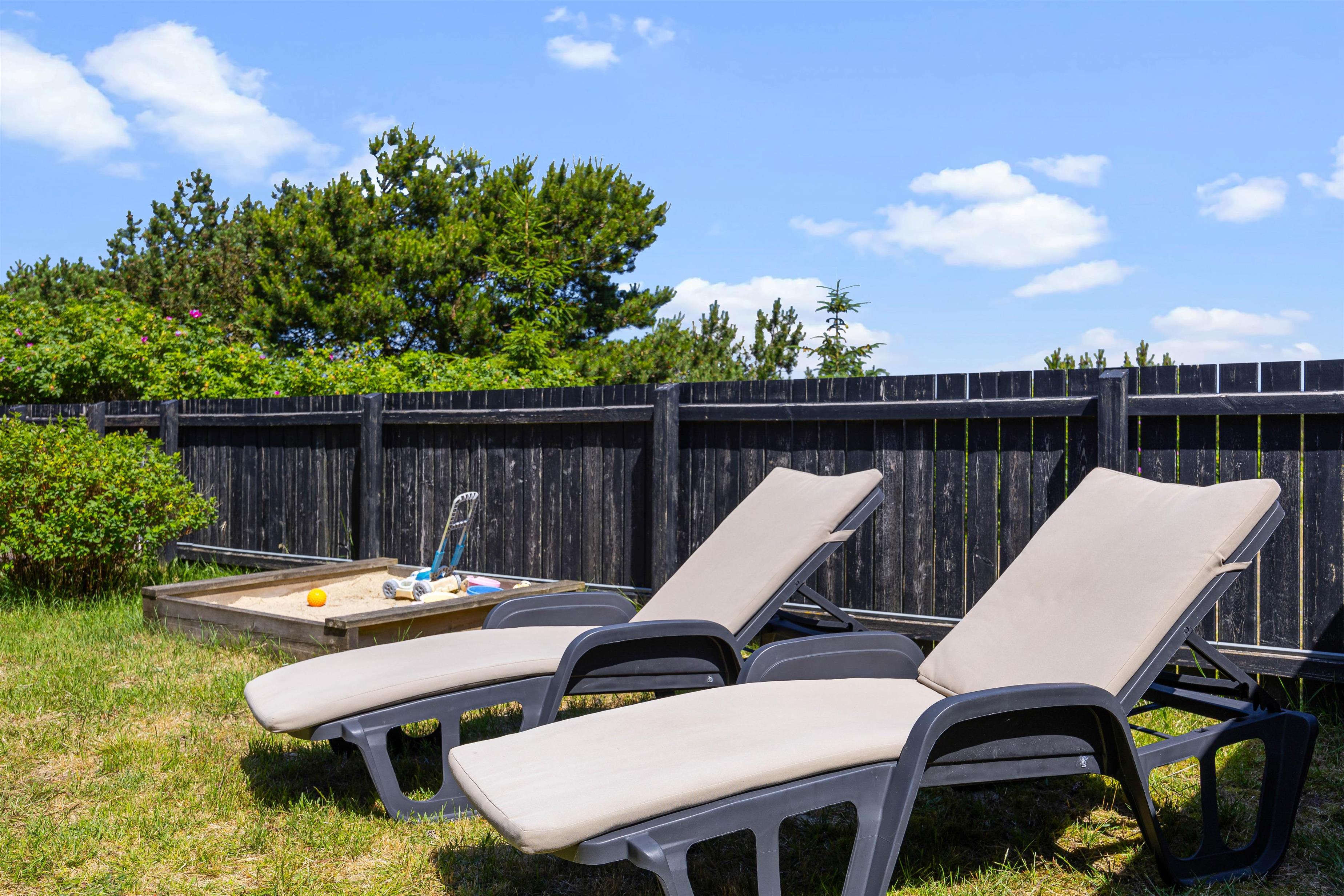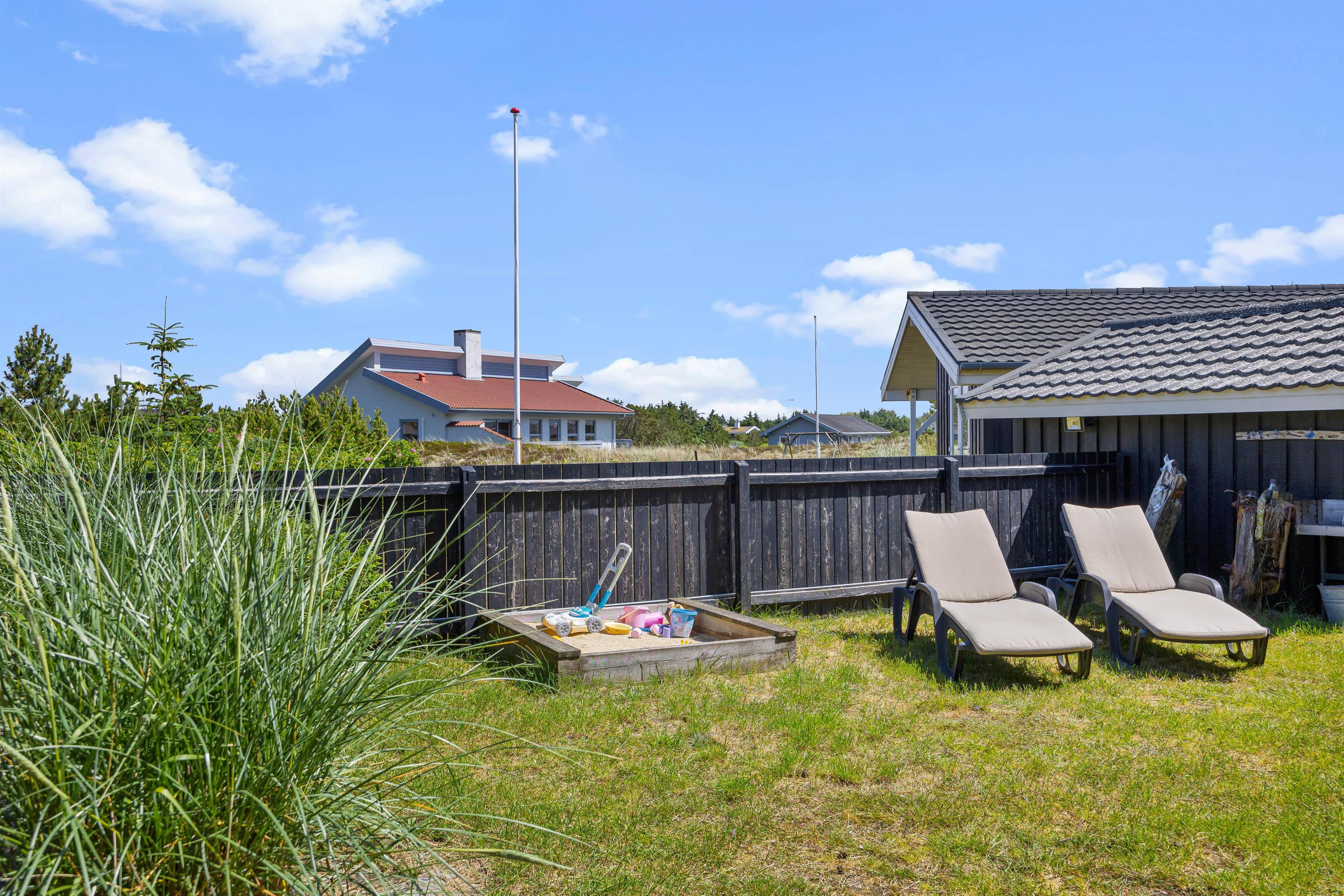 Feriehuset "Klitbo" ligger på en 1220 kvadratmeter stor klitgrund. De bølgende klitter, marehalm, buske og træer på grunden gør, at I kan opholde jer ugenert og altid kan finde en plet med læ. Tag solbad i liggestolene eller slap af i havemøblerne, imens børnene leger i sandkassen. Terrassen er delvist overdækket, så en enkelt regnbyge er ikke noget problem. Tænd op i grillen, når skyggerne bliver lange, og nyd et lækkert grillmåltid sammen i den friske havluft. Bagefter kan I nå en tur til stranden og opleve solnedgangen i Vesterhavet.