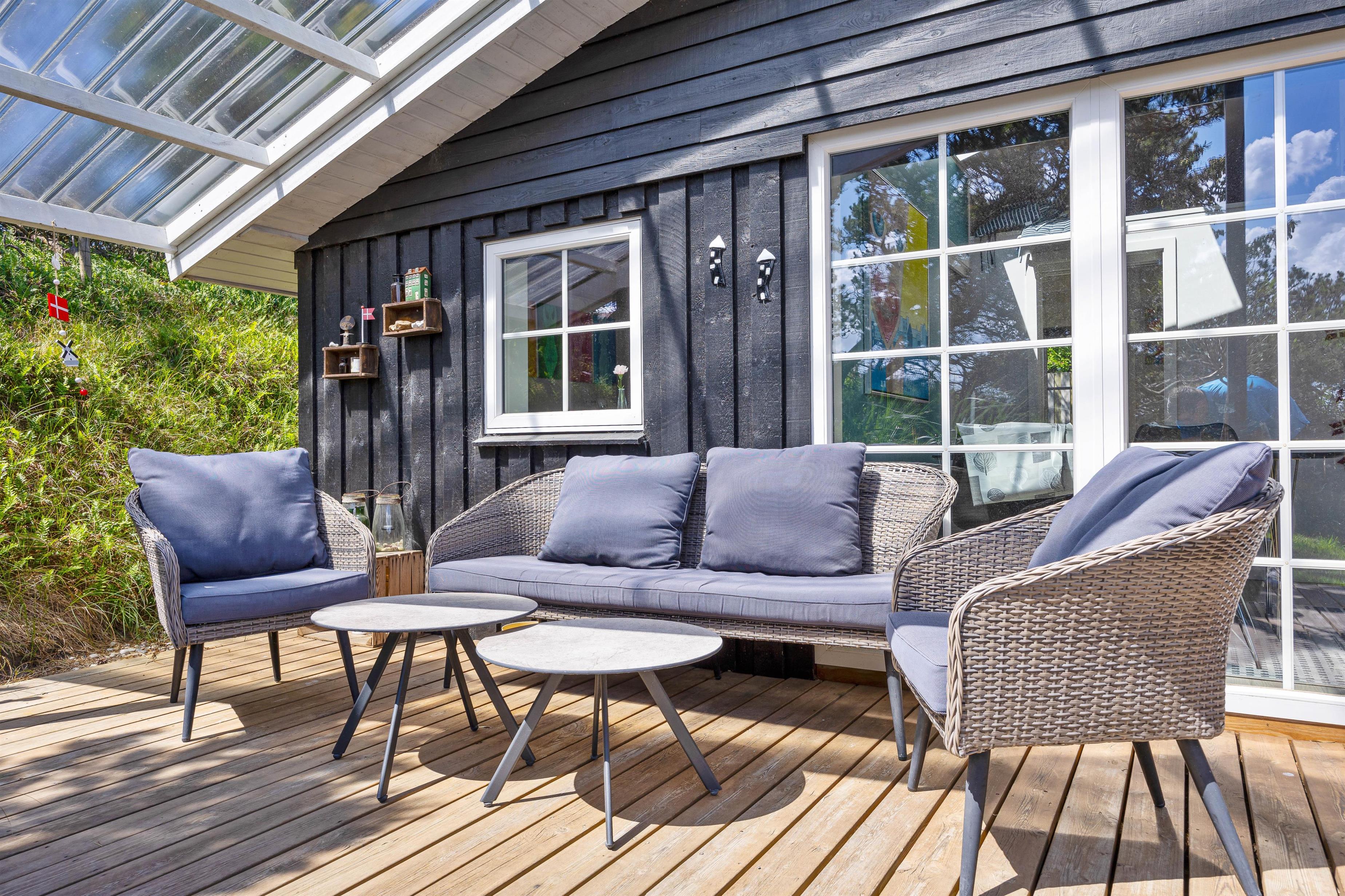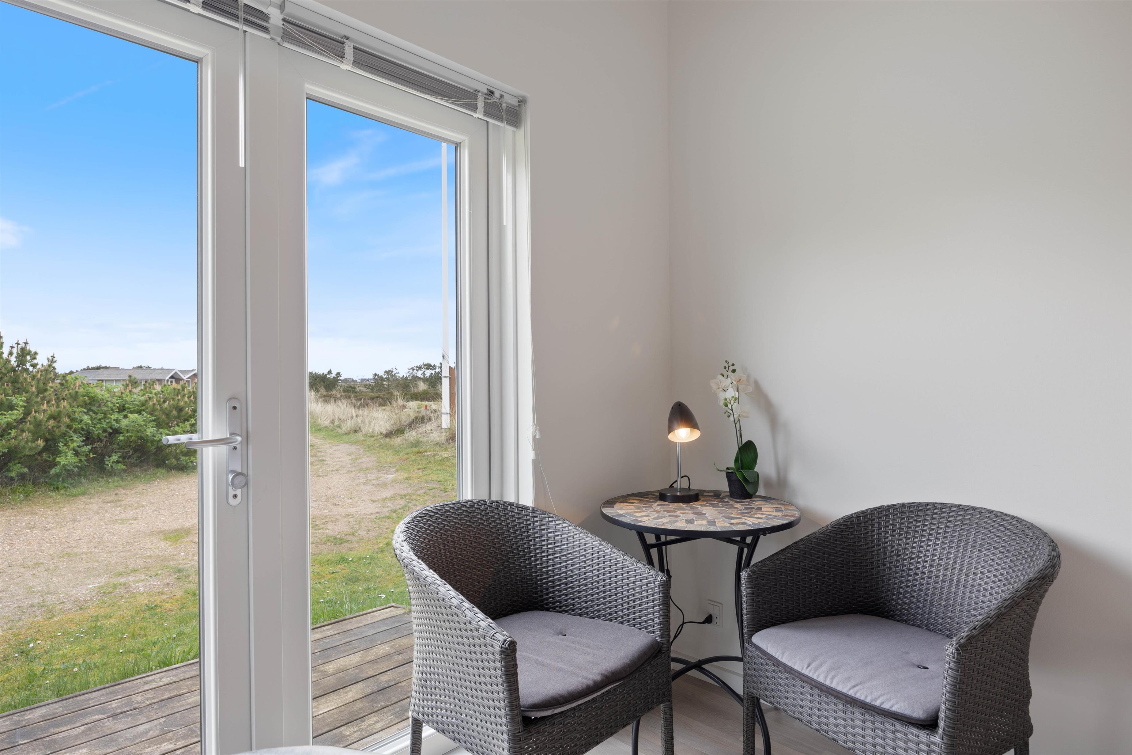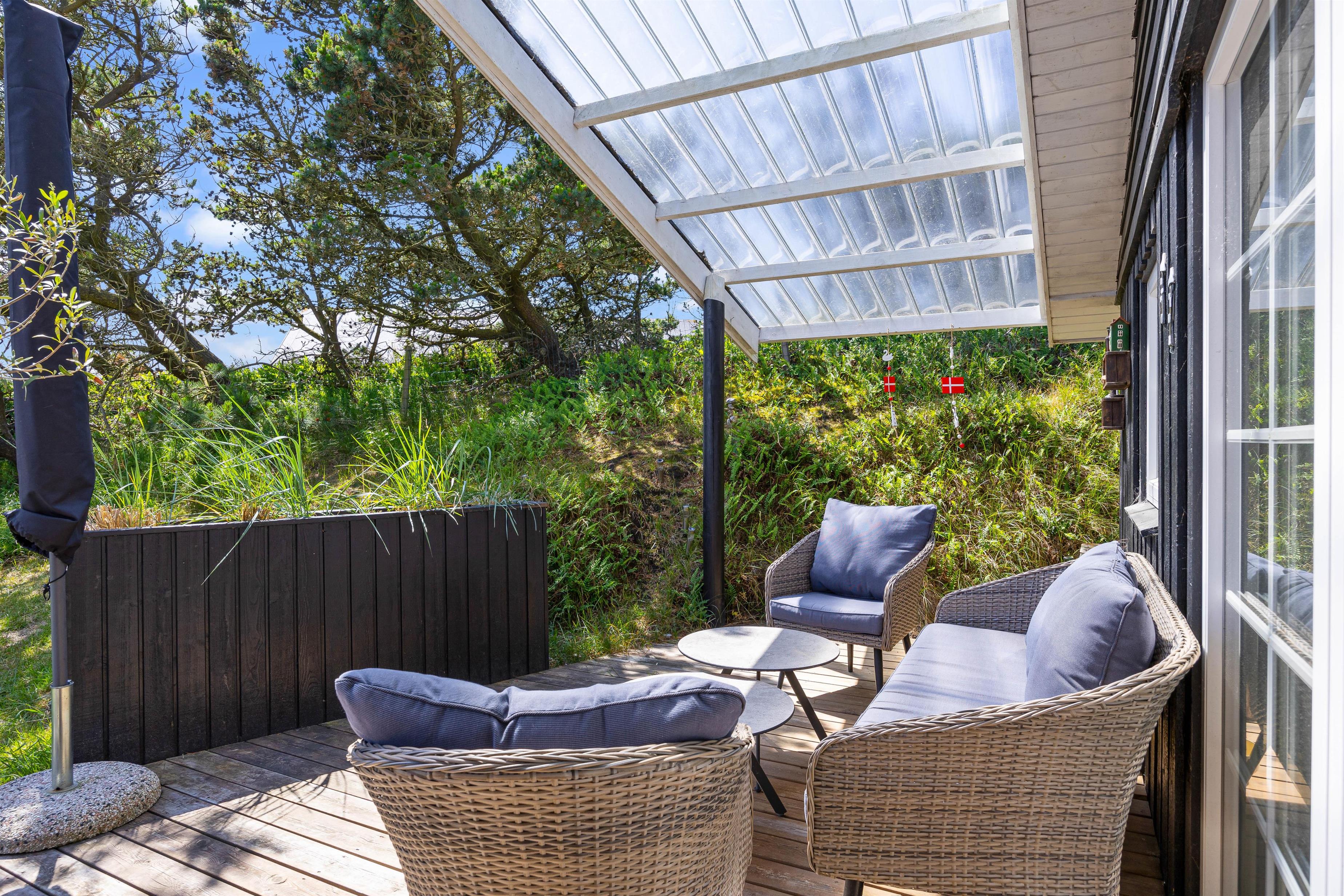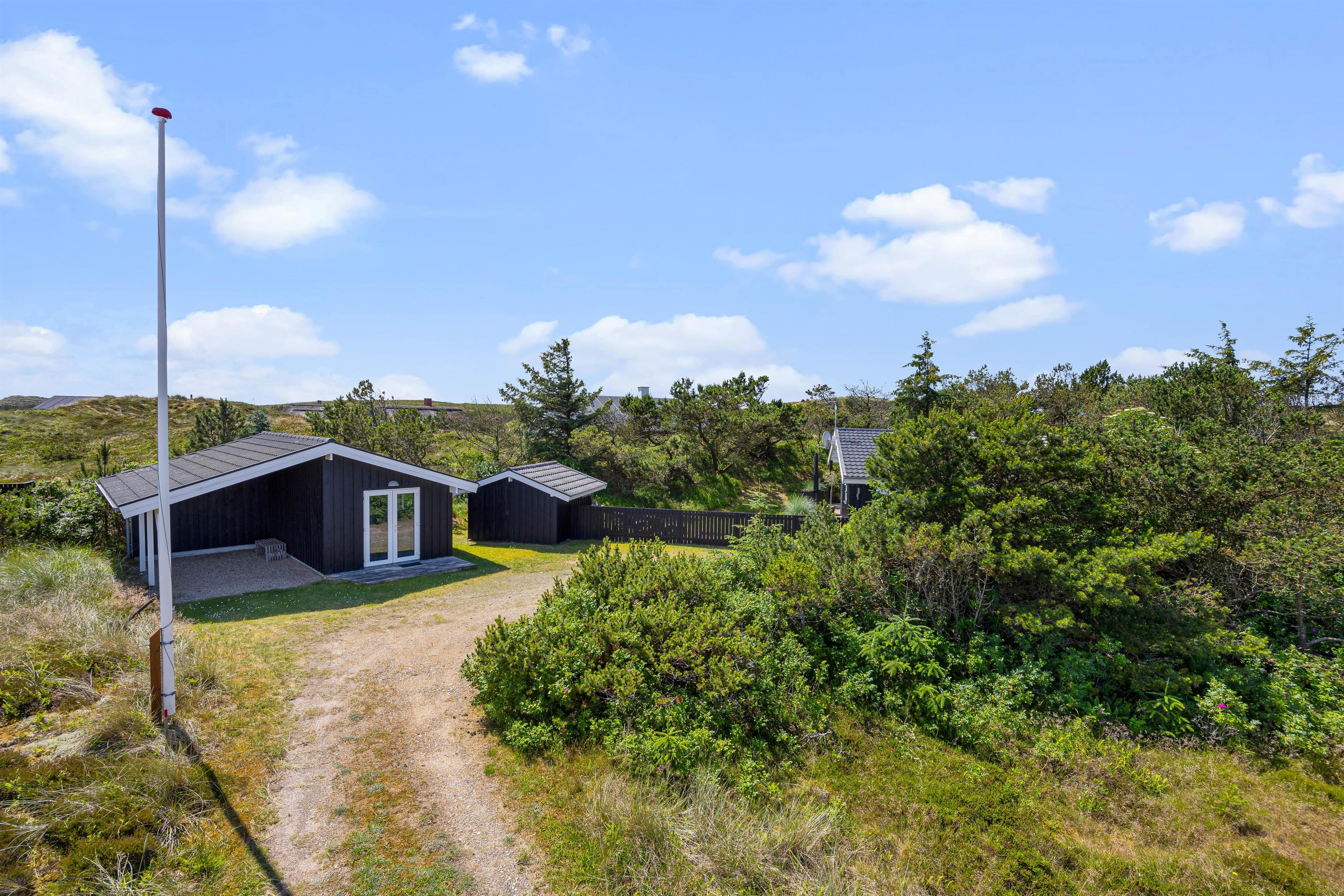 Feriehuset "Klitbo" ligger på en 1220 kvadratmeter stor klitgrund. De bølgende klitter, marehalm, buske og træer på grunden gør, at I kan opholde jer ugenert og altid kan finde en plet med læ. Tag solbad i liggestolene eller slap af i havemøblerne, imens børnene leger i sandkassen. Terrassen er delvist overdækket, så en enkelt regnbyge er ikke noget problem. Tænd op i grillen, når skyggerne bliver lange, og nyd et lækkert grillmåltid sammen i den friske havluft. Bagefter kan I nå en tur til stranden og opleve solnedgangen i Vesterhavet.