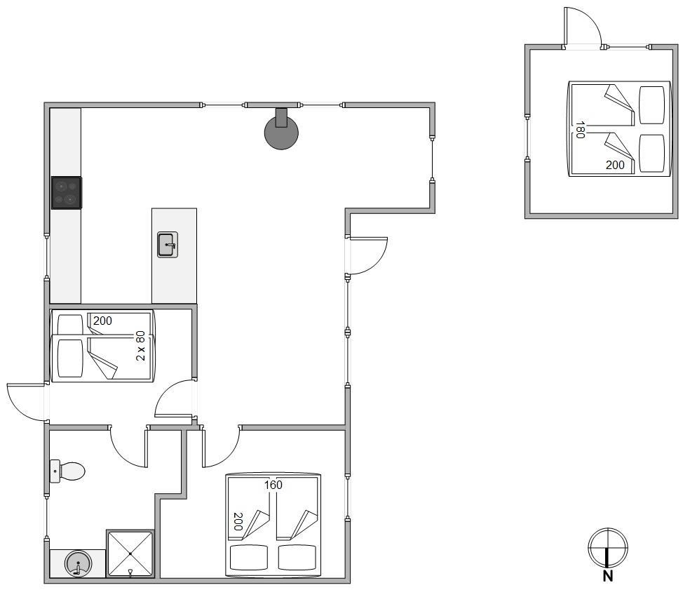 På de 63 velindrettede kvadratmeter finder du også et moderne badeværelse med dagslys og gulvvarme, et hyggeligt soveværelse med dobbeltseng og et soveværelse med køjesenge. Det sidste soveværelse, som også har en komfortabel dobbeltseng, ligger i det rummelige anneks. Der er barneseng og højstol til de små.
