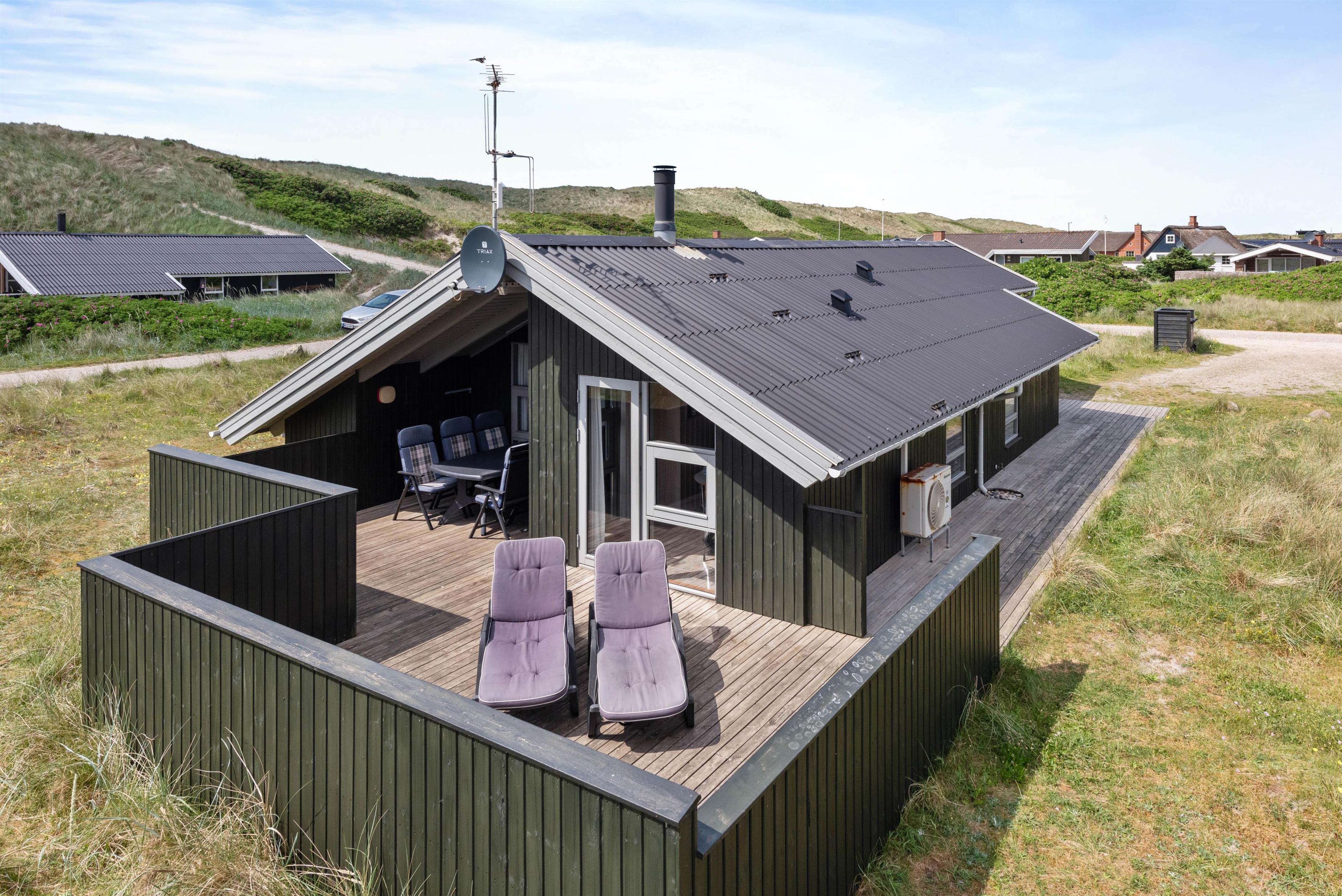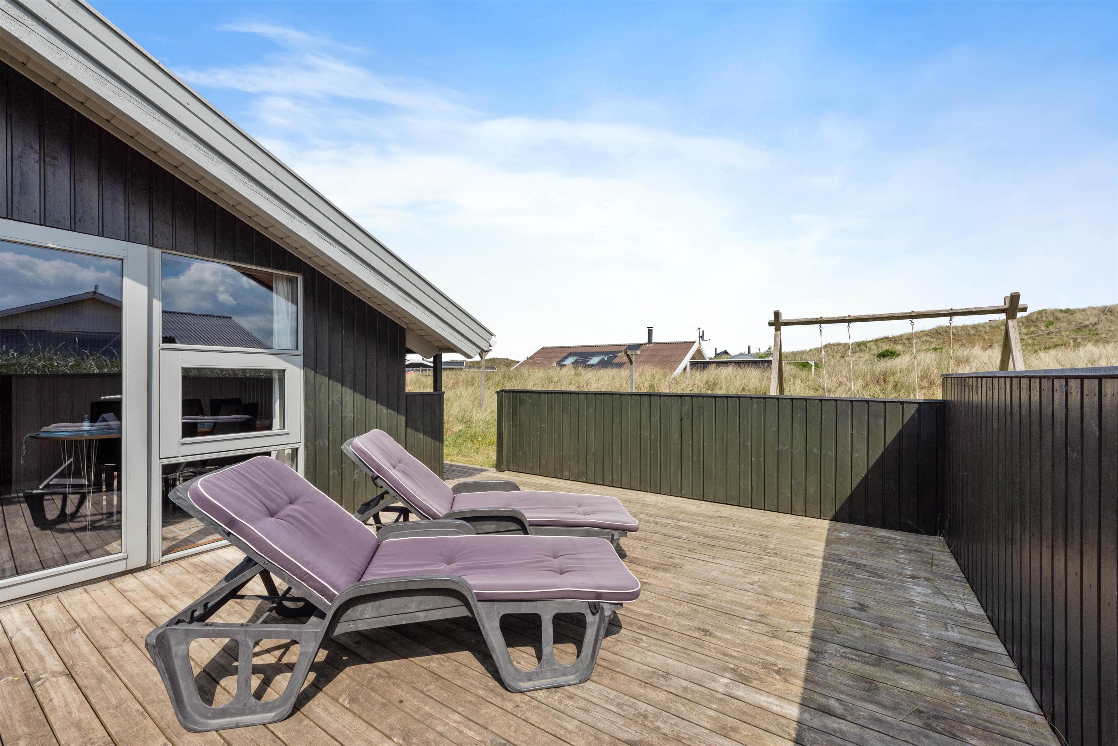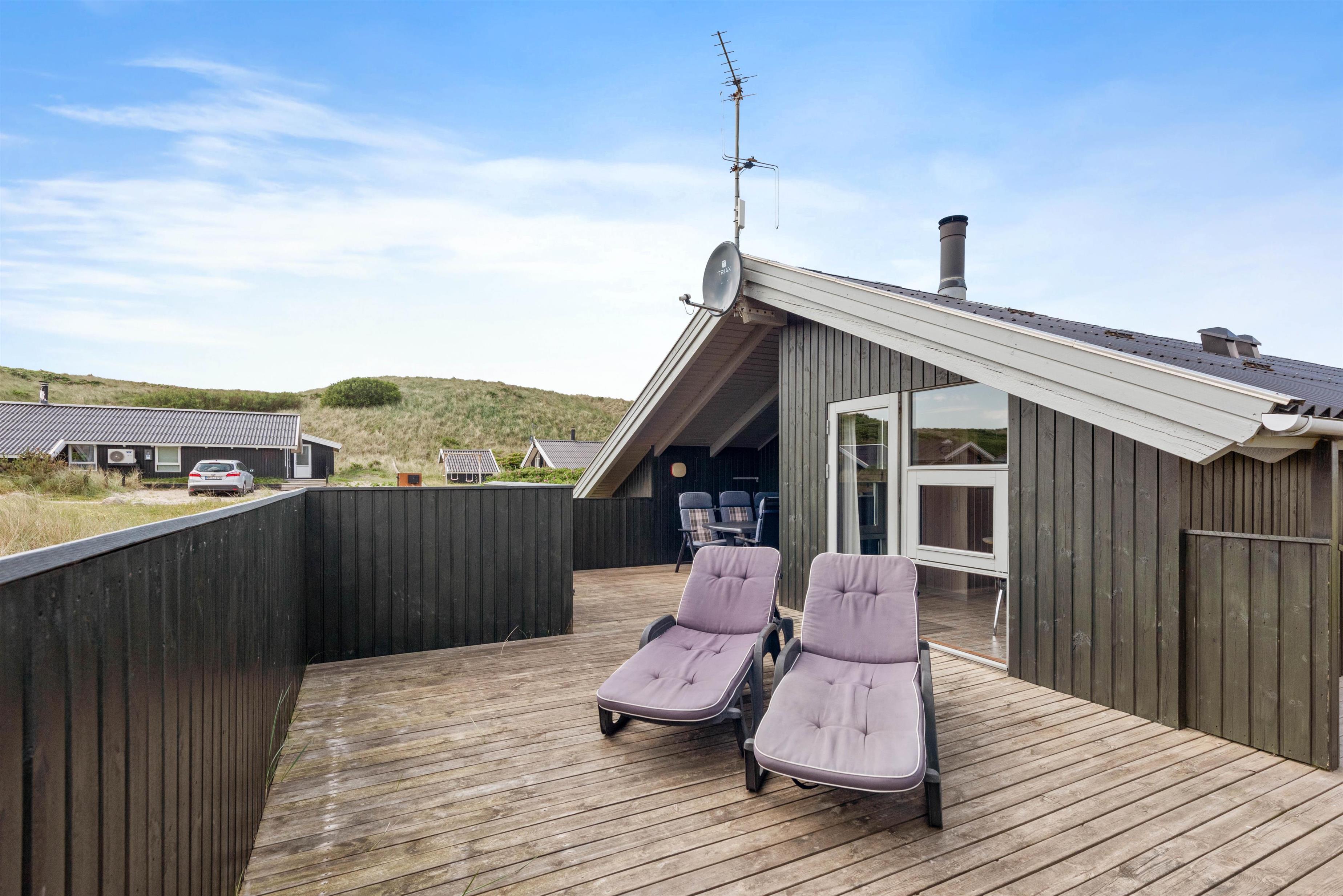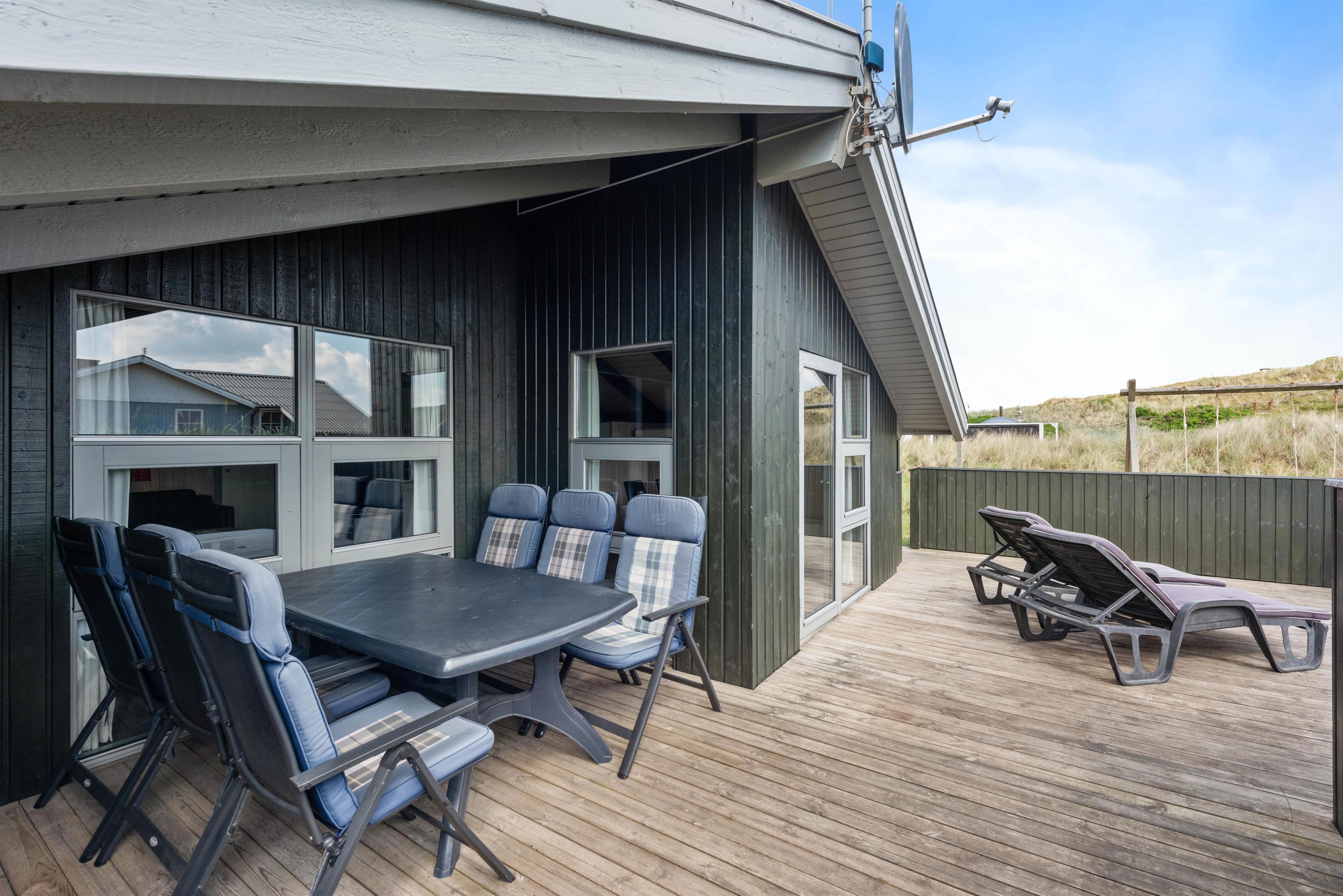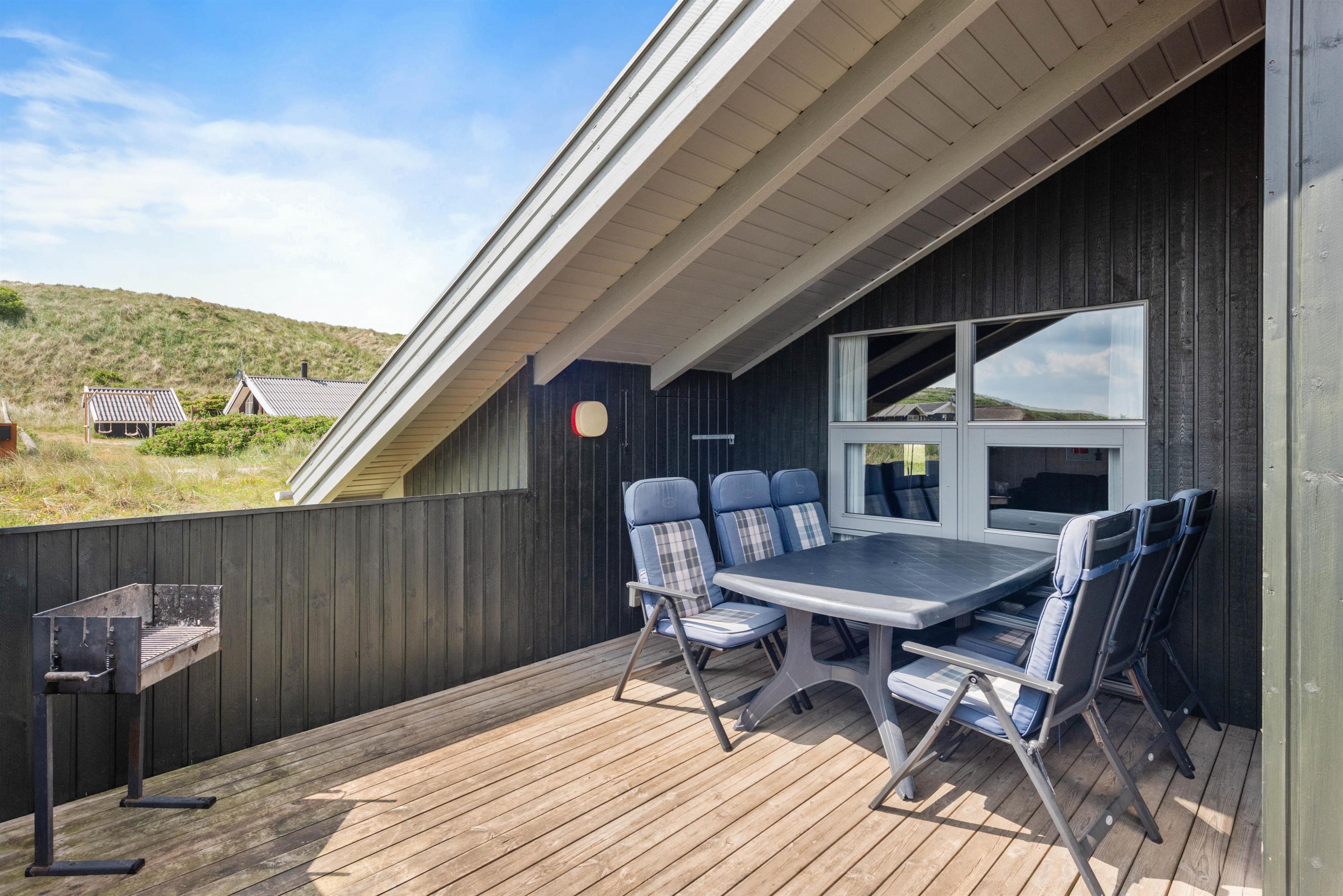 På den afskærmede og delvist overdækkede terrasse, kan I nyde den friske luft og lytte til bølgernes brusen. Nyd morgenkaffen og tænd til aften op i grillen – her kan I tilberede et lækkert måltid. Fra terrassen kan I nyde udsigten udover det smukke klitlandskab, hvor stierne fører ned til Vesterhavet. Tag hundene med, flyv med drage og bliv kølet ned med fødderne i vandkanten.