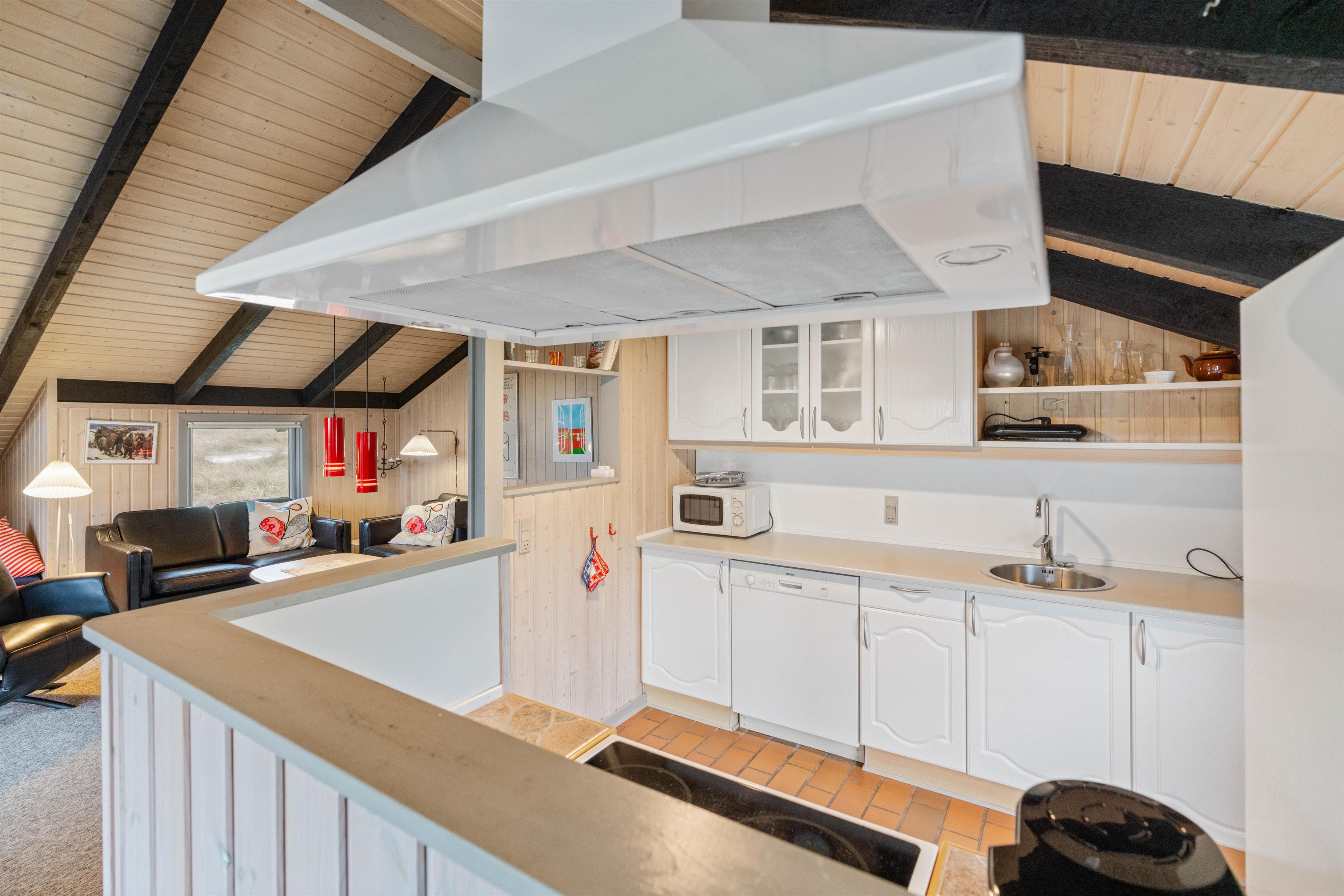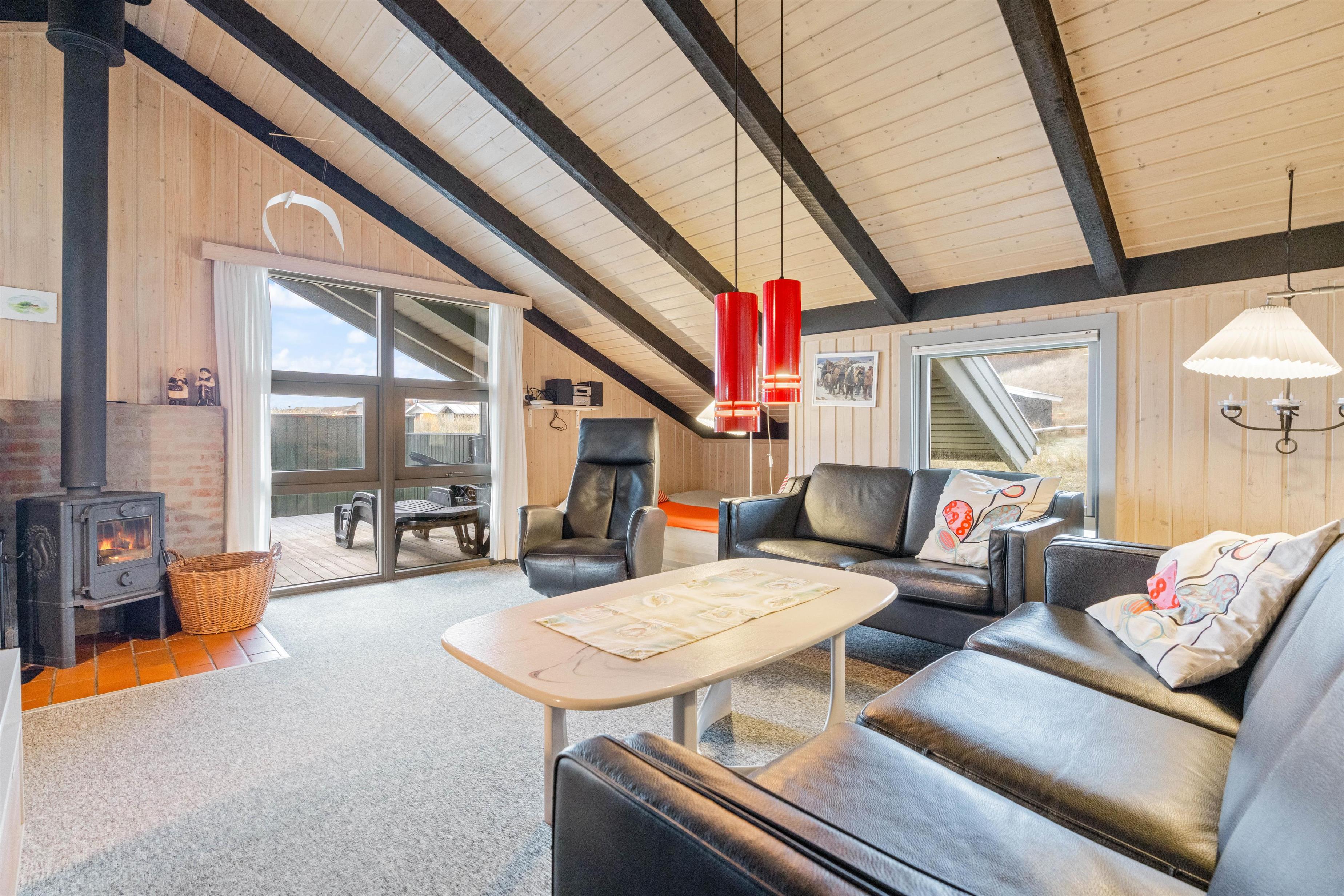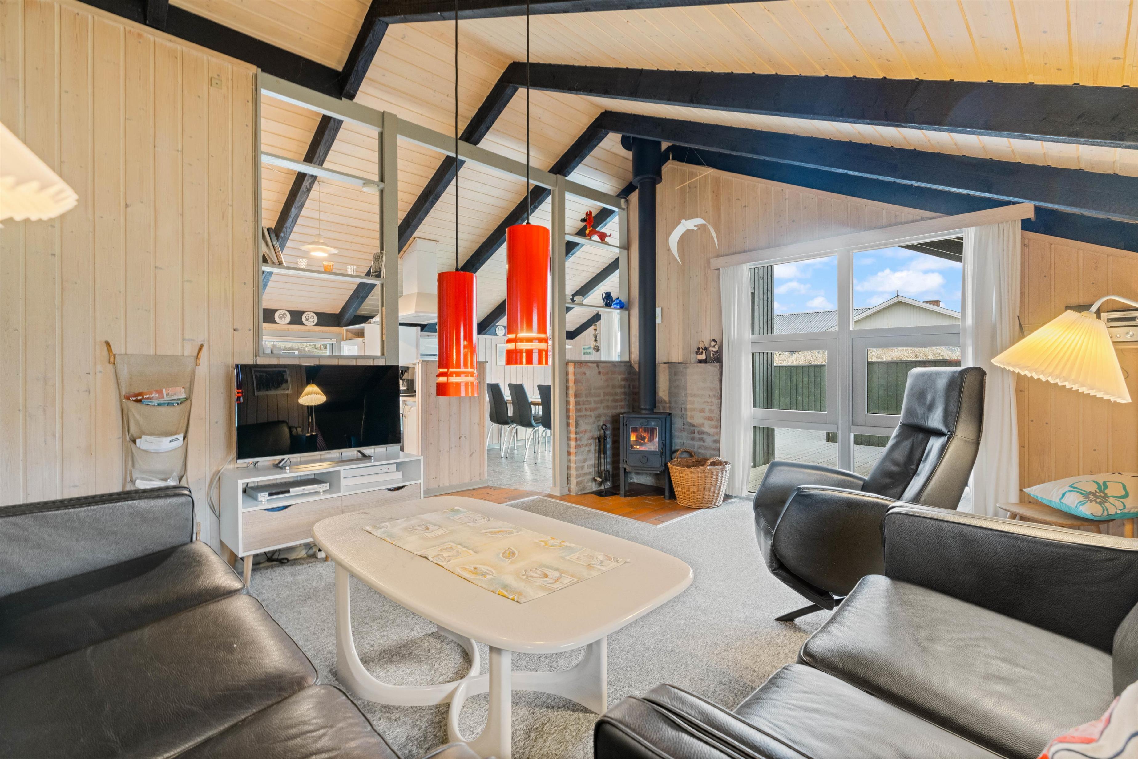 Stue og køkken ligger i åben forbindelse og loftet til kip skaber en rummelig fornemmelse. I stuen er der en dejlig brændeovn, som kan varme feriehuset op på nogle få timer. Sæt jer til rette i sofaen med en god bog, og mærk varmen brede sig. I stuen er der en skøn alkove, der kan bruges som soveplads eller afslapningshjørne.