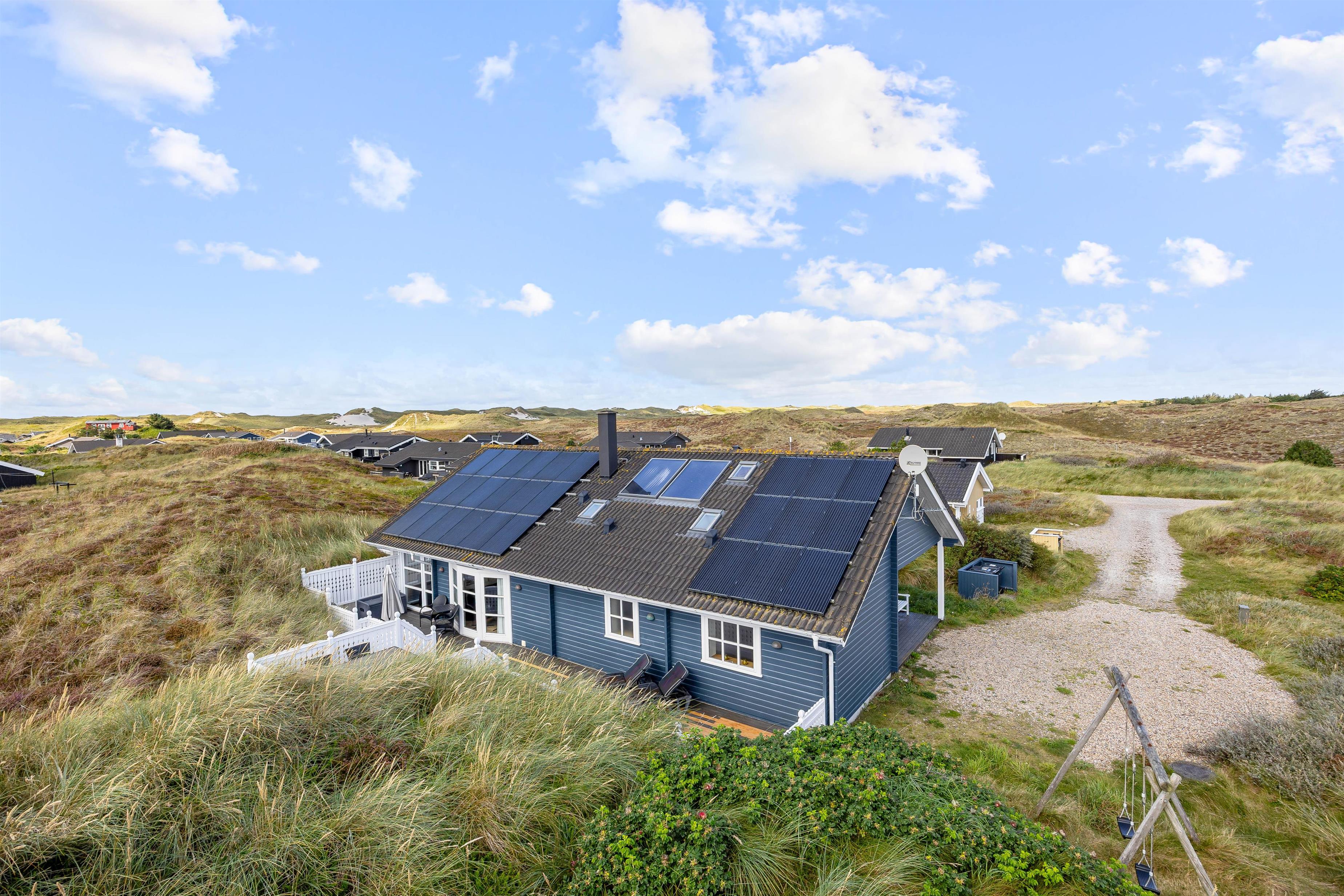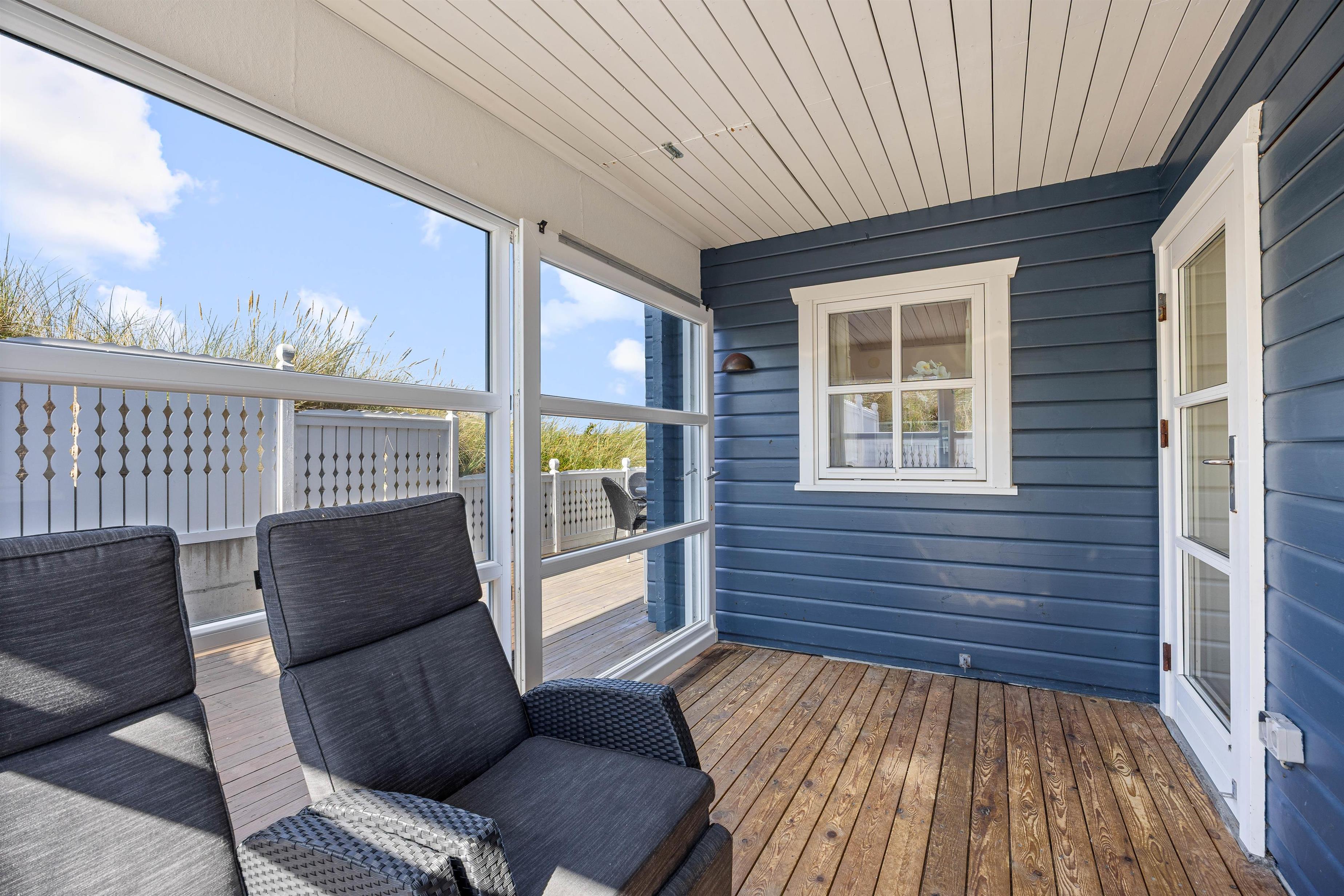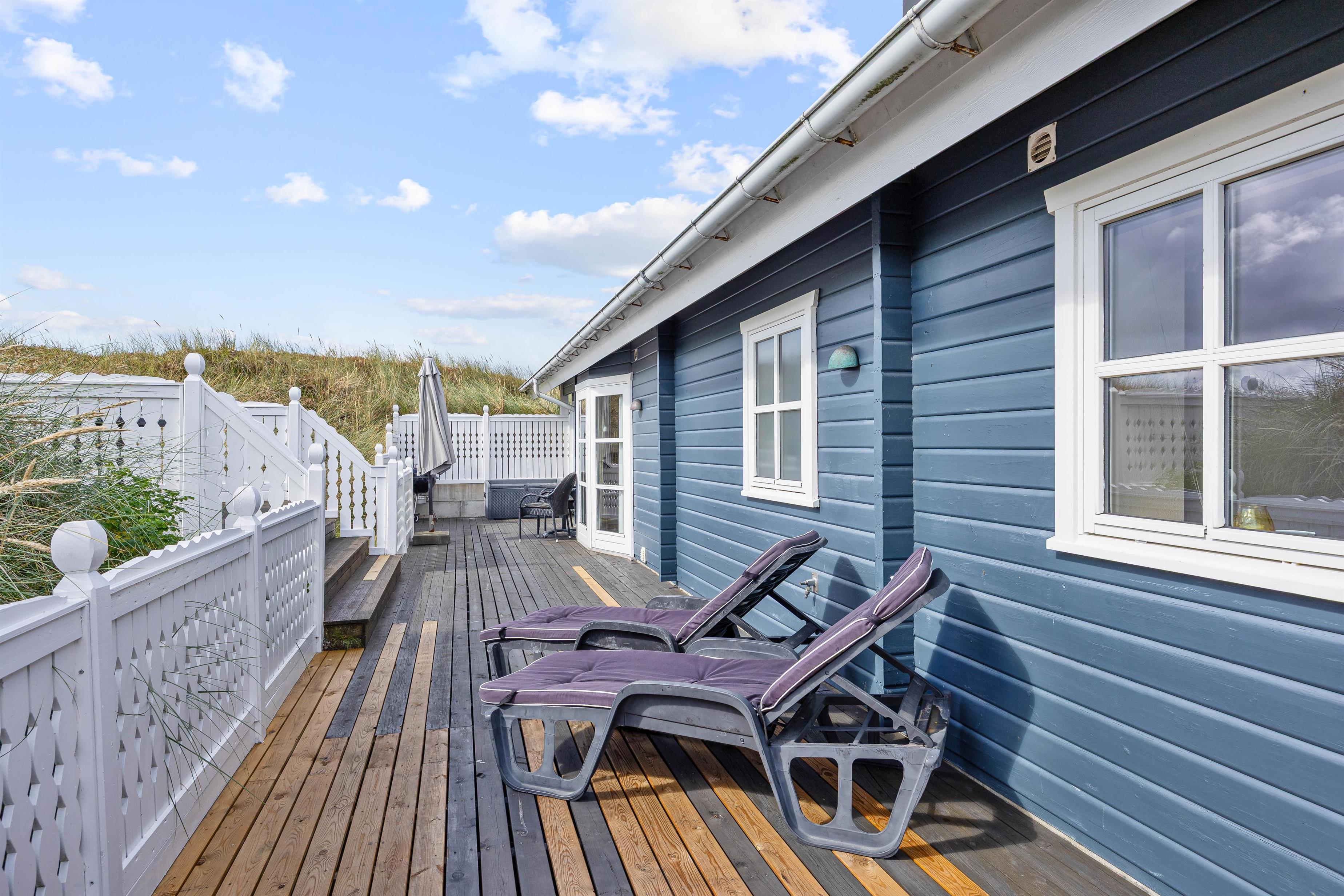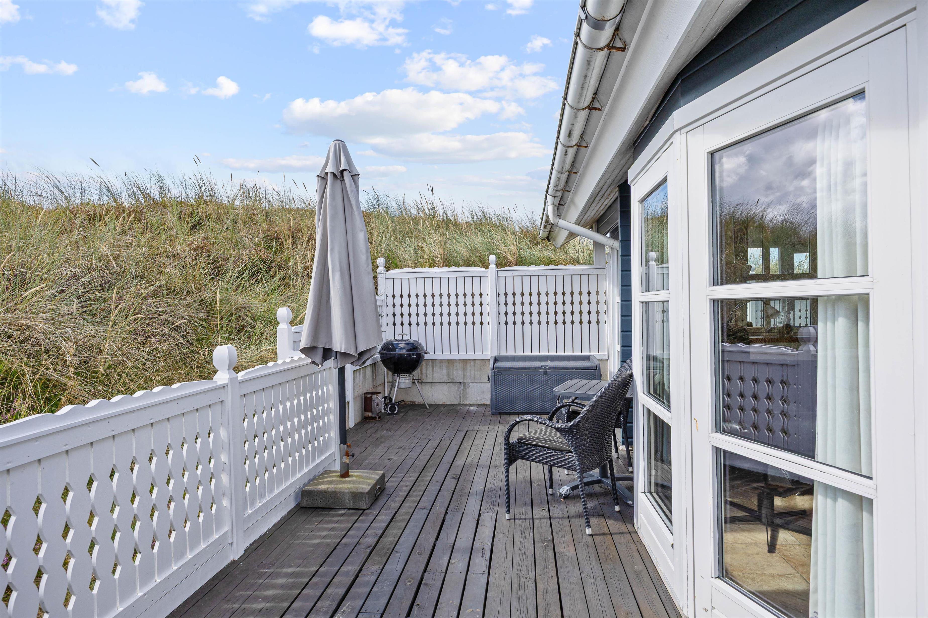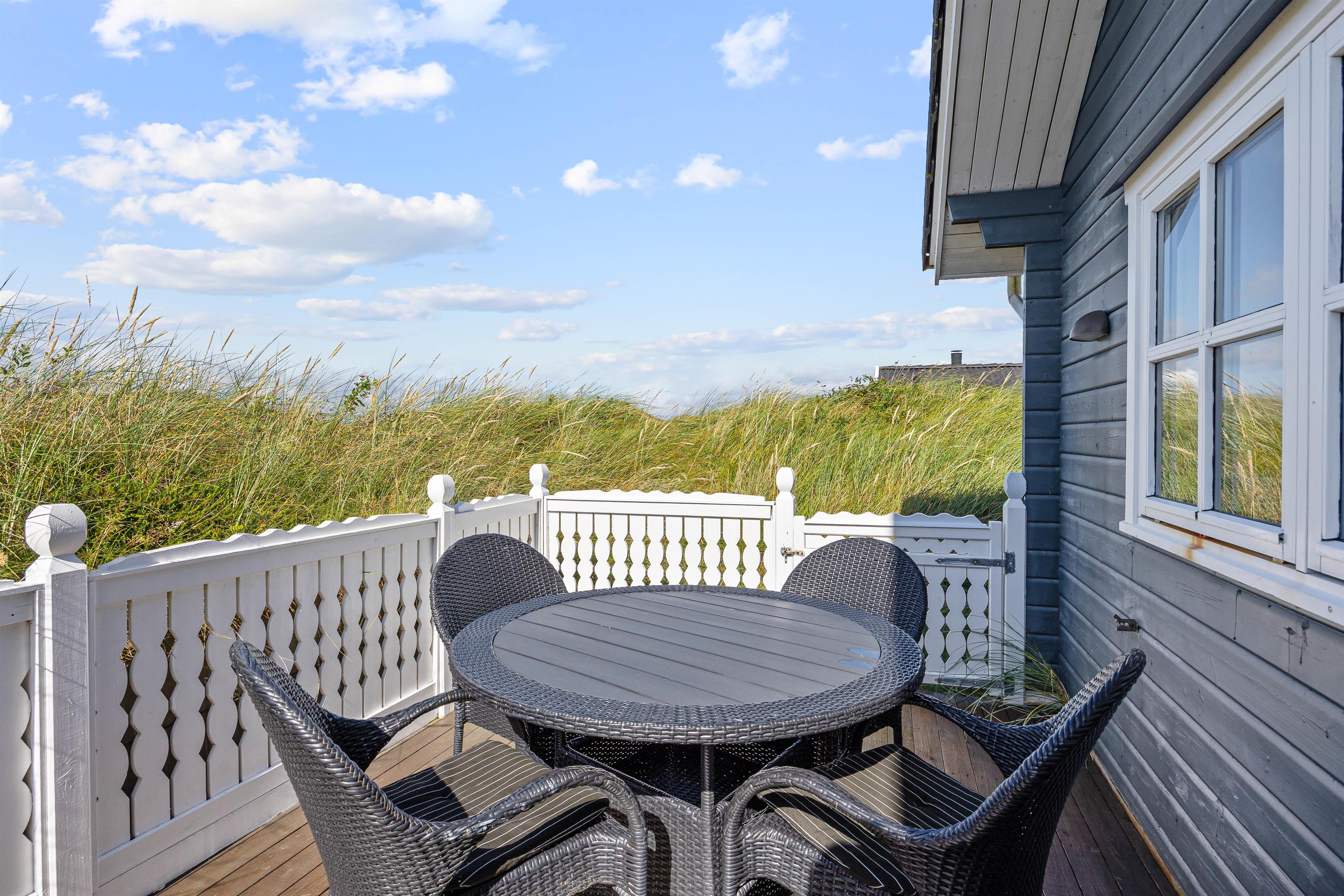 På den skønne, lukkede terrasse kan I uforstyrret kan nyde morgenkaffen og hyggelige grillaftener. En del af terrassen er overdækket, så selv i det til tider drilske danske sommervejr kan I sidde ude og nyde den friske vesterhavsluft. Fra terrassen har I en flot udsigt til de marehalmsklædte klitter, der kendetegner naturen ved Vesterhavet.