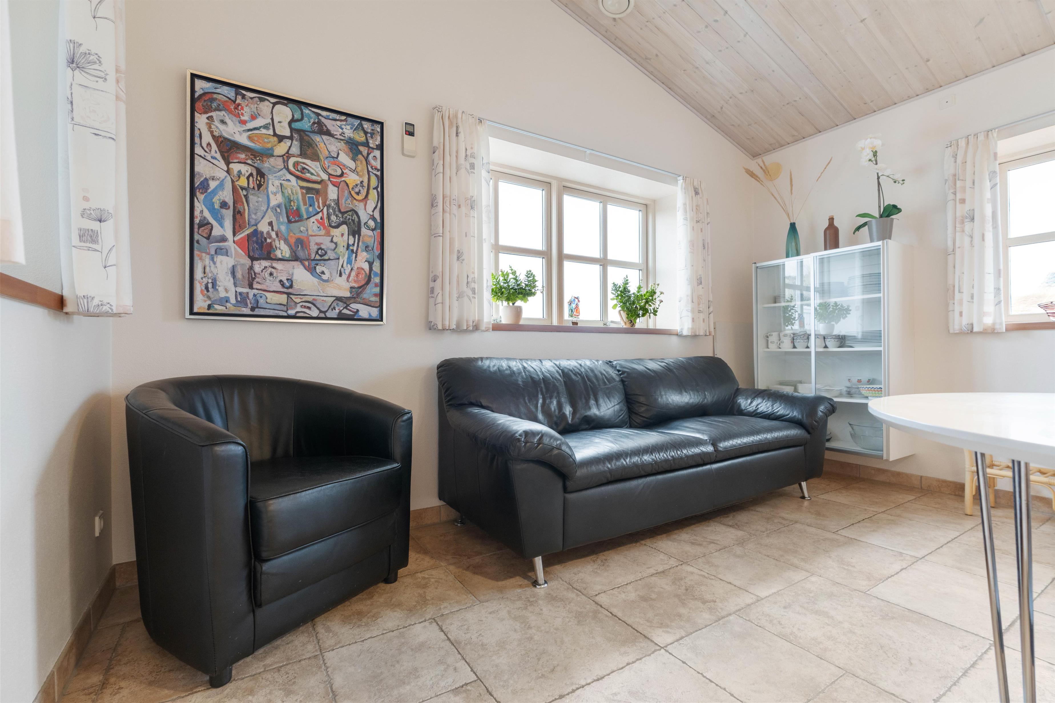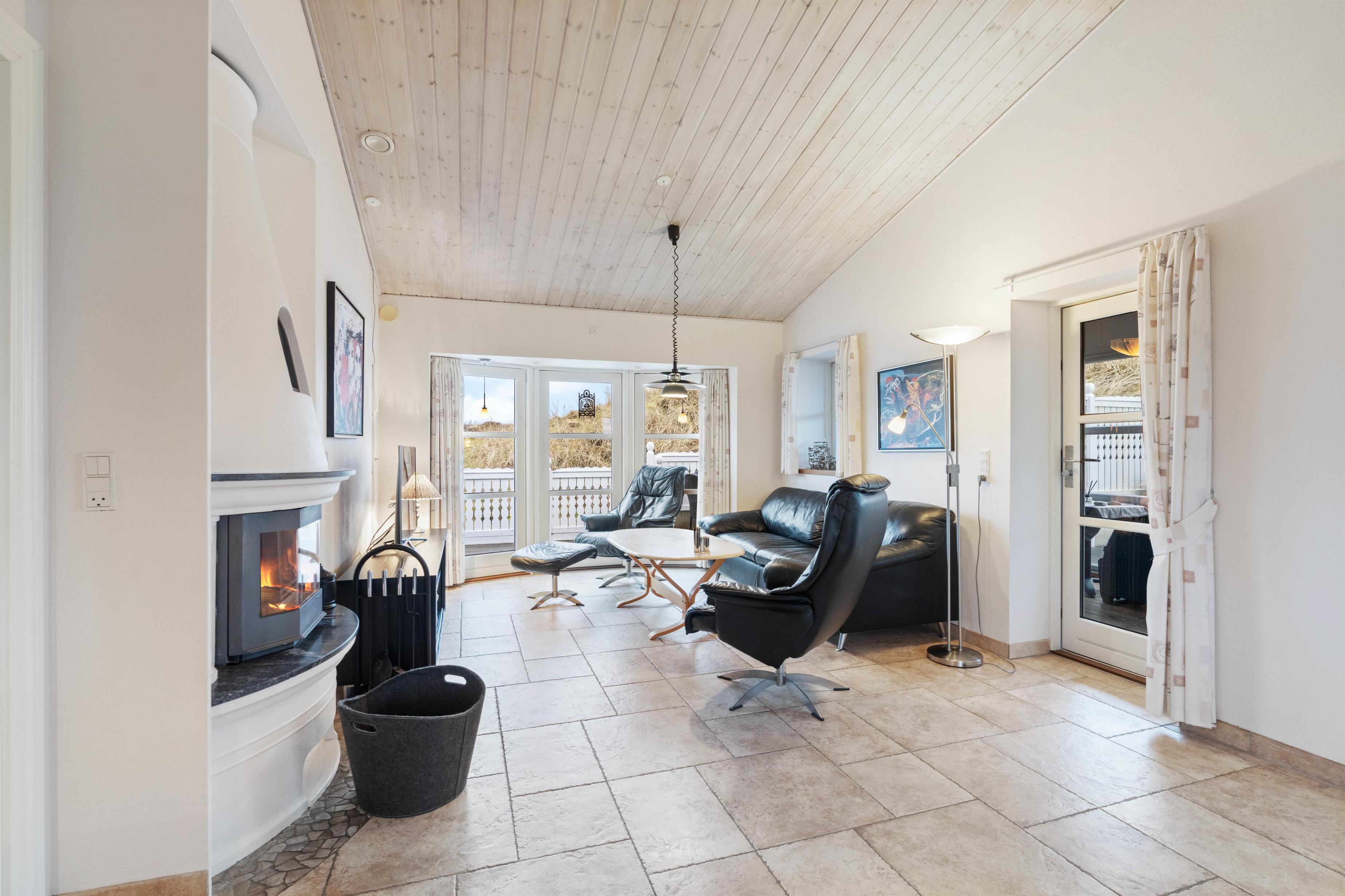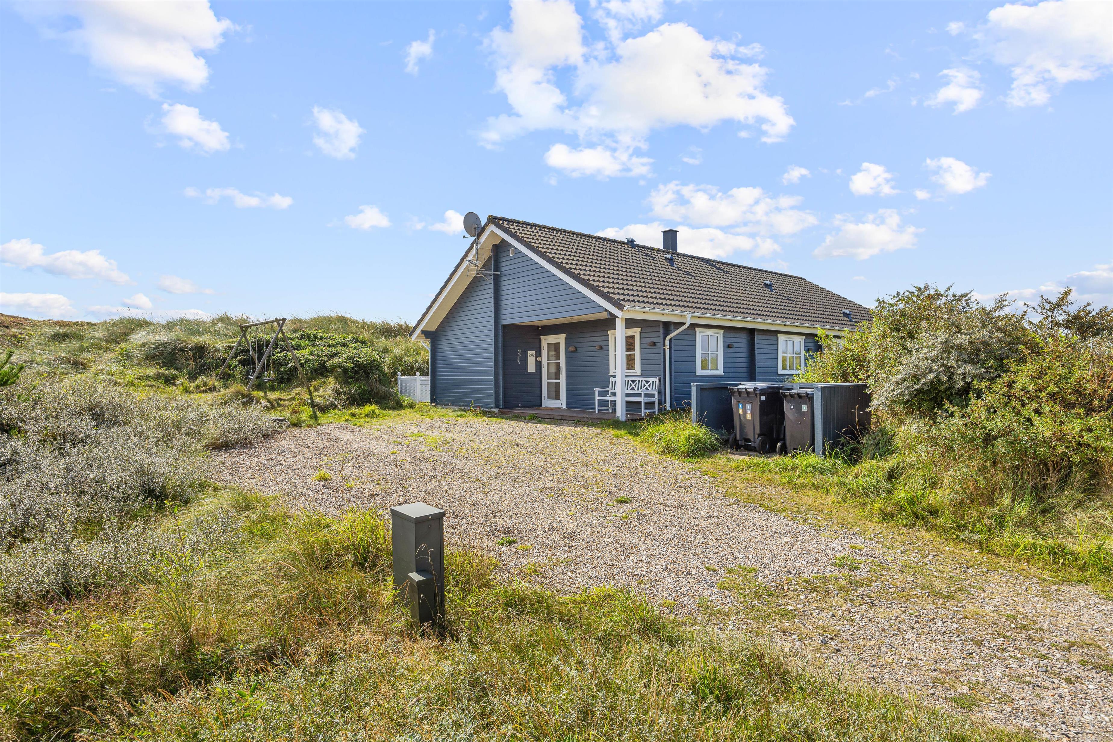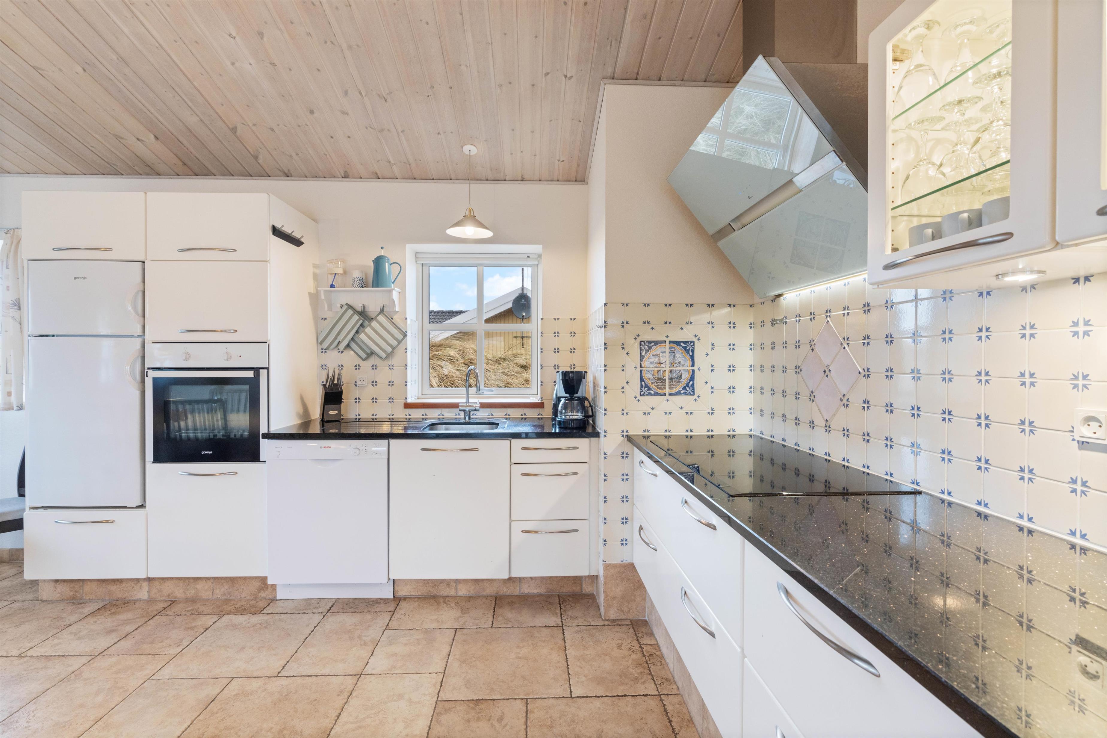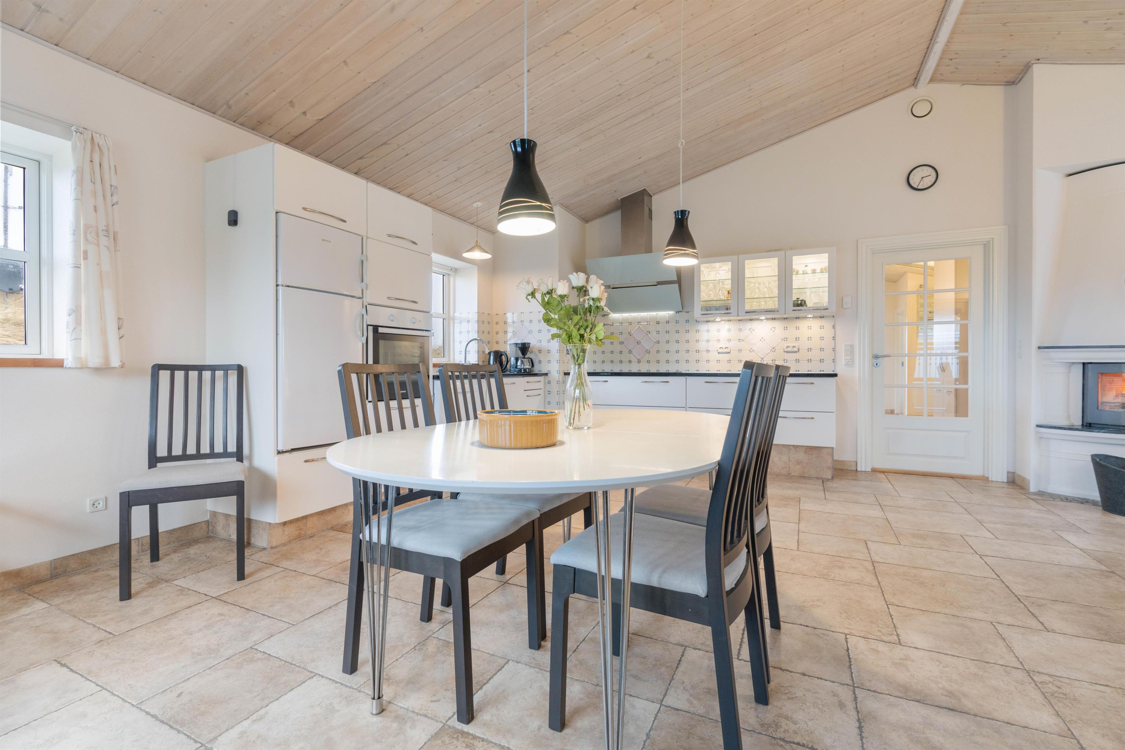 Feriehuset på Bjerregårdsvej 282 ligger for enden af en lille stikvej, så her kan I nyde en uforstyrret og afslappende ferie sammen. Man føler sig hjemme straks, man træder indenfor i det hyggelige køkken/alrum og opholdsstue. Det åbne køkken indeholder alt, hvad I behøver for at tilberede lækre hjemmelavede måltider til hinanden. Måltiderne nydes ved spisebordet – og her kan I også udfordre hinanden i et brætspil. Bagefter kan I trække jer tilbage i sofagruppen og hygge jer foran ilden i den store flotte pejs, eller I kan trække ud i udestuen med et glas vin, og nyde aftenskumringen der.