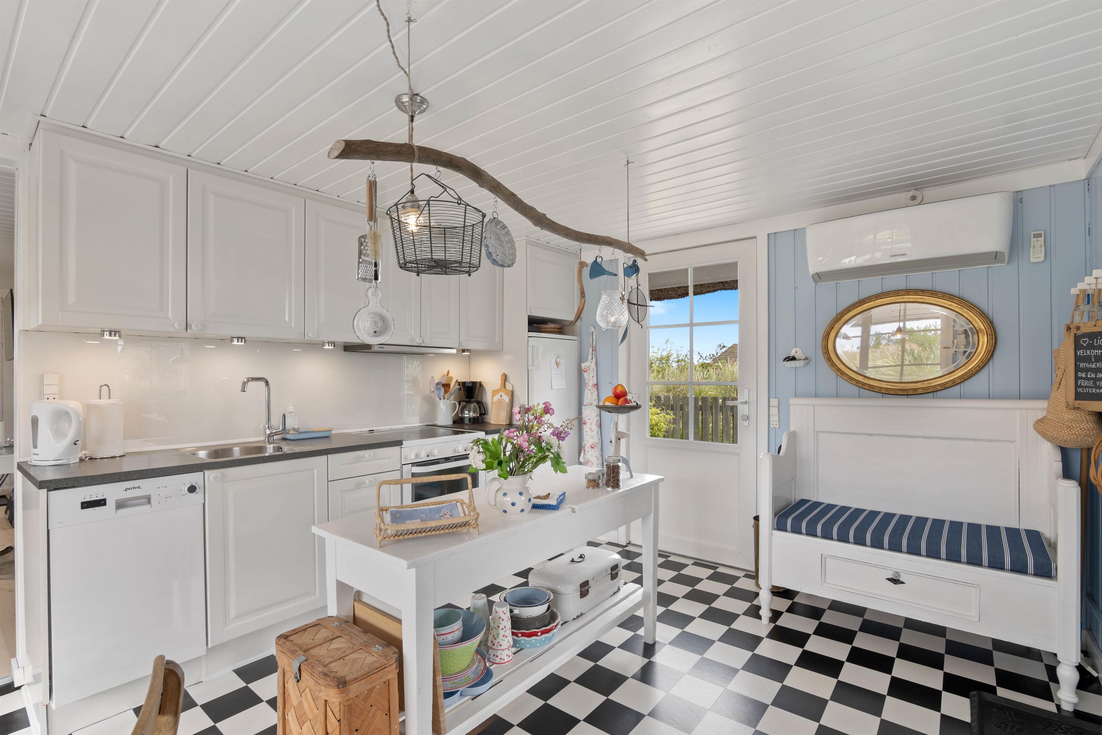 Køkkenalrummet er i forbindelse med den indbydende stue med brændeovn. Arrangér en hyggelig madlavningsaften med familie eller venner, læs en god roman foran ilden eller få en god snak omkring spisebordet.