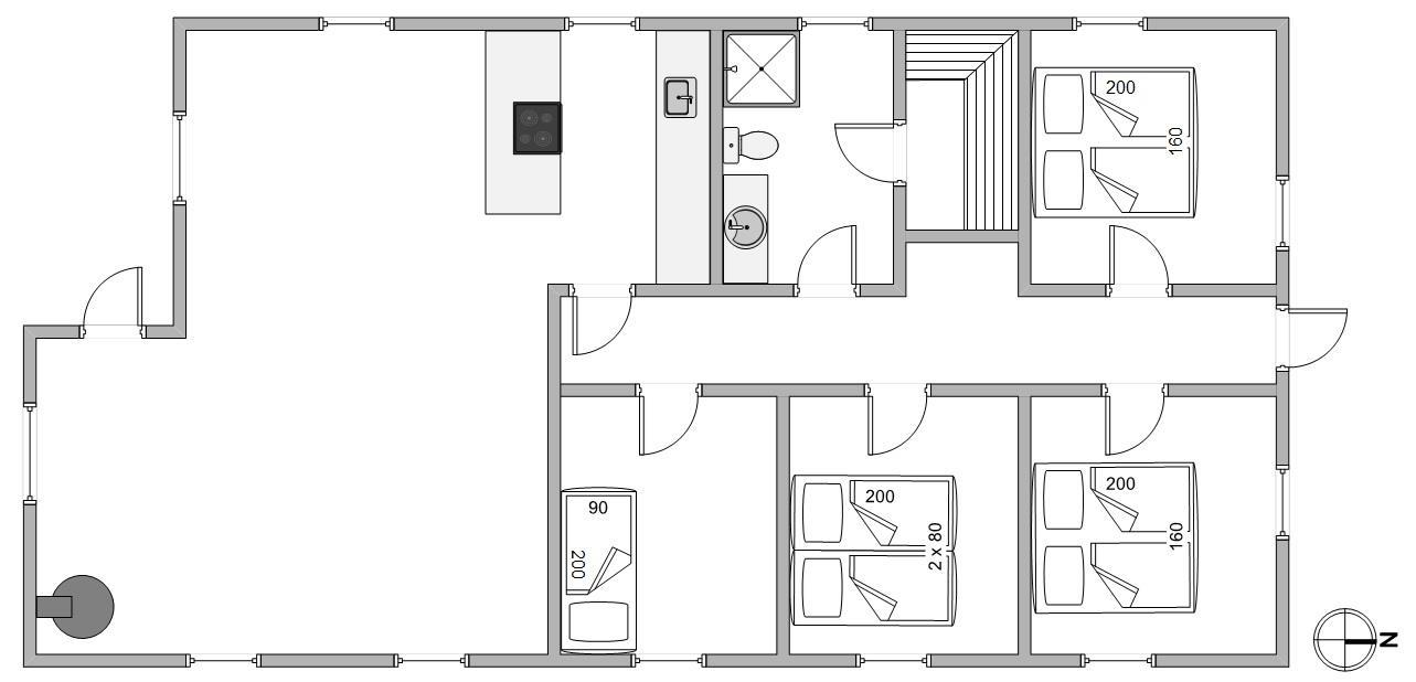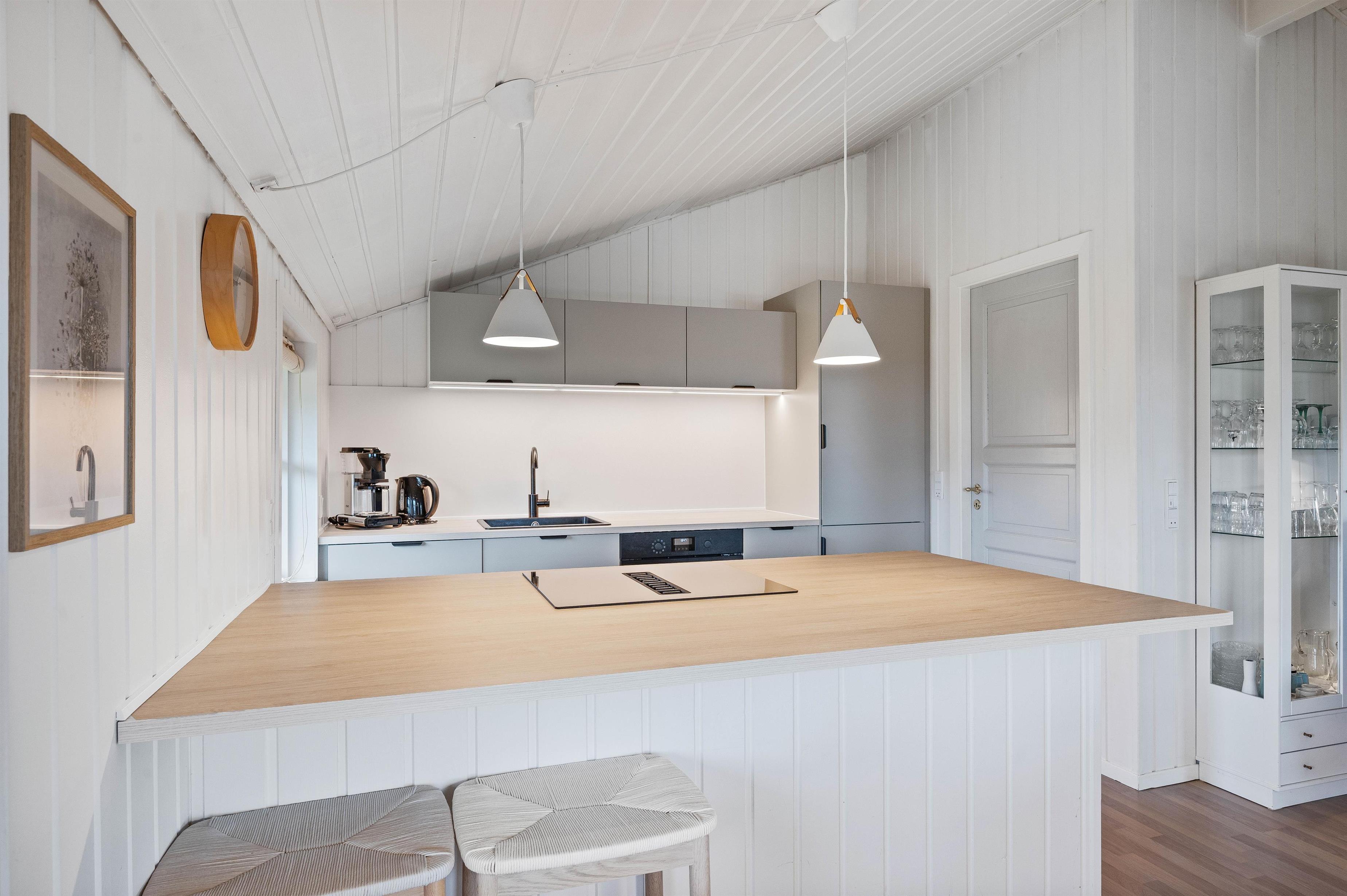 Sommerhuset har et praktisk indrettet køkken, som ligger i åben forbindelse med spiseplads og stue. Her kan hele familien altså være sammen, selvom nogle laver mad og andre slapper af på sofaen. Stuen er smagfuldt indrettet med gode møbler, og de sydvendte vinduer skaber et godt lysindfald i rummet. Her er deusden en brændeovn, som sørger for den helt rigtige feriestemning. I kan med fordel også benytte jer af den energibesparende varmepumpe til at holde temperaturen behagelig.