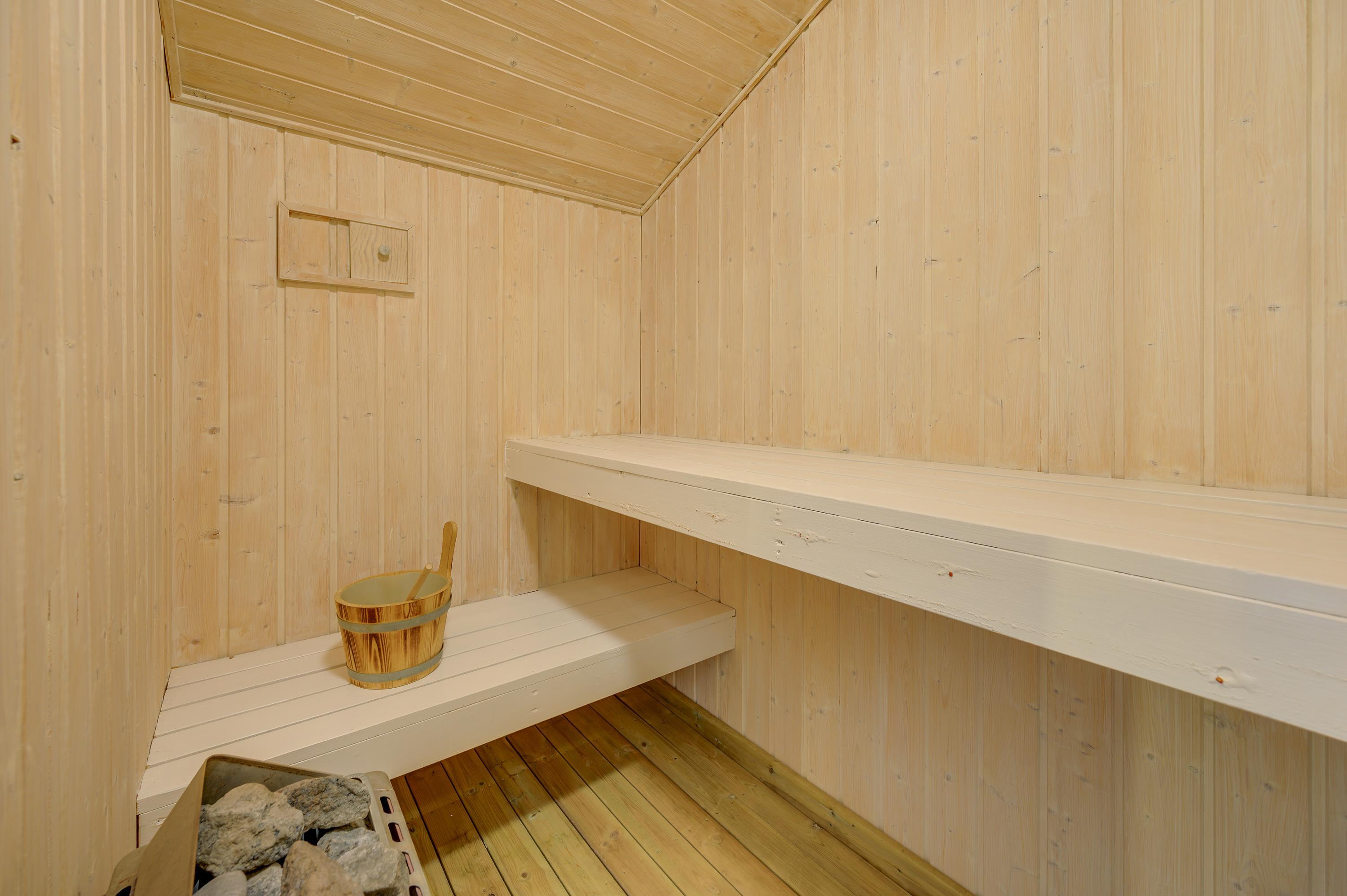 Her er et rigtig fint badeværelse med gulvvarme, hvorfra I også har adgang til sommerhusets sauna. Der er altså rig mulighed for velvære og afslapning efter en god gåtur ved vandet.