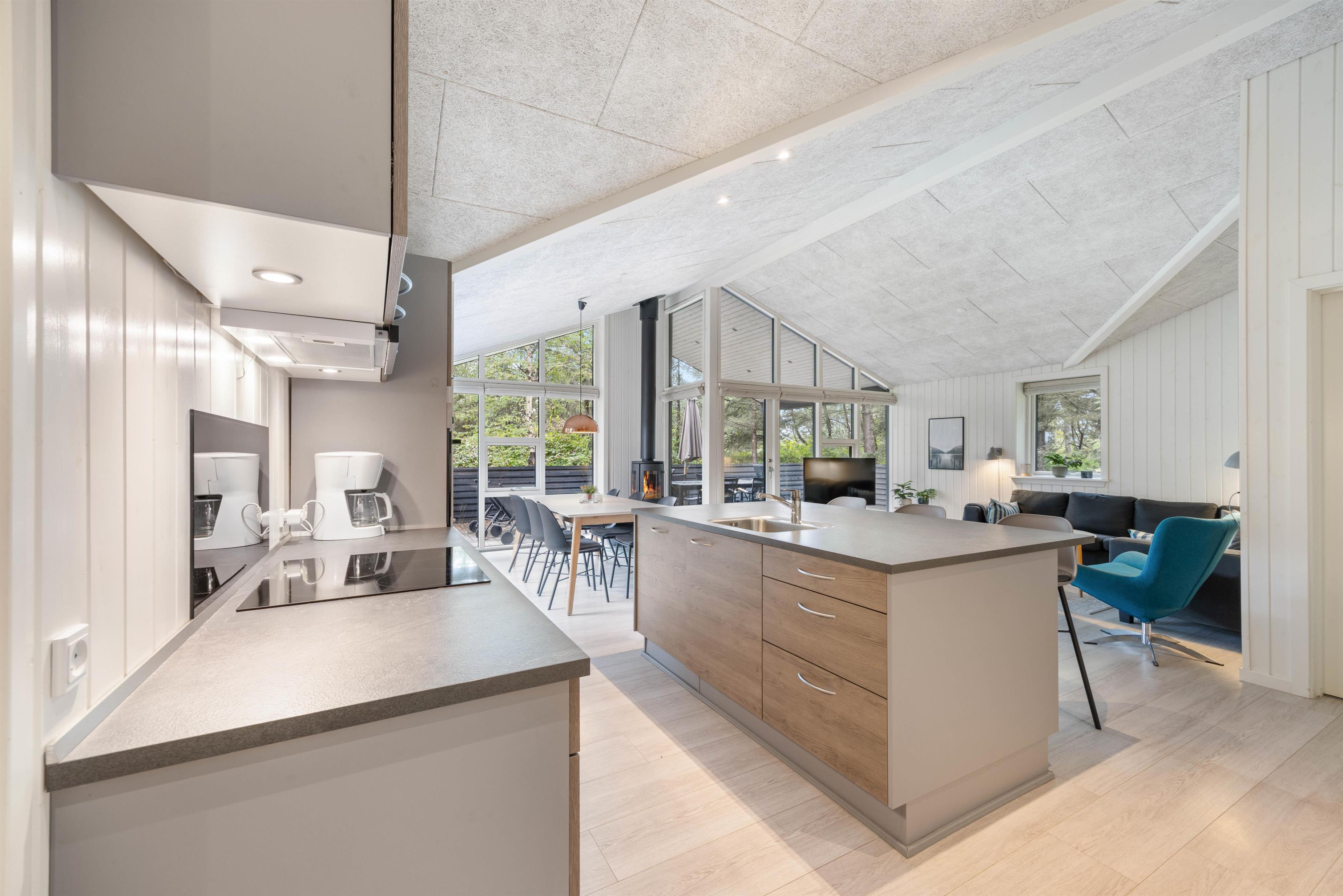Her er lagt vægt på den gode og hyggelige indretning og kvalitetsmaterialer. Det store opholdsrum, med en veludrustet køkkenafdeling, spiseplads og sofahjørne, er husets hjerte, hvor der er plads til alle. Det indbyder til familiehygge med spil og afslapning foran den knitrende ild i brændeovnen.