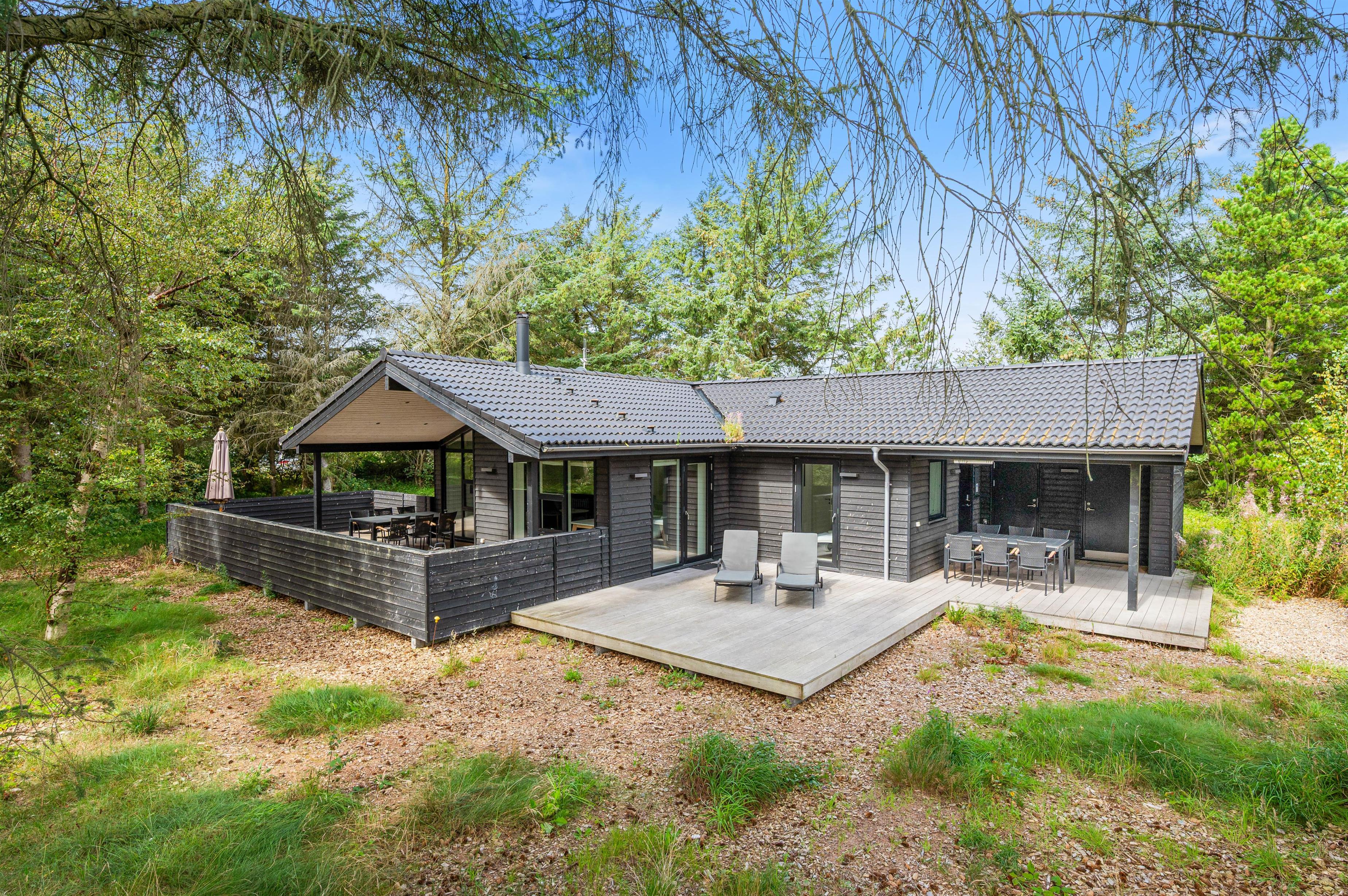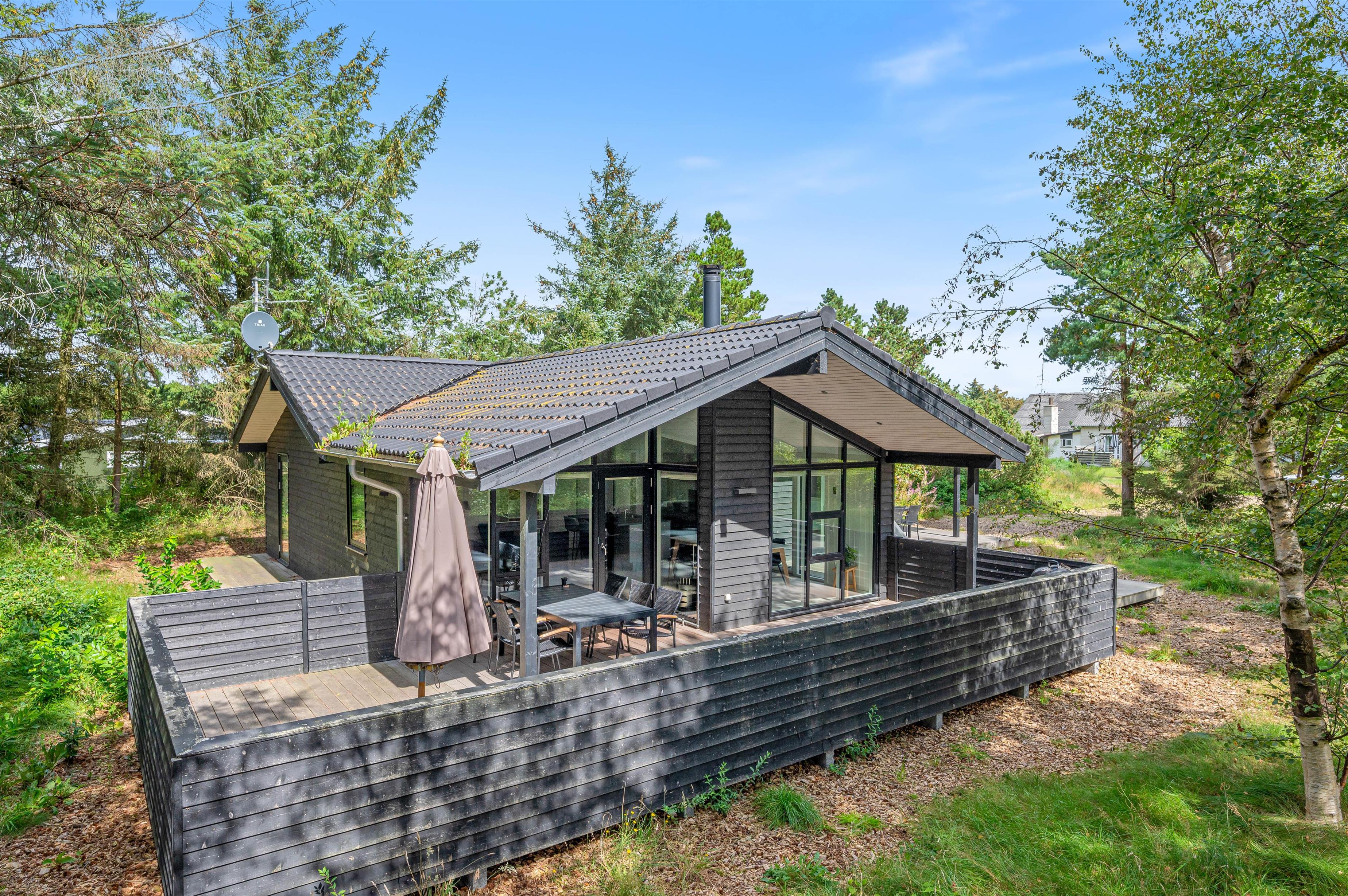 Her i det populære ferieområde Bjerregård finder I på Bilbjergsvej 6 B dette hyggelige træferiehus fra 2019 på en stor, helt lukket og ugeneret grund, omgivet af træer. Huset er velegnet til den store familie - eller til 2 familier, der gerne vil holde ferie sammen. Familiens hunde er også velkommen her.