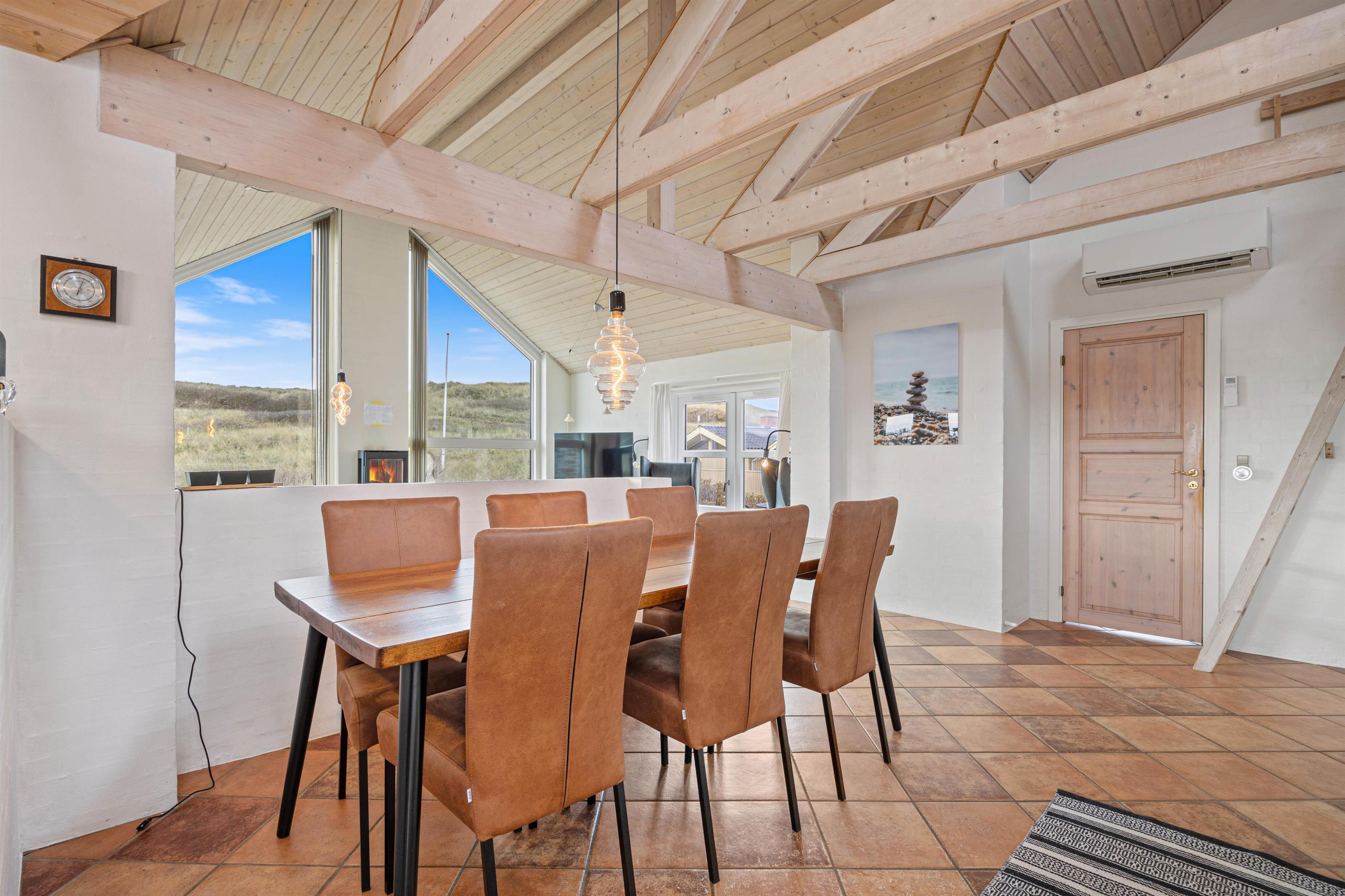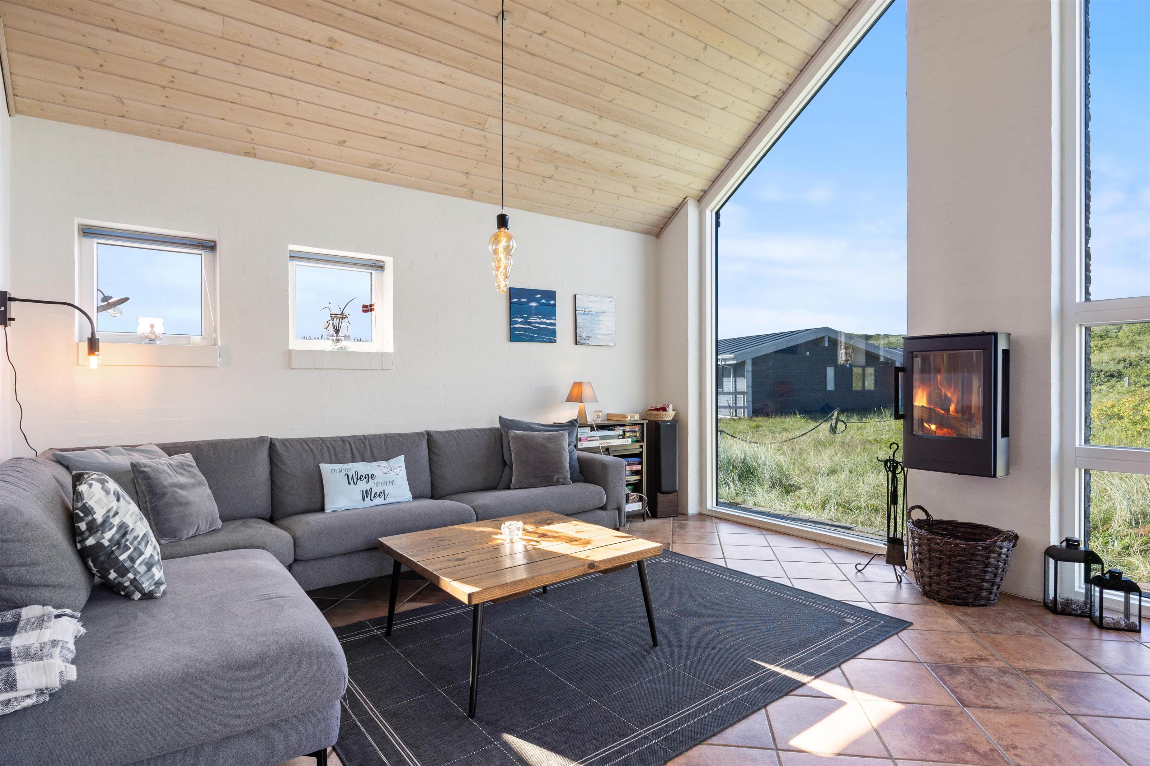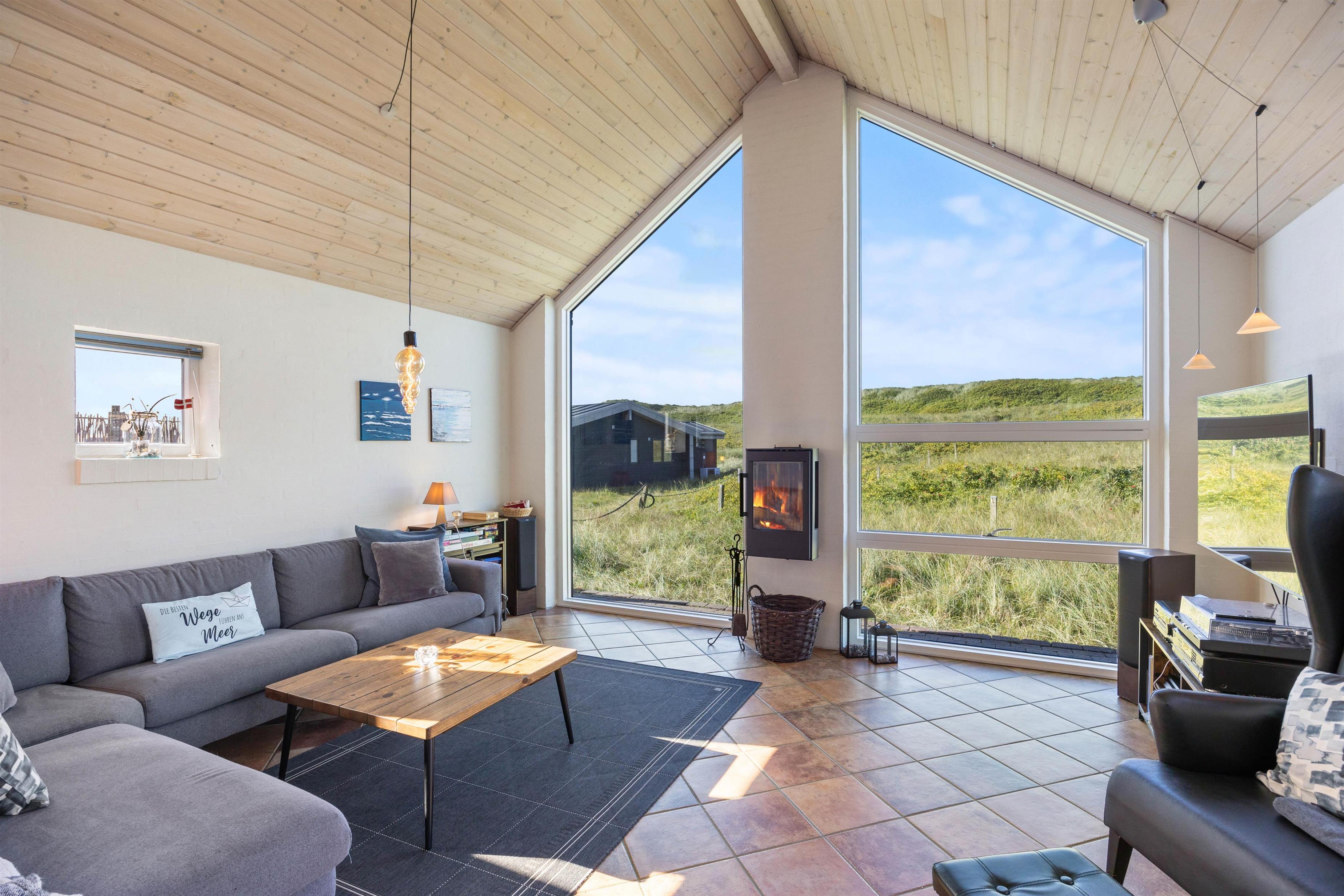 I det lyse og venligt indrettede opholdsrum i sommerhuset kan man kun føle sig godt tilpas. Det lyse træ, loftsbjælkerne og de høje lofter skaber en fantastisk atmosfære. Med vinduespartiet mod Vesterhavet kan I nyde en enestående udsigt over klitlandskabet. Uanset om I sidder i sofaen, ser film sammen eller spiser morgenmad ved spisebordet – udsigten er et ægte højdepunkt.