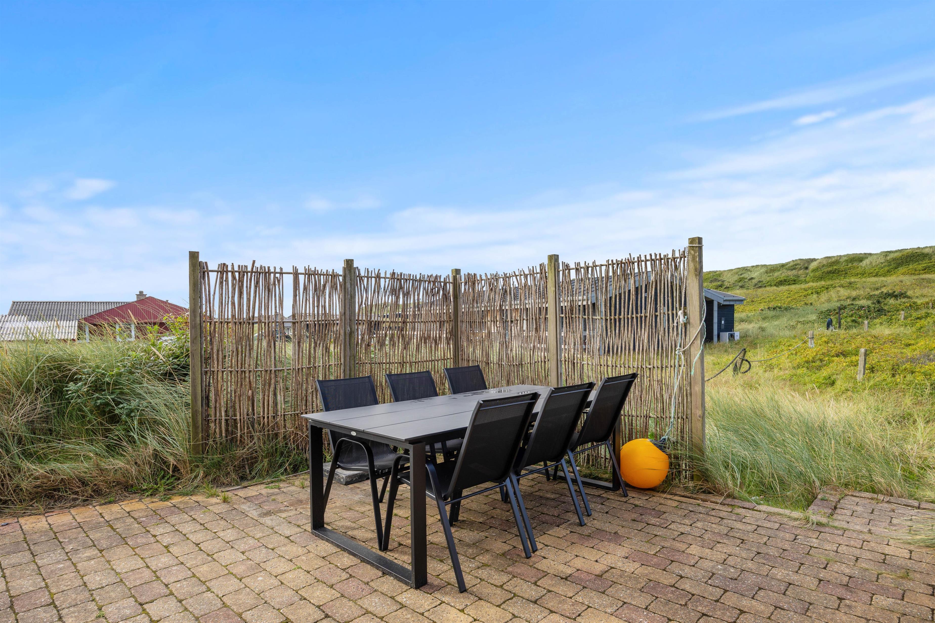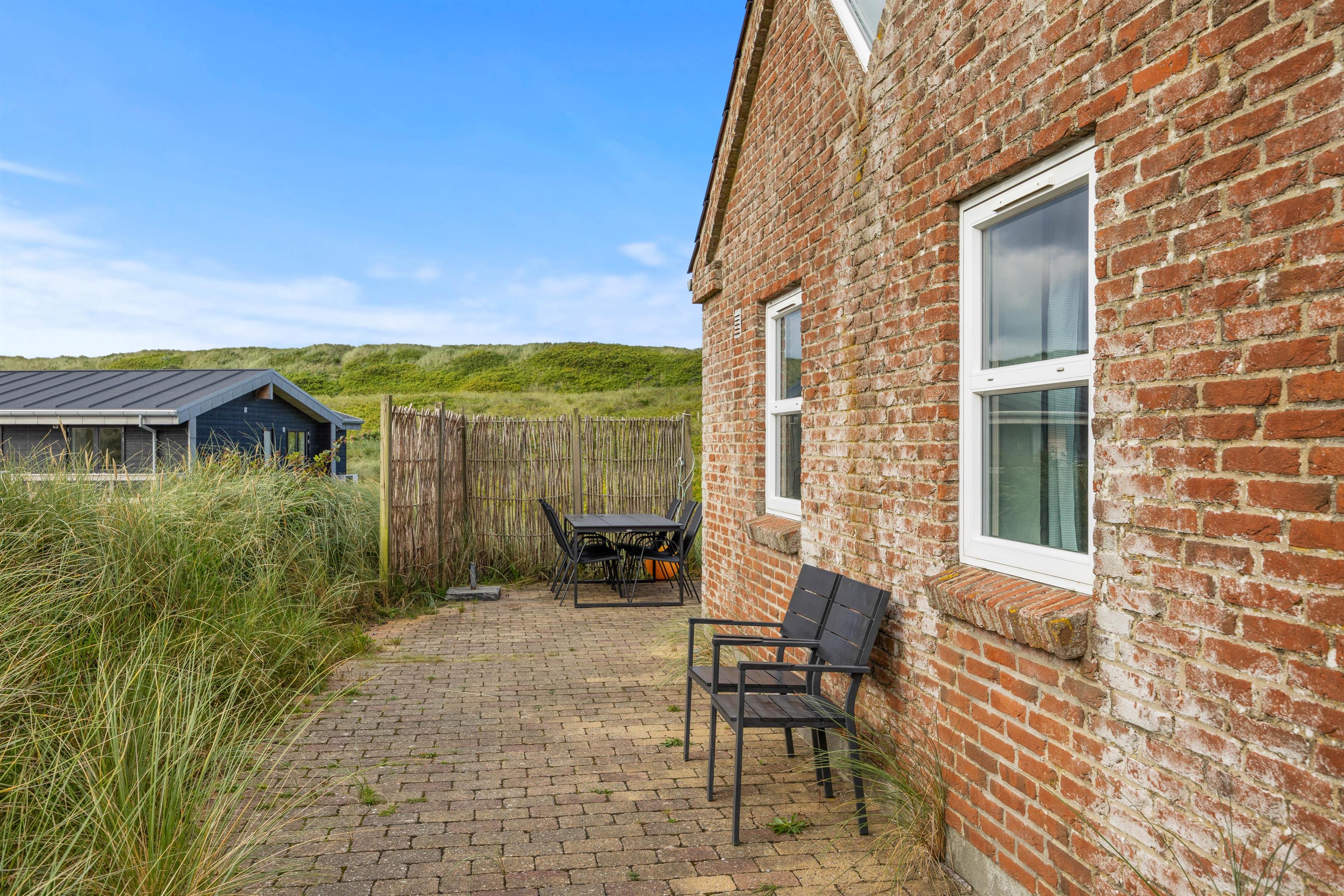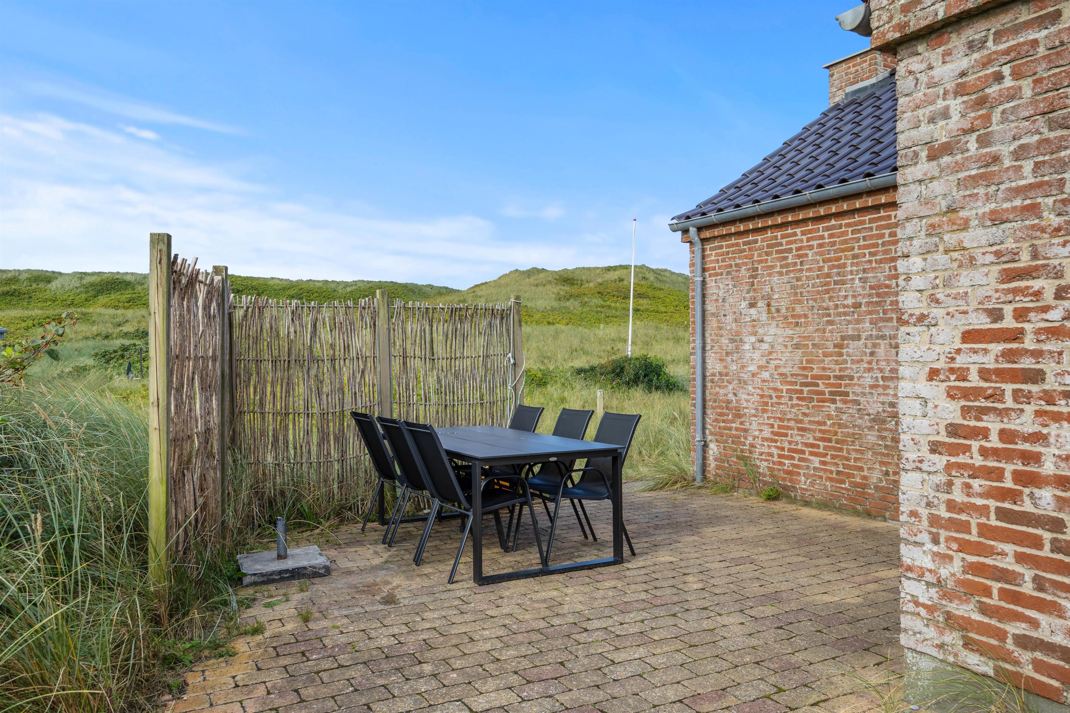 Rundt om jeres idyllisk beliggende sommerhus finder I terrasseområder med komfortable siddepladser, så I kan vælge jeres yndlingssted afhængigt af vindretning og solens placering. Terrassen er åben og delvist afskærmet, så I også kan nyde privatlivet udendørs. Indlejret mellem klitterne kan I nyde den friske havluft og udsigten til naturen.