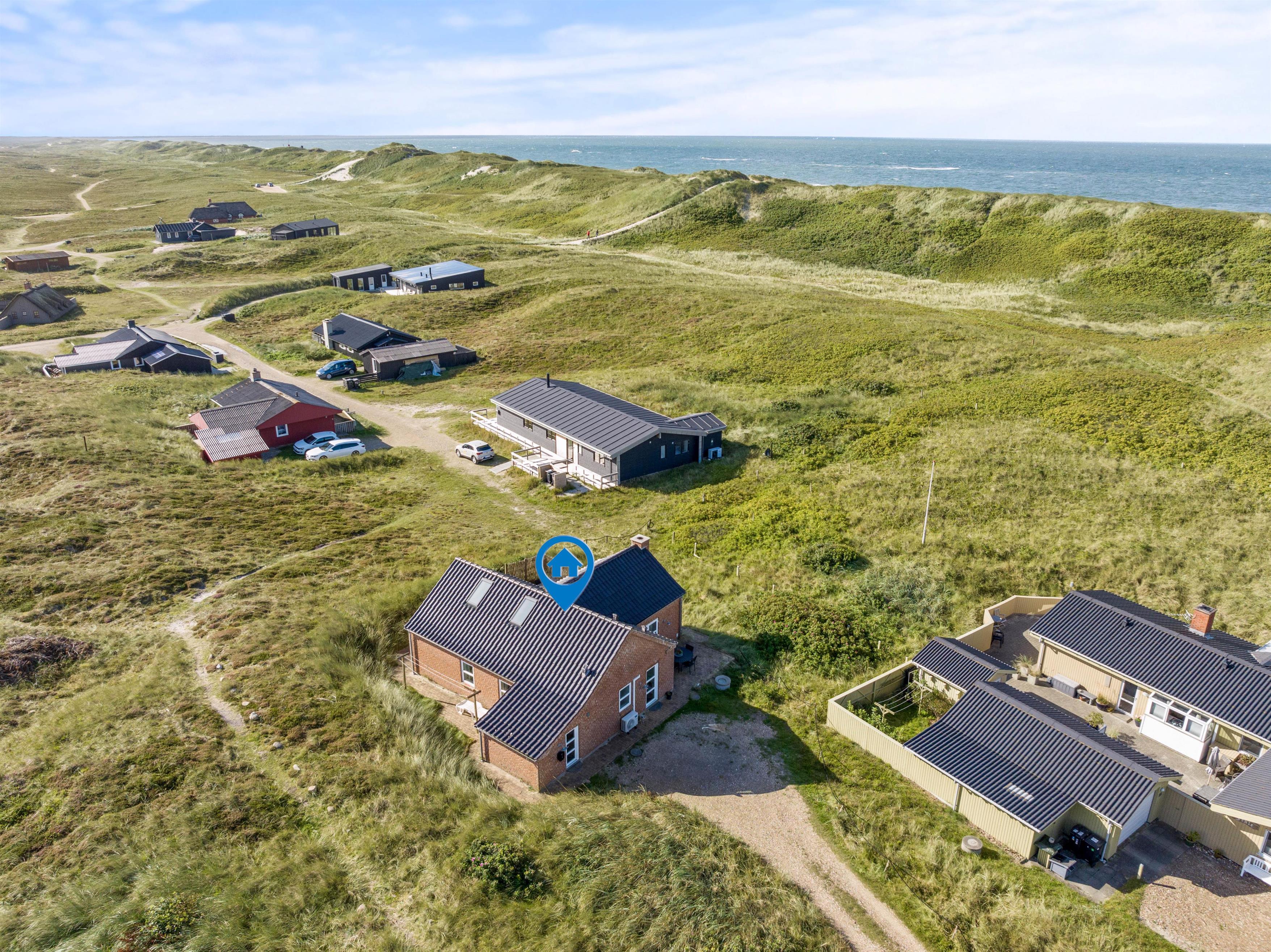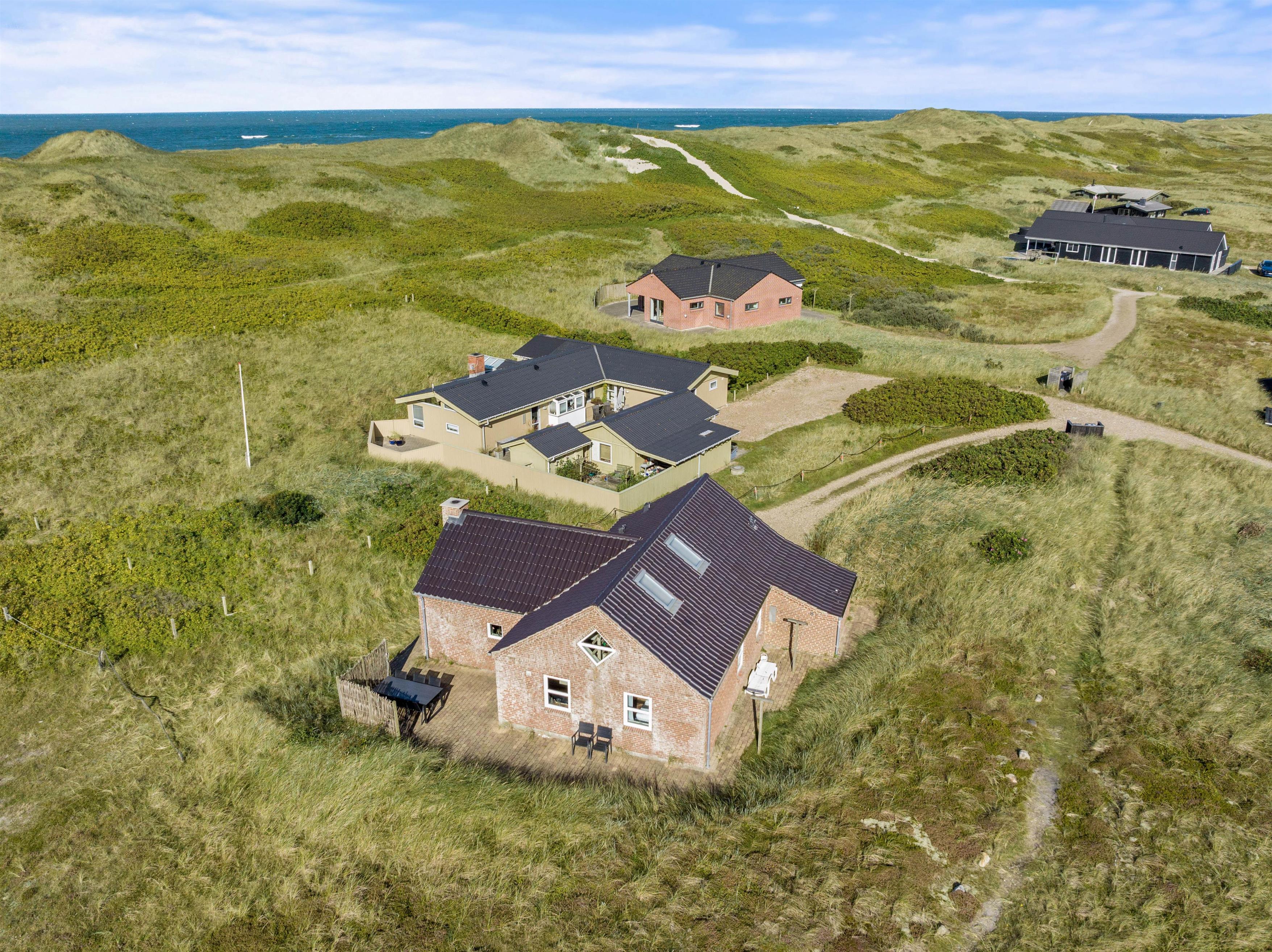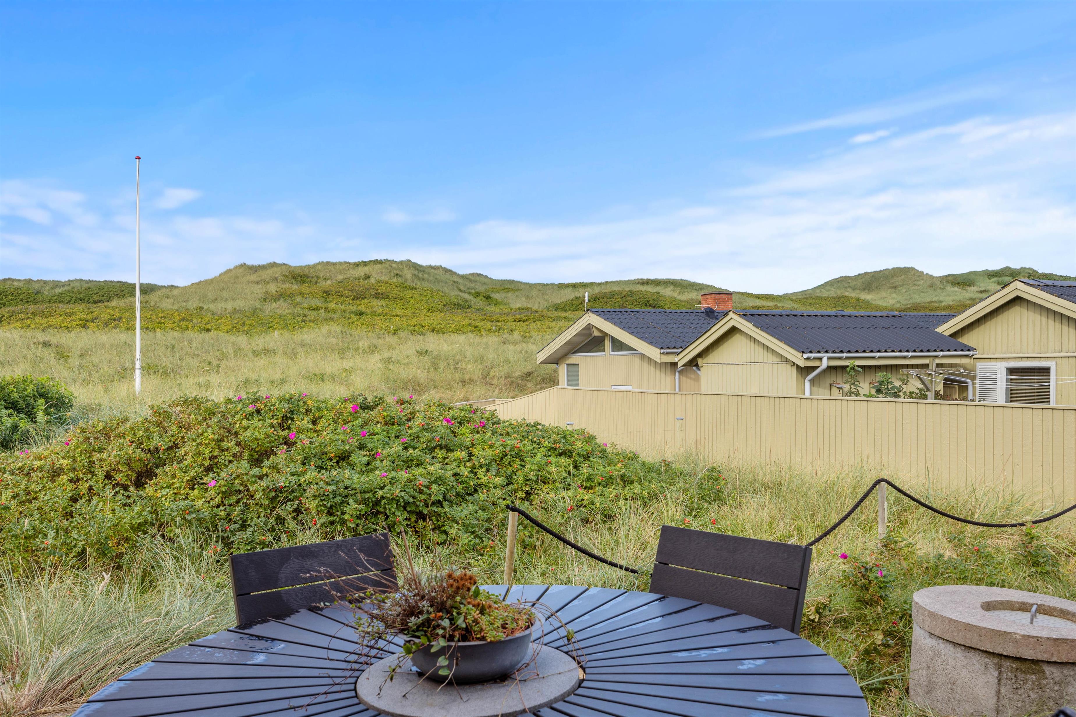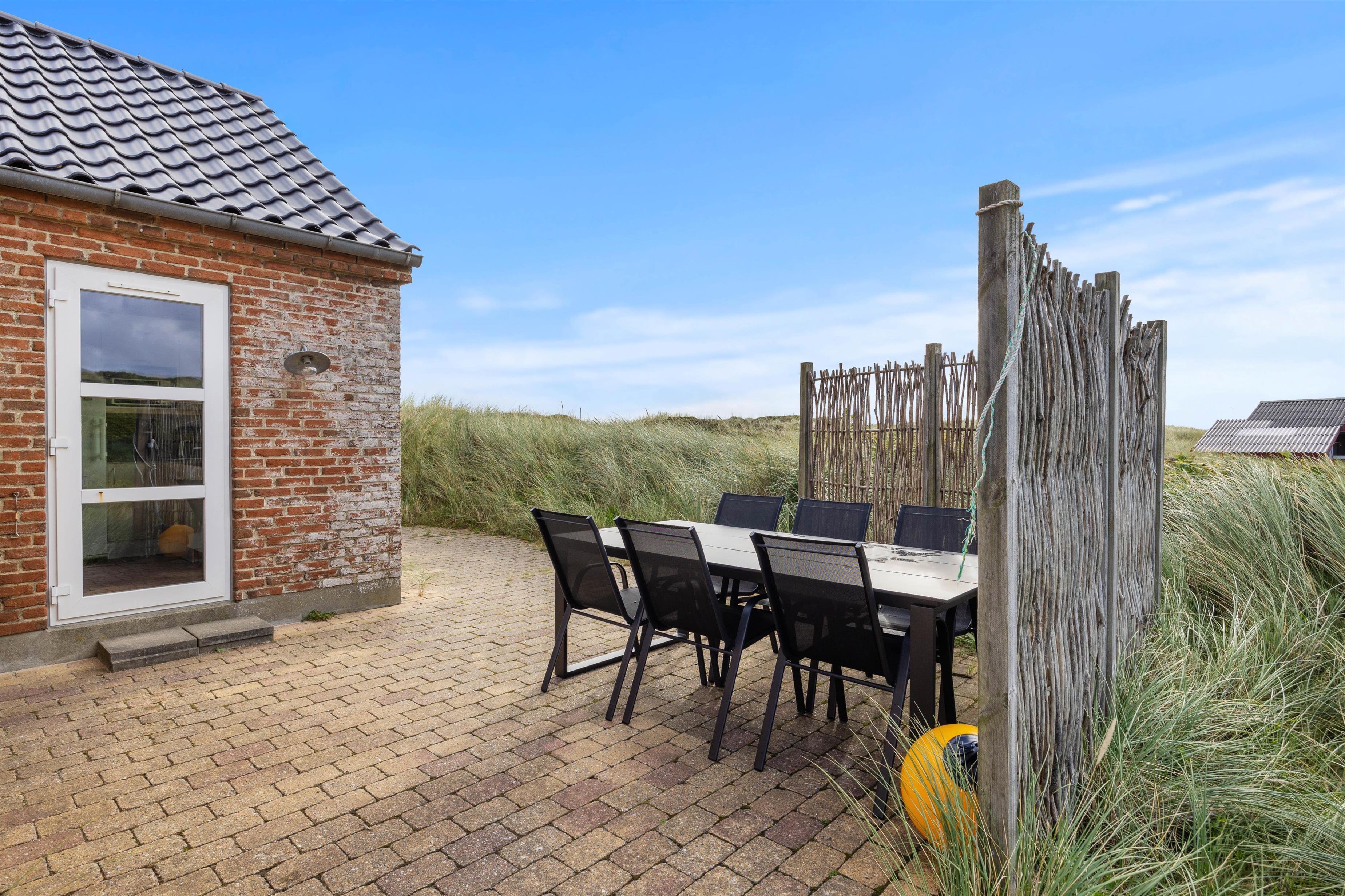 Rundt om jeres idyllisk beliggende sommerhus finder I terrasseområder med komfortable siddepladser, så I kan vælge jeres yndlingssted afhængigt af vindretning og solens placering. Terrassen er åben og delvist afskærmet, så I også kan nyde privatlivet udendørs. Indlejret mellem klitterne kan I nyde den friske havluft og udsigten til naturen.