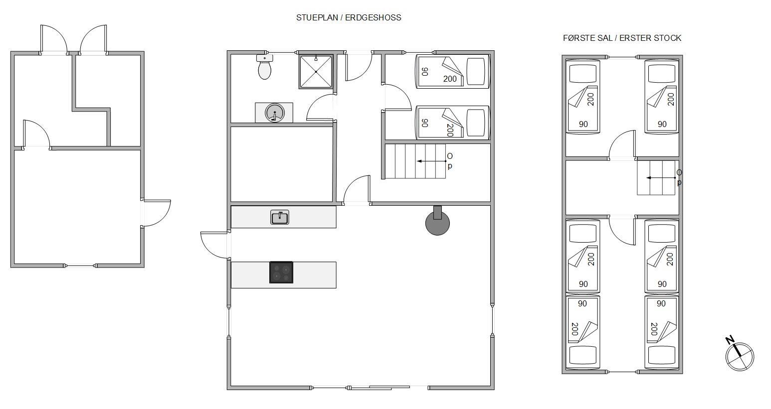 Der er 2 badeværelser med gulvvarme, så I behøver ikke at stå i kø til morgenbadet. I annekset er et soveværelse med dobbeltseng, derudover er der et soveværelse i stueplan og 2 soveværelser på 1. sal i feriehuset, alle med enkeltsenge. I sommerhuset er vaskemaskine, tørretumbler og en energibesparende varmepumpe.