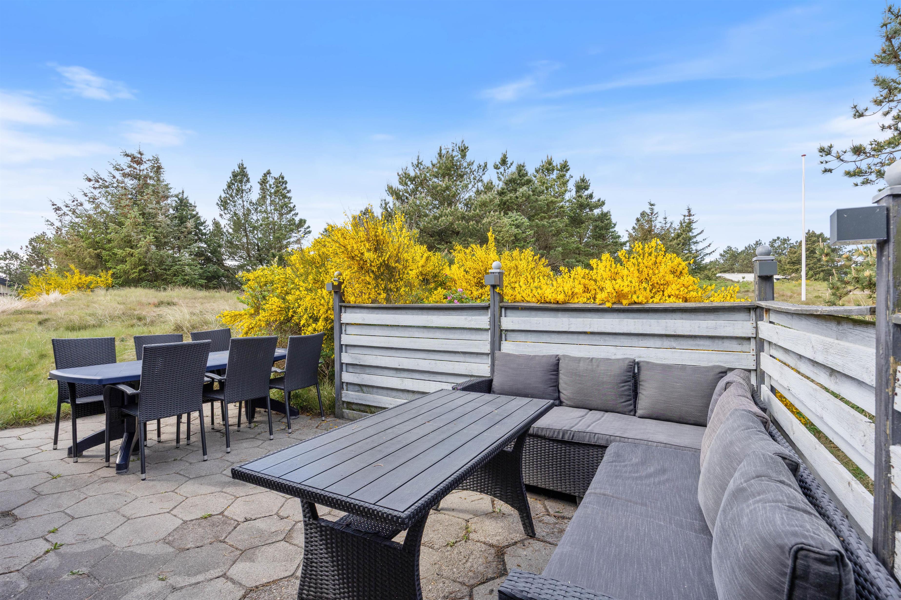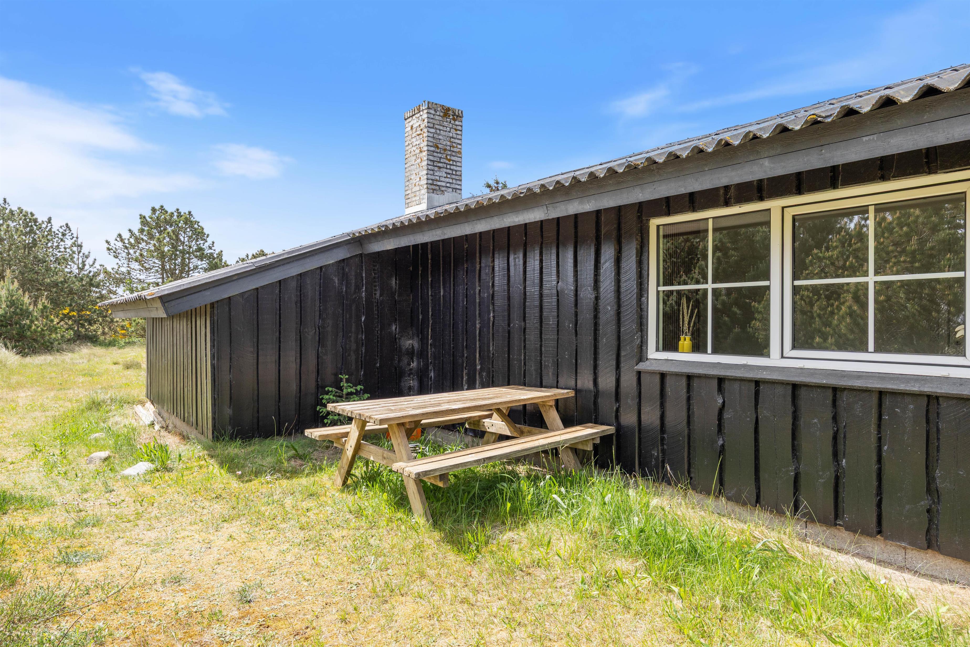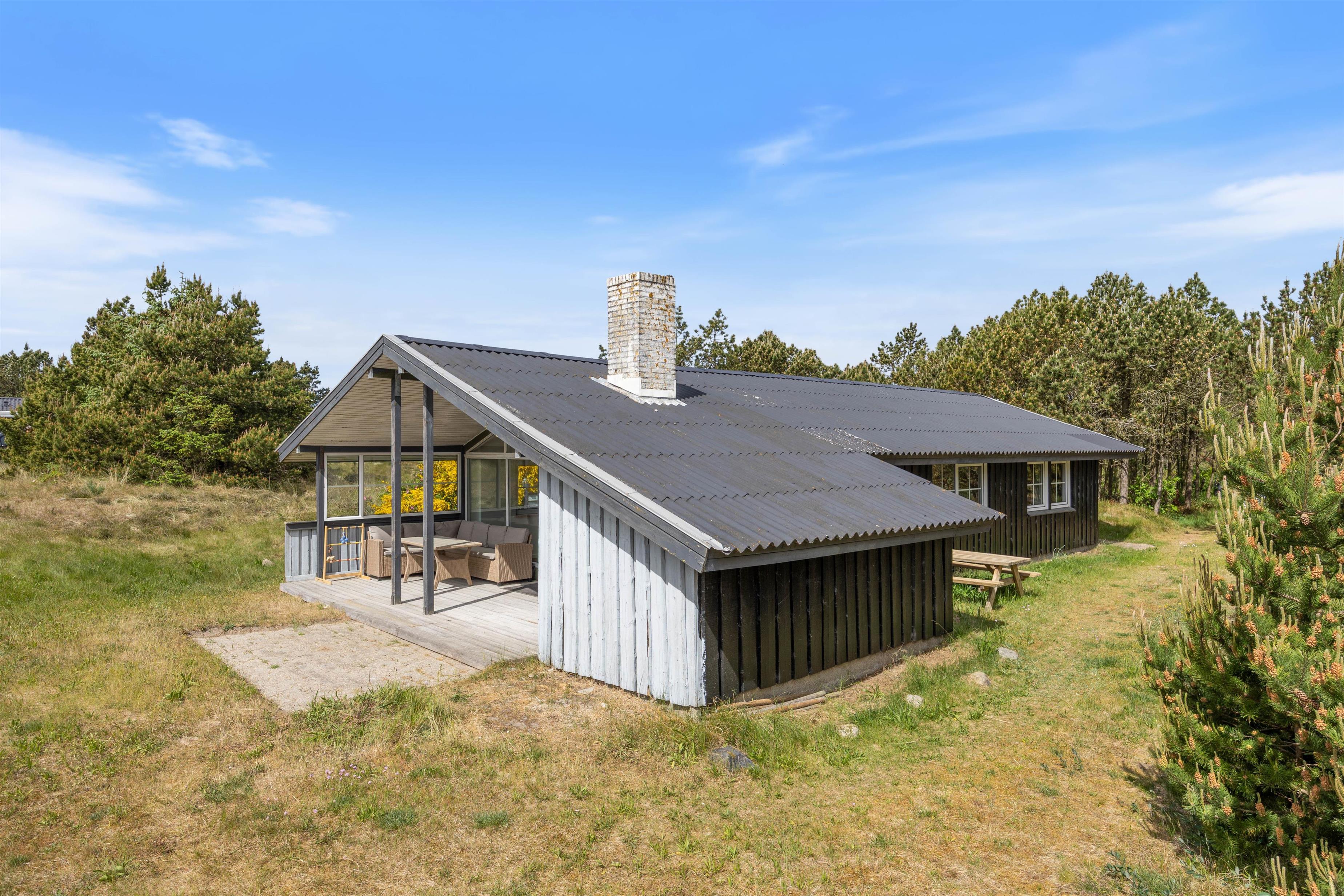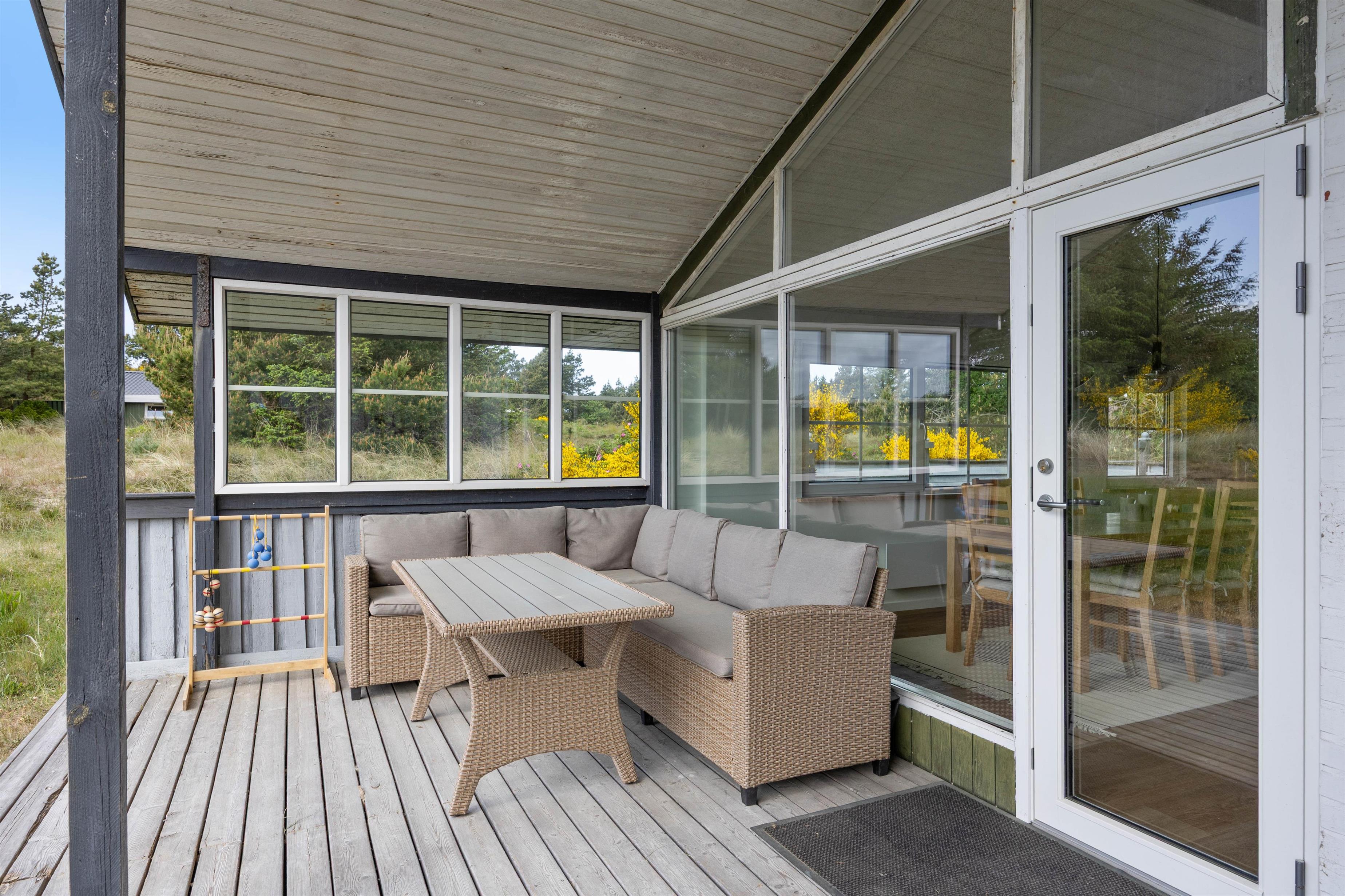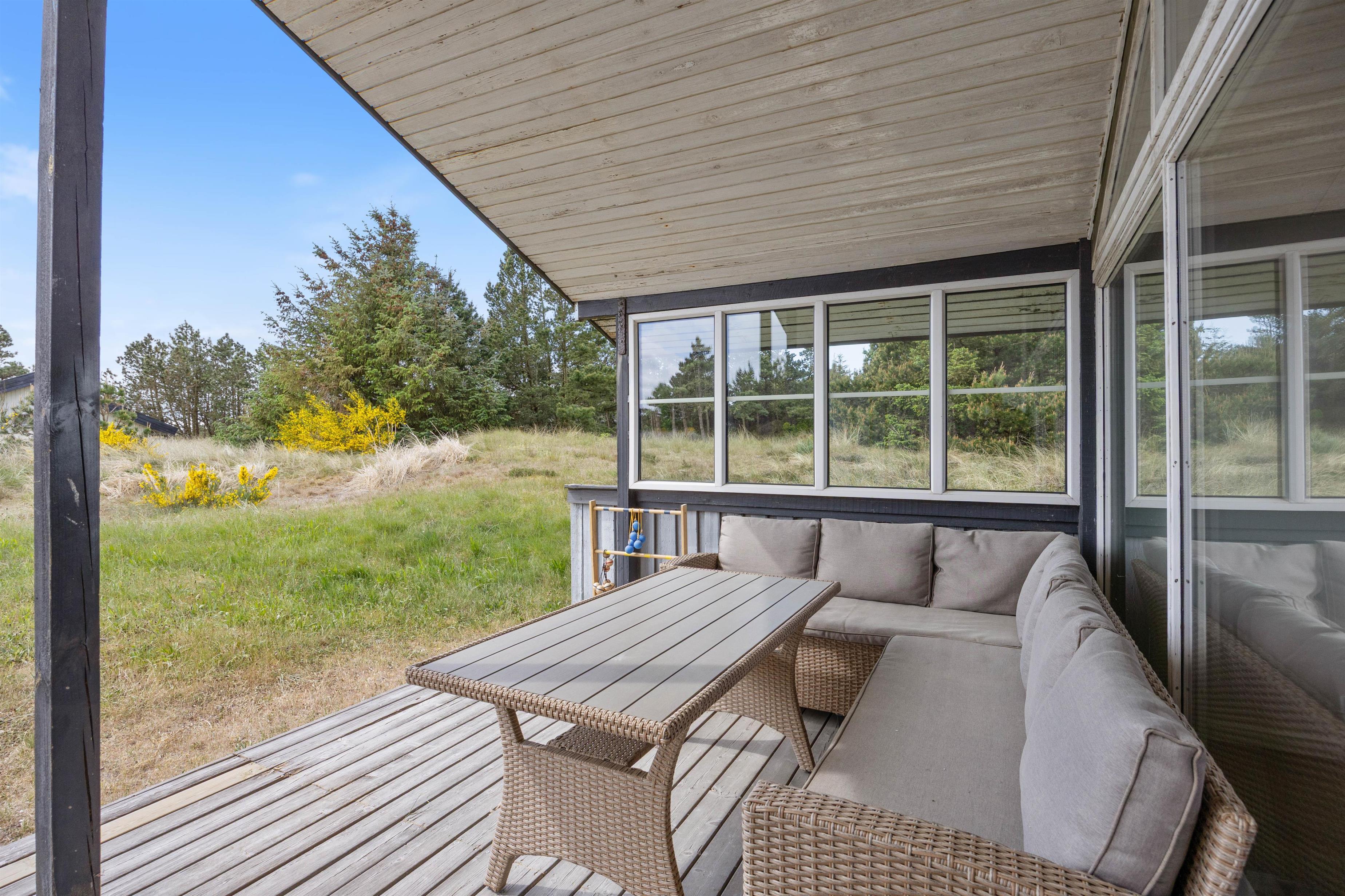 Udendørsarealet ved sommerhuset er skabt til at nyde livet i det fri. Her finder I en dejlig terrasse, der både er delvist overdækket og afskærmet, så I kan opholde jer udendørs – uanset om solen skinner fra en blå himmel, eller vinden kræver lidt læ. På terrassen står havemøblerne klar til afslappende stunder med morgenkaffen eller et godt glas vin om aftenen, og med grillen til rådighed er det oplagt at samles om hyggelige måltider under åben himmel, mens dagens indtryk vendes i fællesskab.