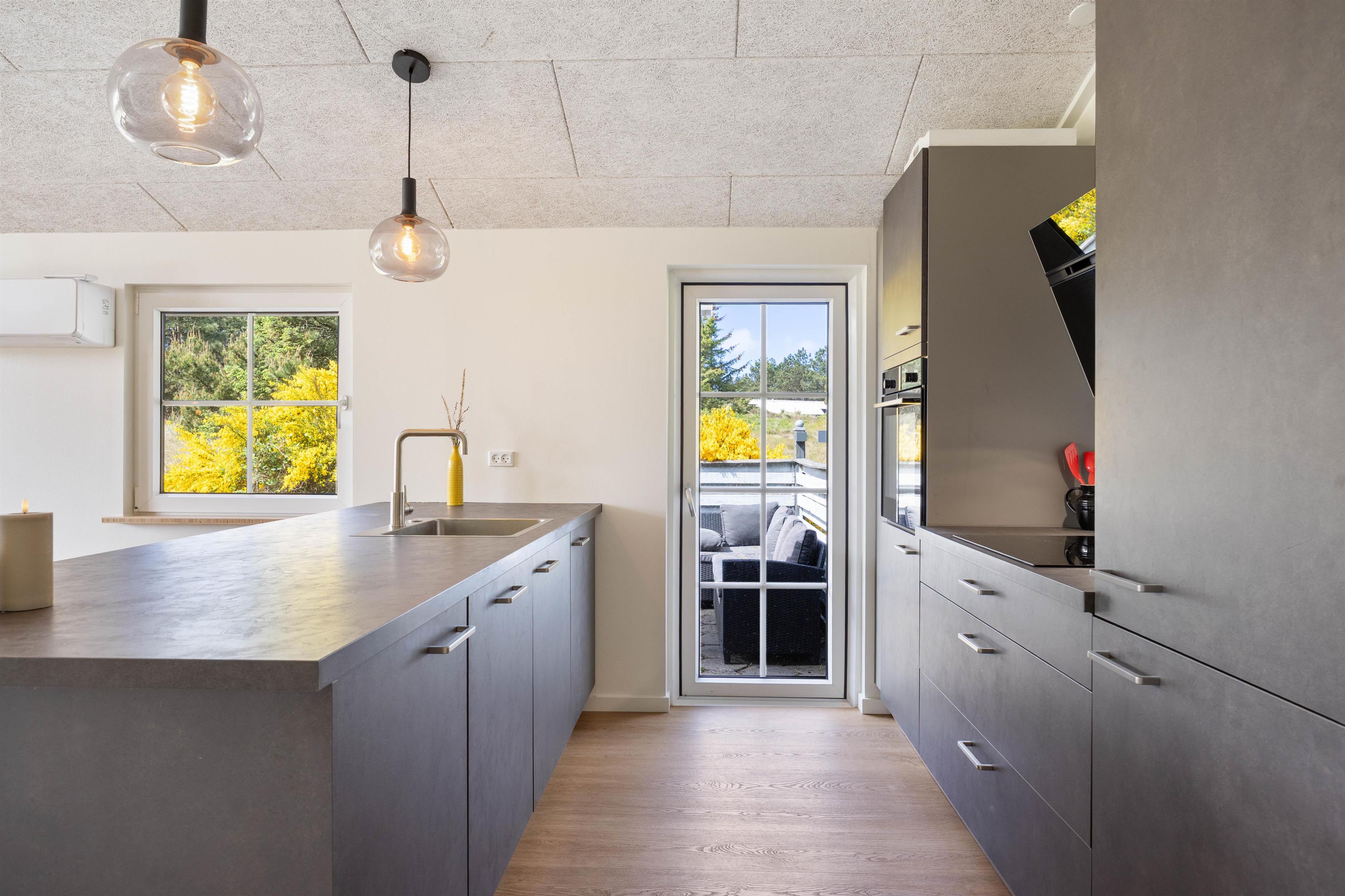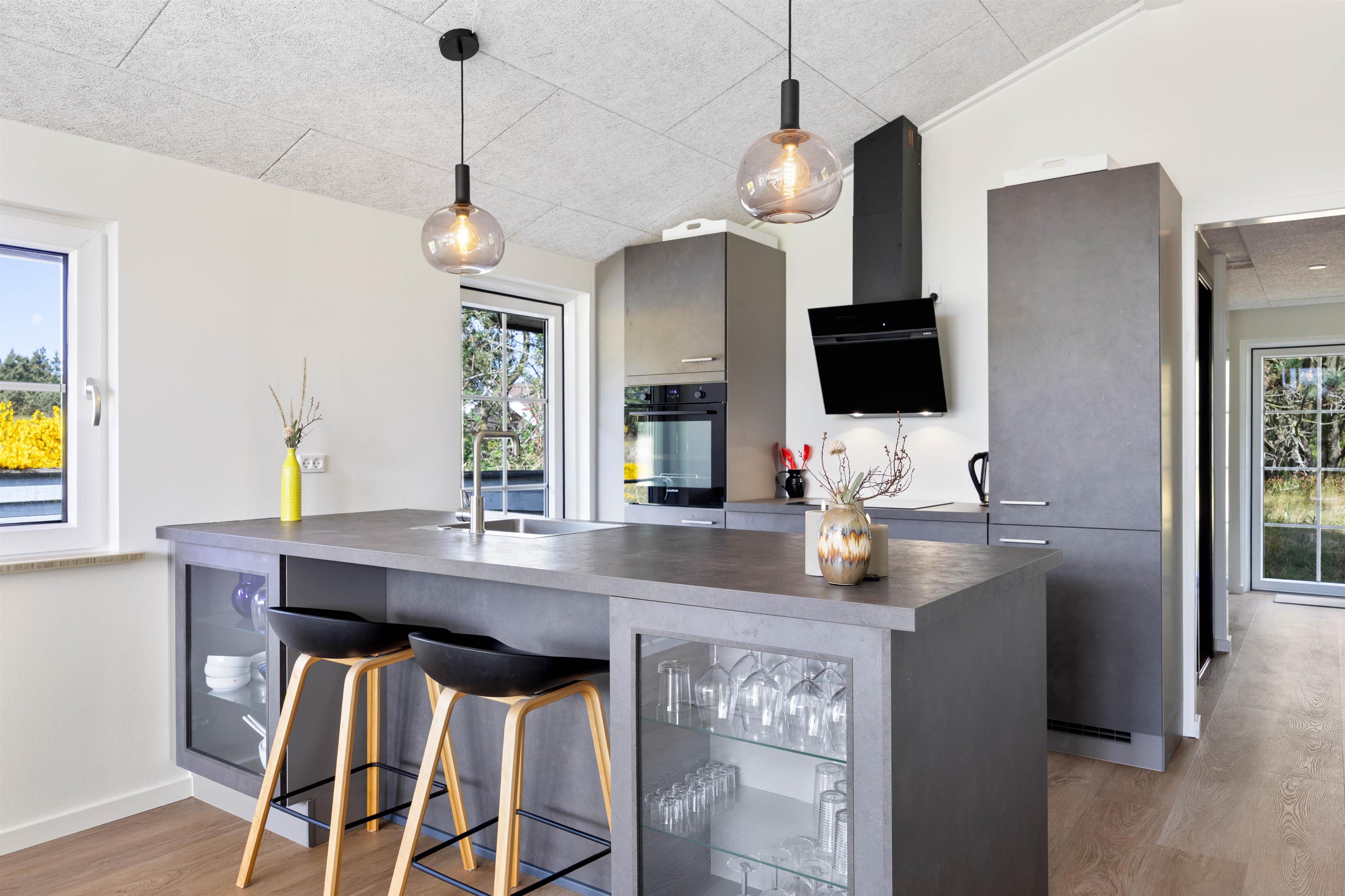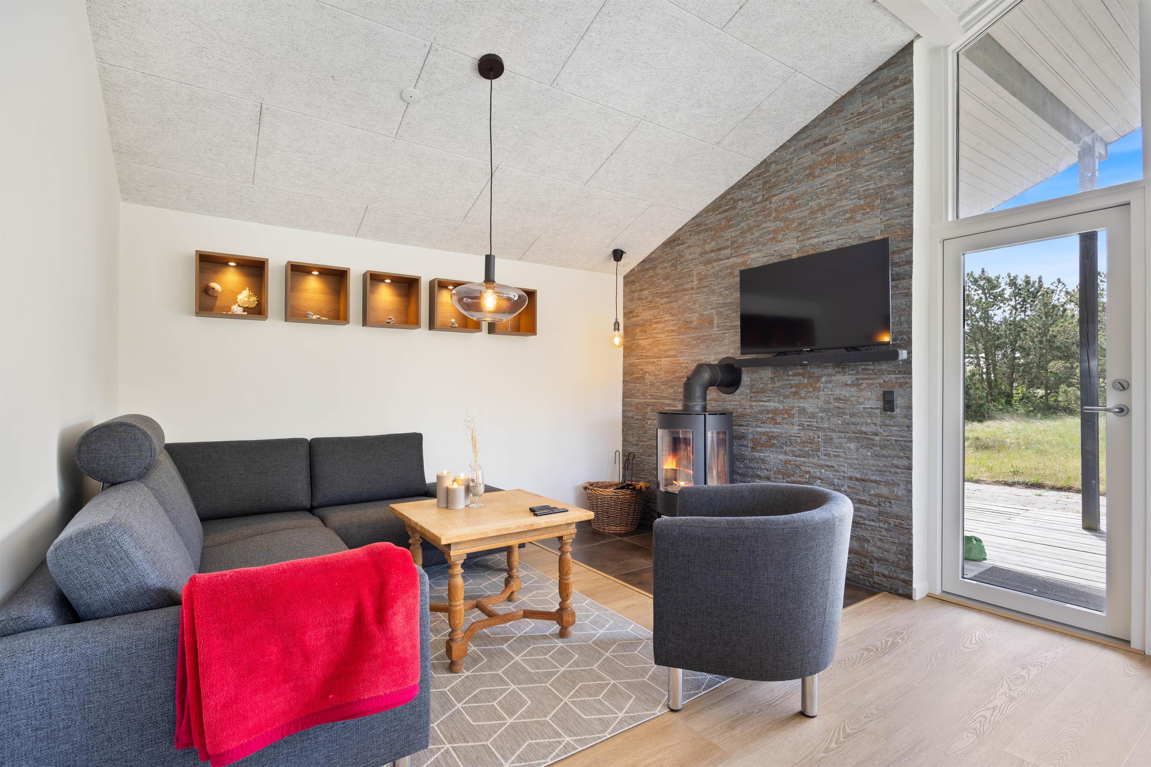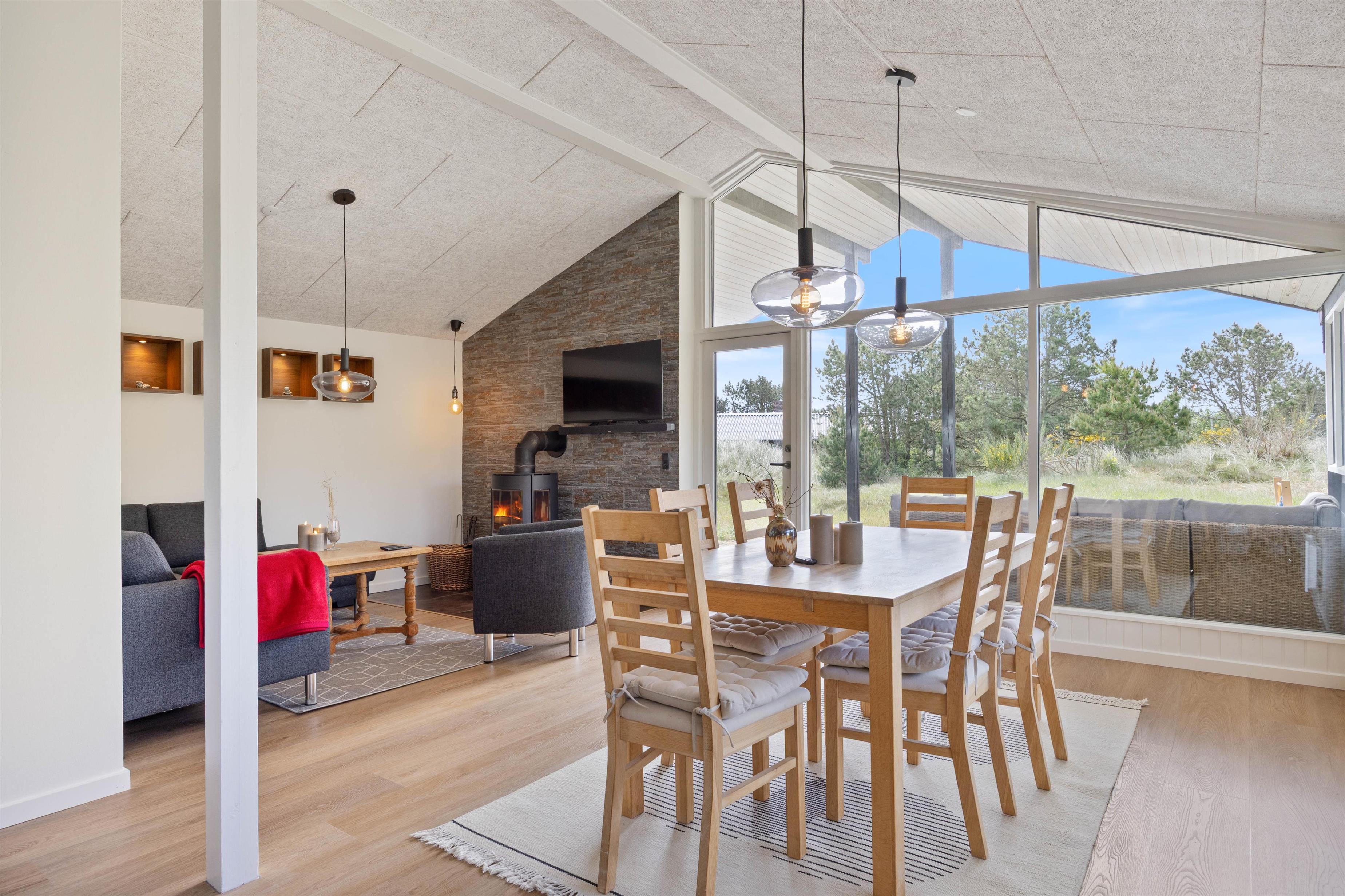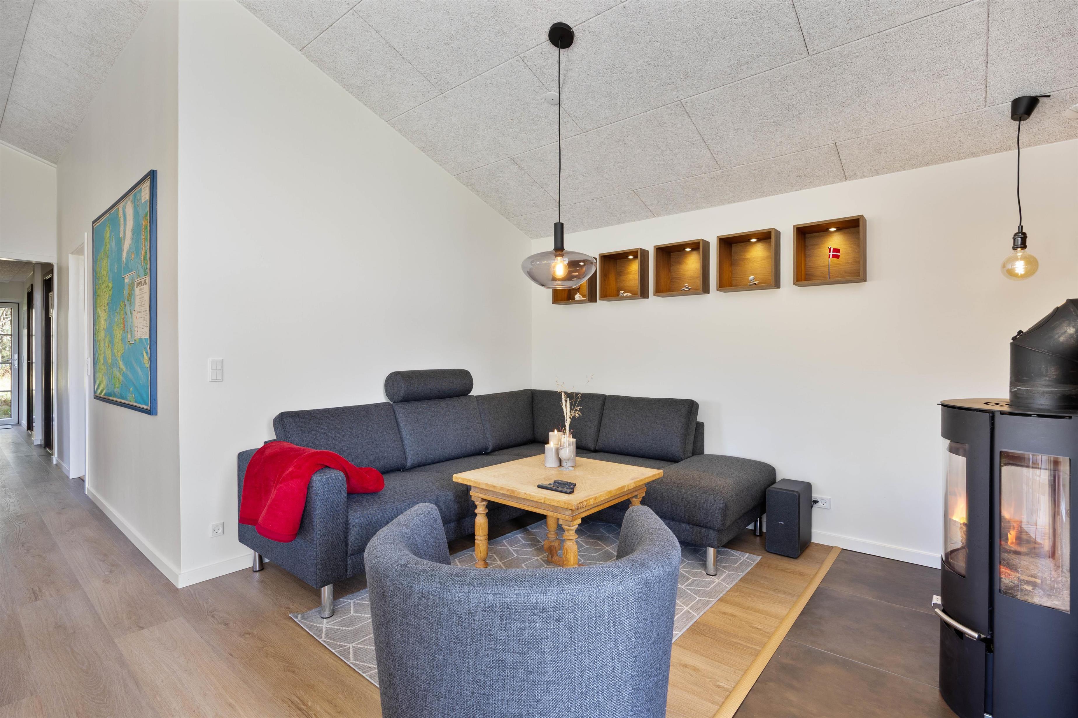 Sommerhuset er renoveret i 2025 og fremstår indbydende og pænt. Den åbne opholdsstue ligger i forbindelse med køkkenet og danner rammen om fælles feriestunder. Her kan I samles omkring brændeovnen, der spreder varme og stemning på kølige aftener, mens varmepumpen sørger for et behageligt indeklima året rundt. Sommerhuset er desuden udstyret med tv med danske kanaler – perfekt til filmaftener eller afslapning efter en dag i naturen.
