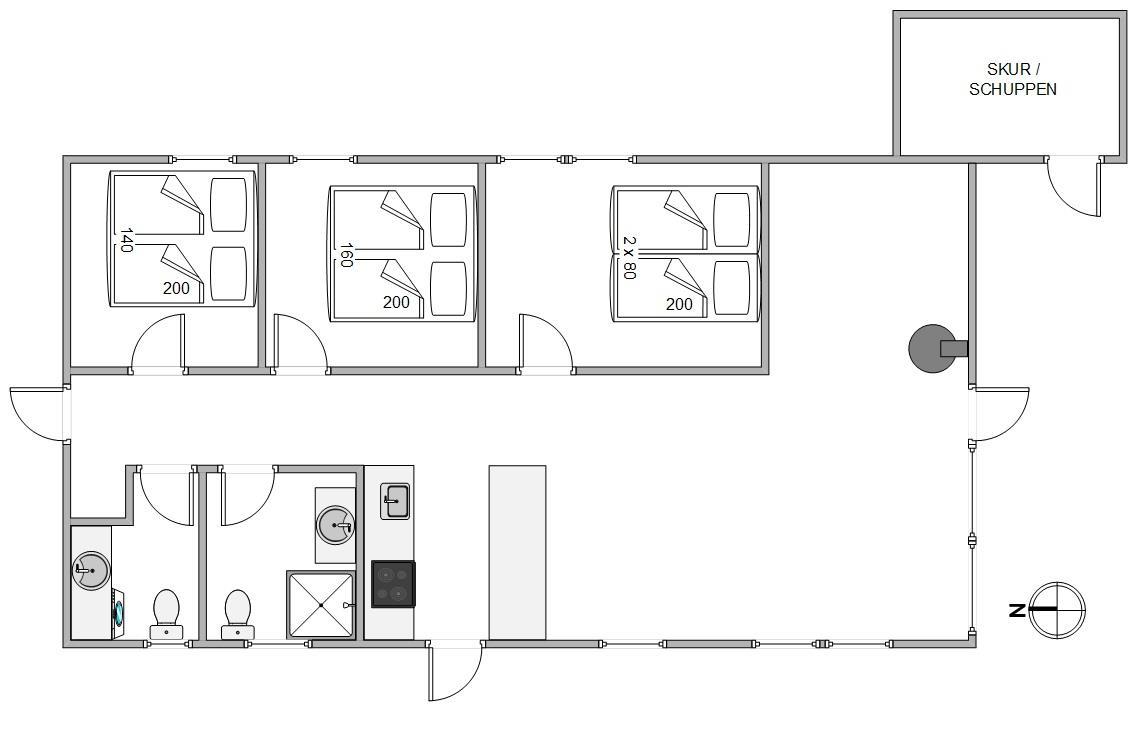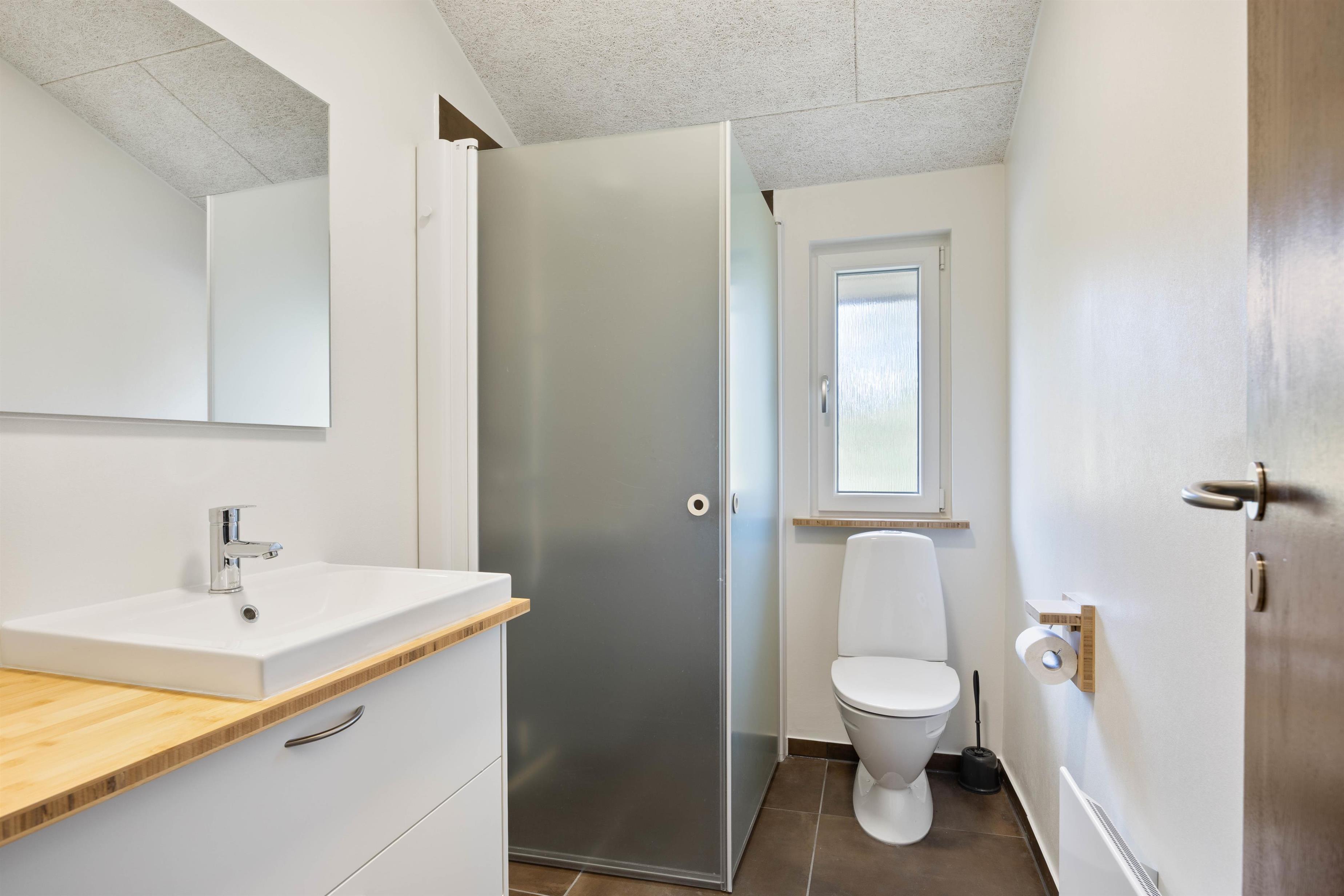 Der er 3 soveværelser, ét badeværelse samt et ekstra gæstetoilet, hvilket giver god plads og gør sommerhuset velegnet til både familier og vennepar.