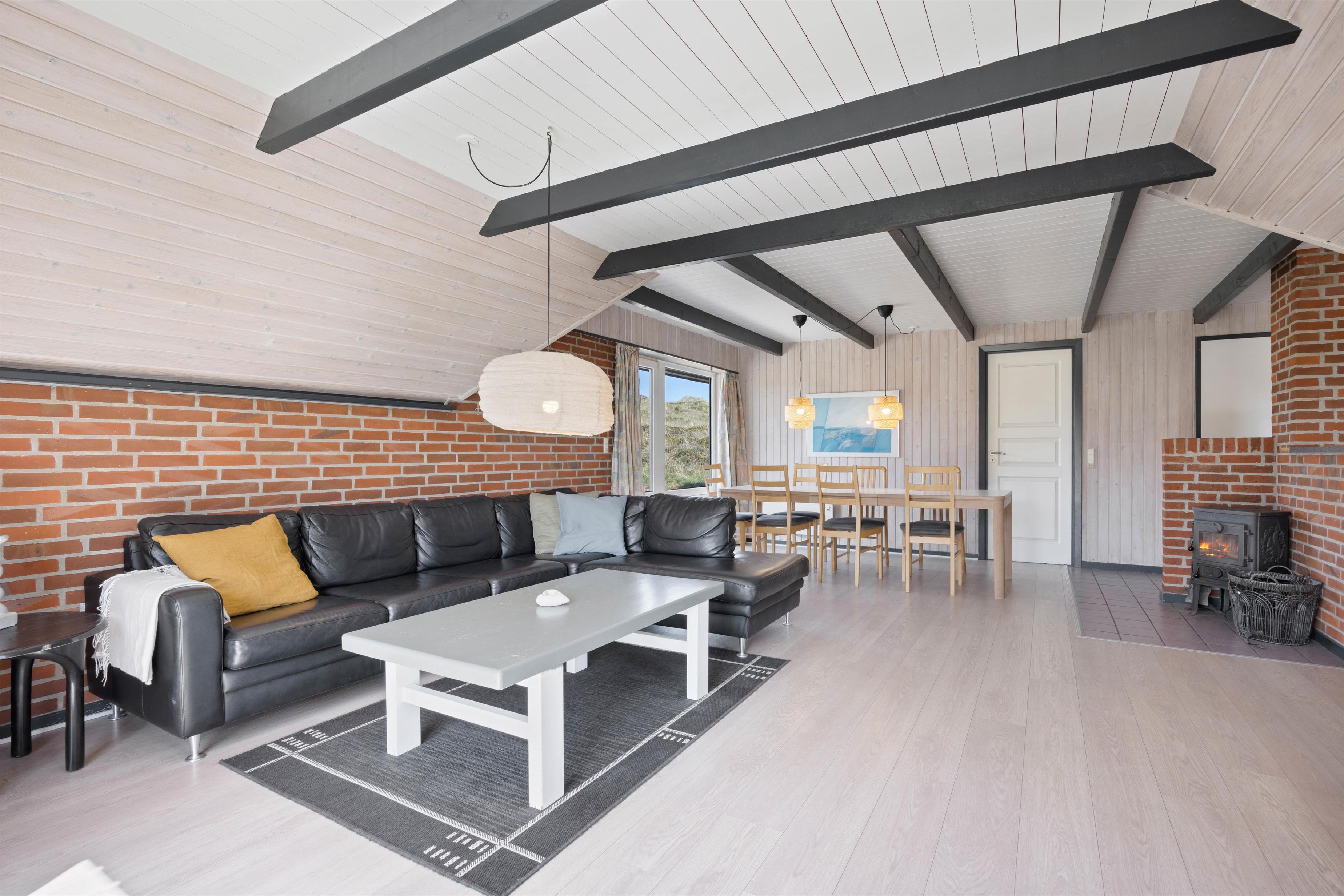 Det er et rummeligt og dejligt sommerhus med en hyggelig stemning i den store stue, hvor en rustik brændeovn luner og hygger. Køkkenet er i åben forbindelse med spiseafdelingen, hvor lyse vægge og trægulv gør et indbydende indtryk.