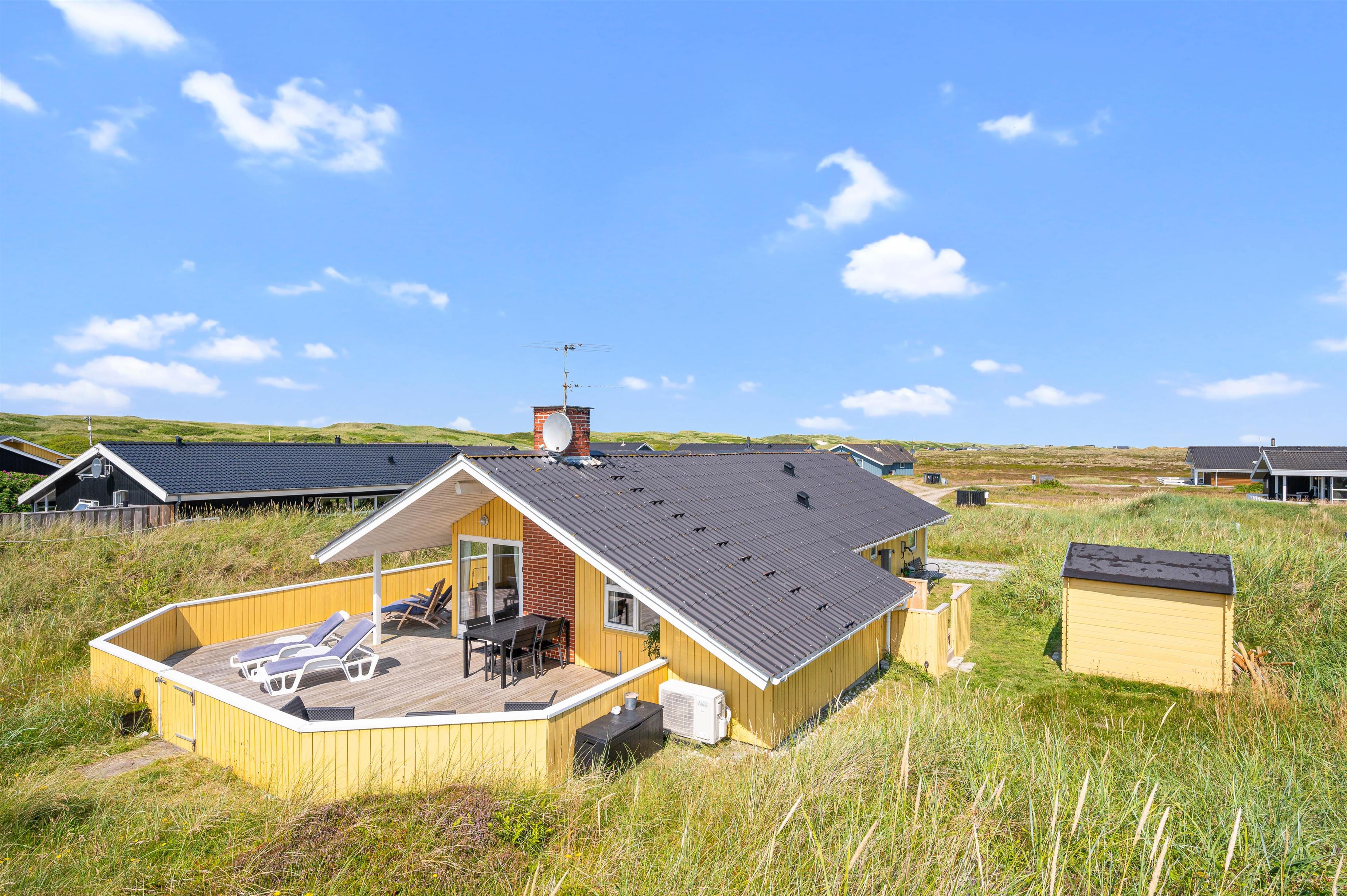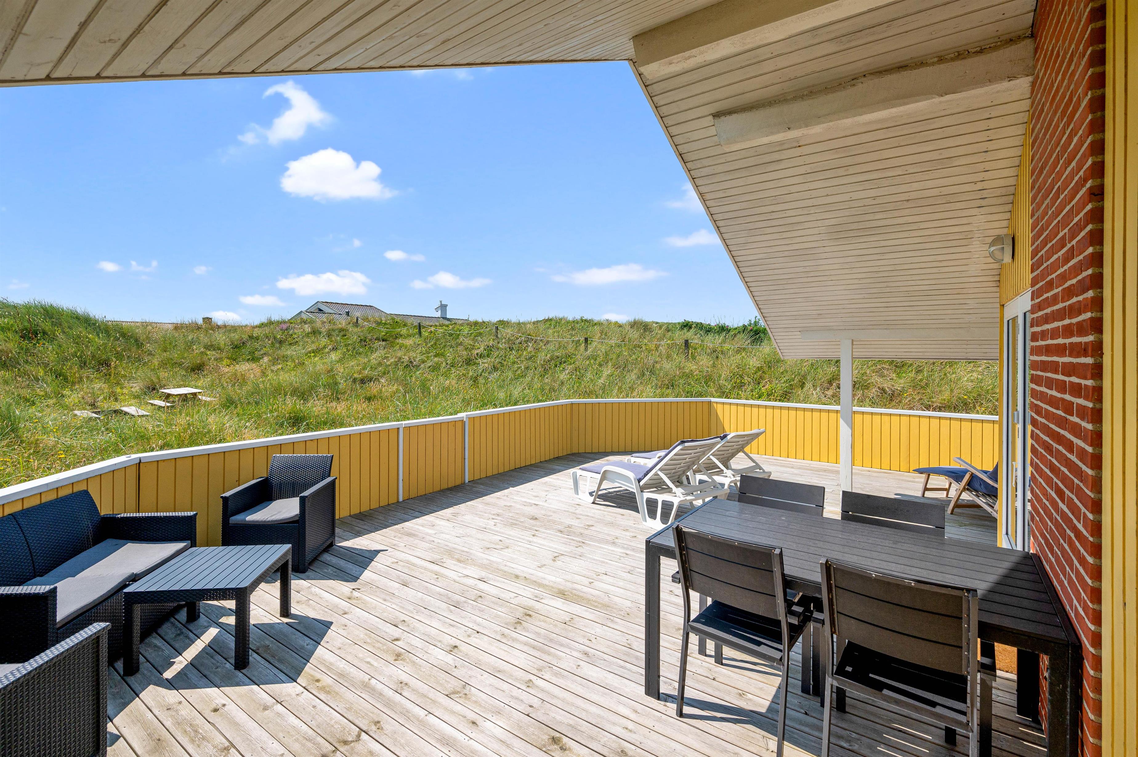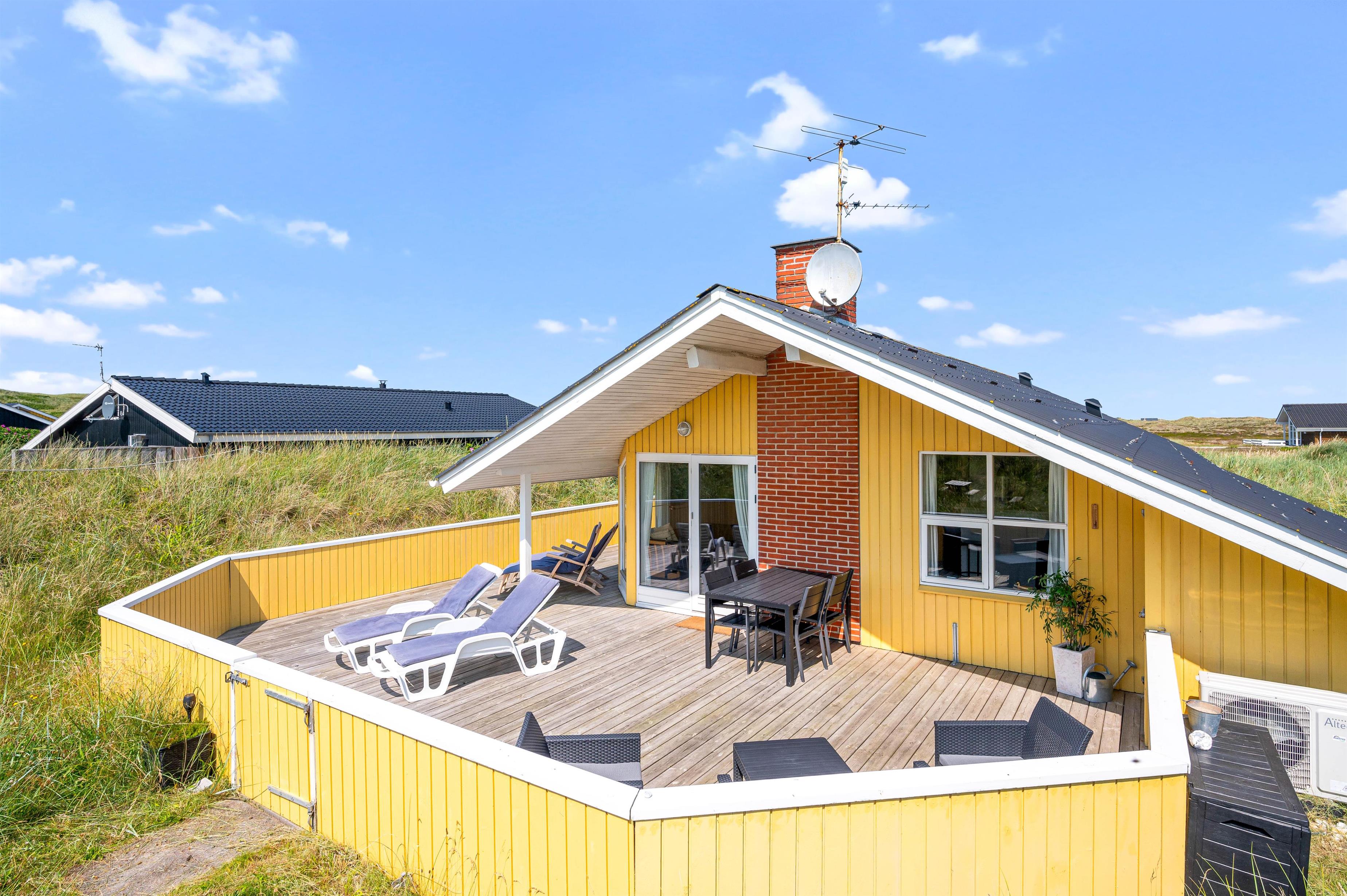 Dejlig lyst feriehus, med en helt særlig beliggenhed. På den ugenerte, delvist overdækkede terrasse mod syd giver klitterne på den kuperede naturgrund mulighed for en lækker afslappet ferie med base det fri.