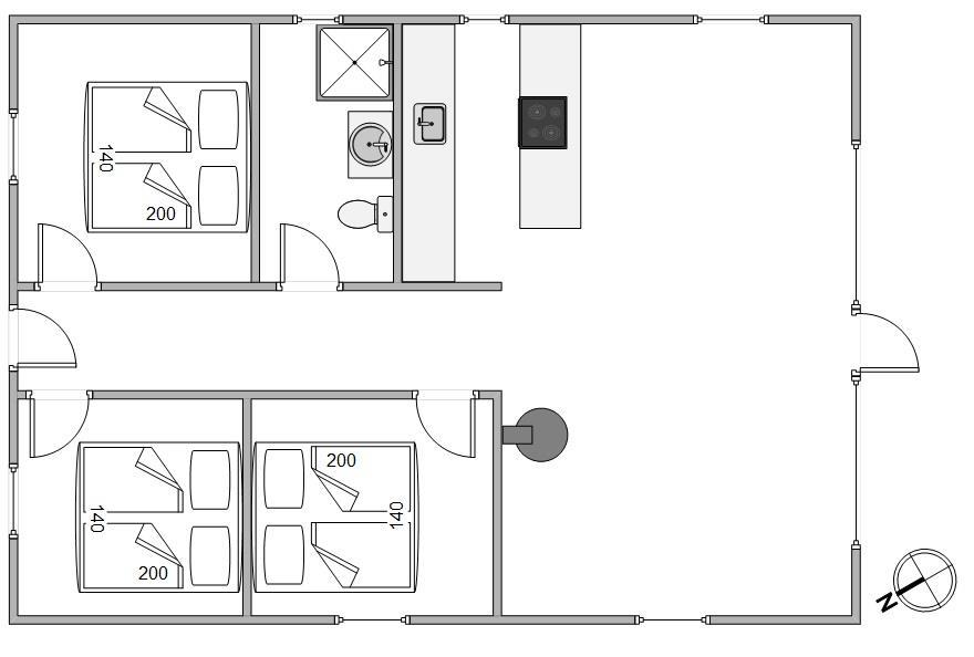 Det hyggelige sommerhus med synlige bjælker rummer 3 soveværelser med plads til i alt 6 personer. Der er varmepumpe installeret. Feriehuset har en åben køkkenafdeling ind mod stue med spiseplads, rummeligt sofaafsnit og brændeovn, samt udgang til afskærmet terrasse. Her kan I nyde morgenmaden eller slappe af i en stille stund.