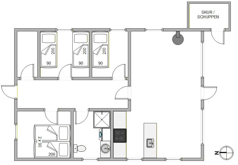 Feriehuset er til 5 personer, fordelt på 3 soverum – og I finder naturligvis en vaskemaskine i sommerhuset, hvilket nok især glæder småbørnsfamilierne.