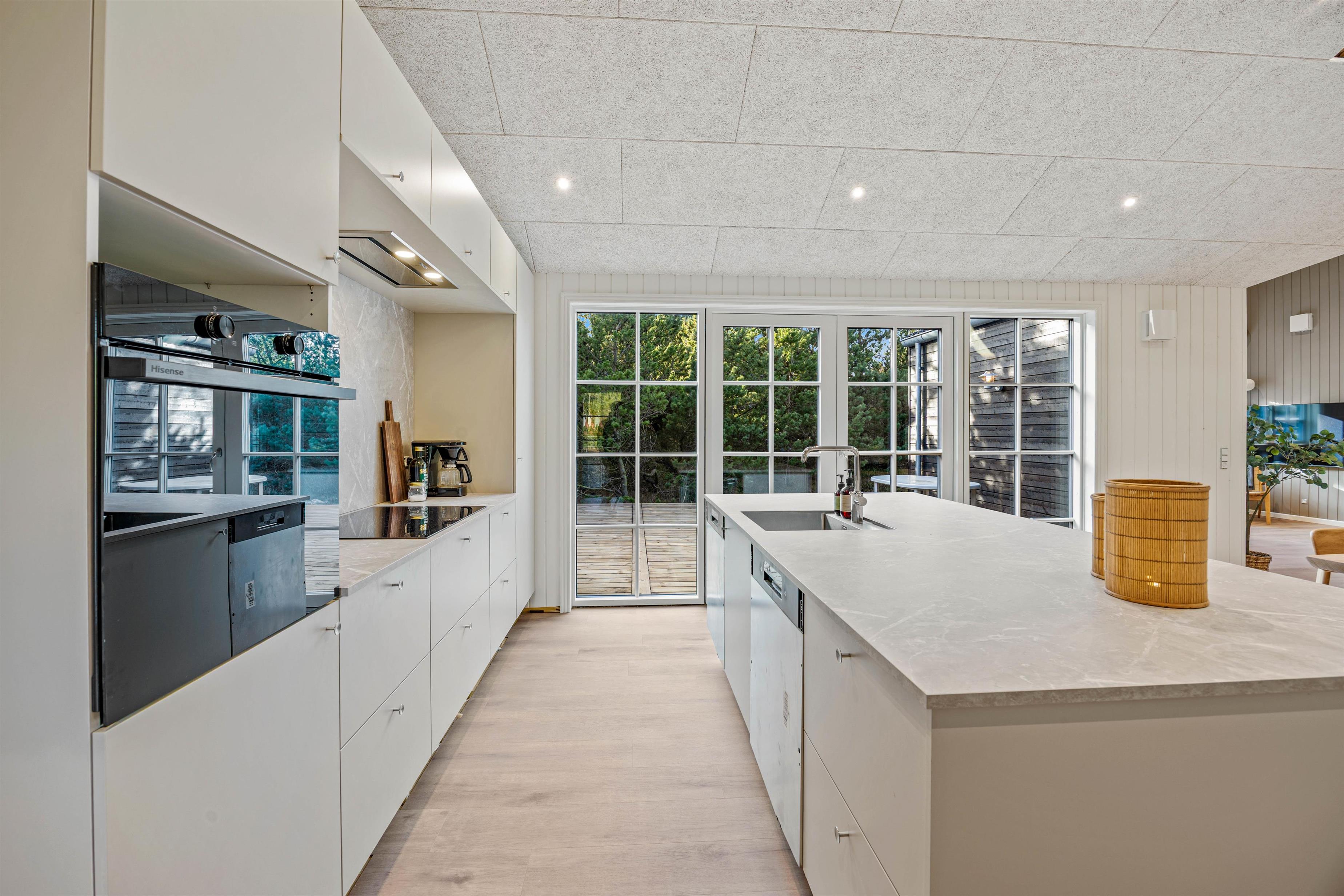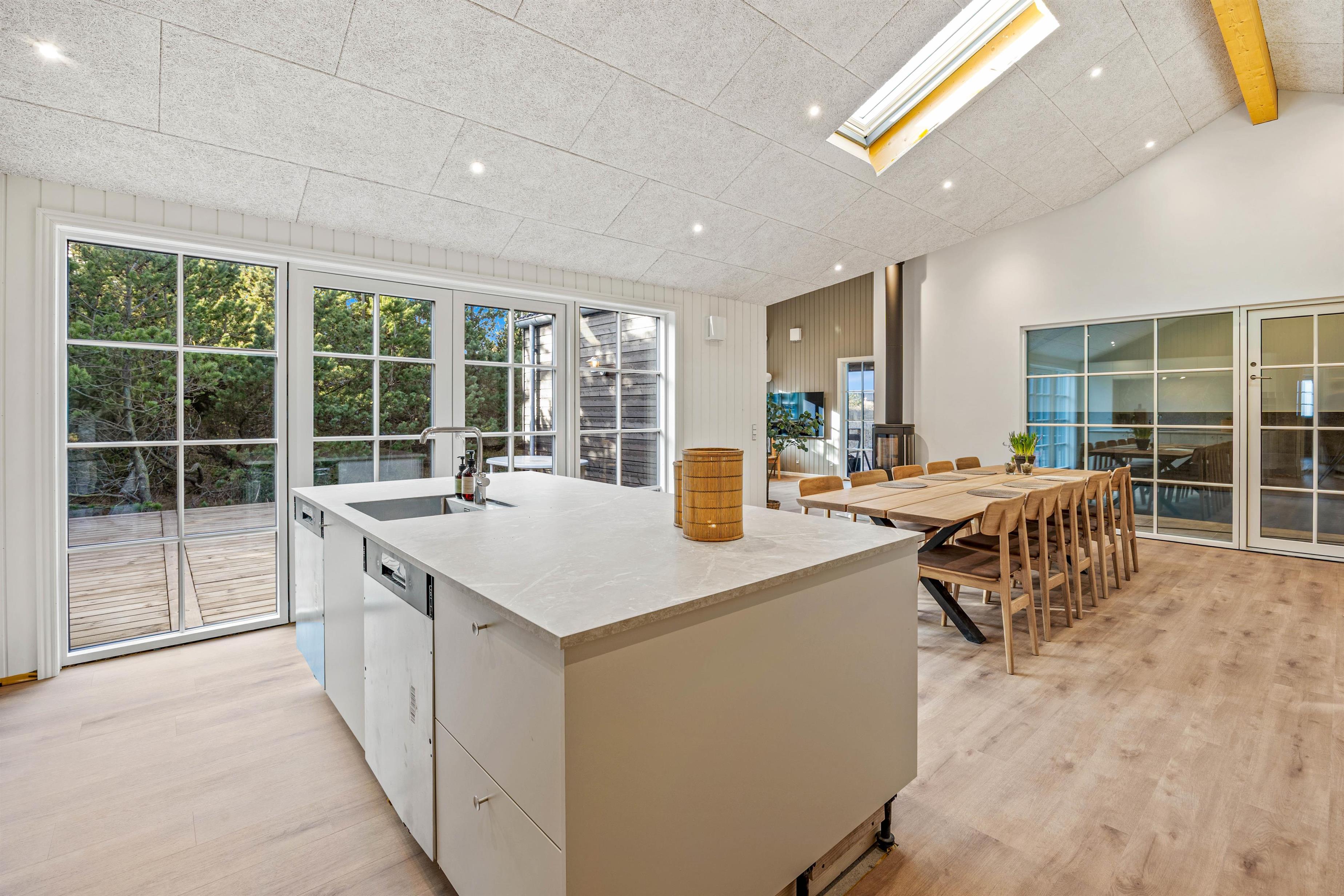 Sommerhuset på Bjerregårdsvej 189 er bygget i 2025 og har med sine 180 kvadratmeter god plads til 10 personer. Indretningen er moderne og holdt i rolige og lyse nuancer. Her er et stort åbent køkkenalrum med et veludstyret køkken med 2 køleskabe og 2 opvaskemaskiner. stue og spiseplads i ét – centralt i rummet står den knitrende hyggelige brændeovn. Her er god plads til hyggeligt samvær – uanset om det er afslapning på sofaen, tilberedning af lækre måltider eller hyggelige brætspilsaftner. Med et Chromecast kan I altid streame jeres yndlings-programmer, når det passer jer.